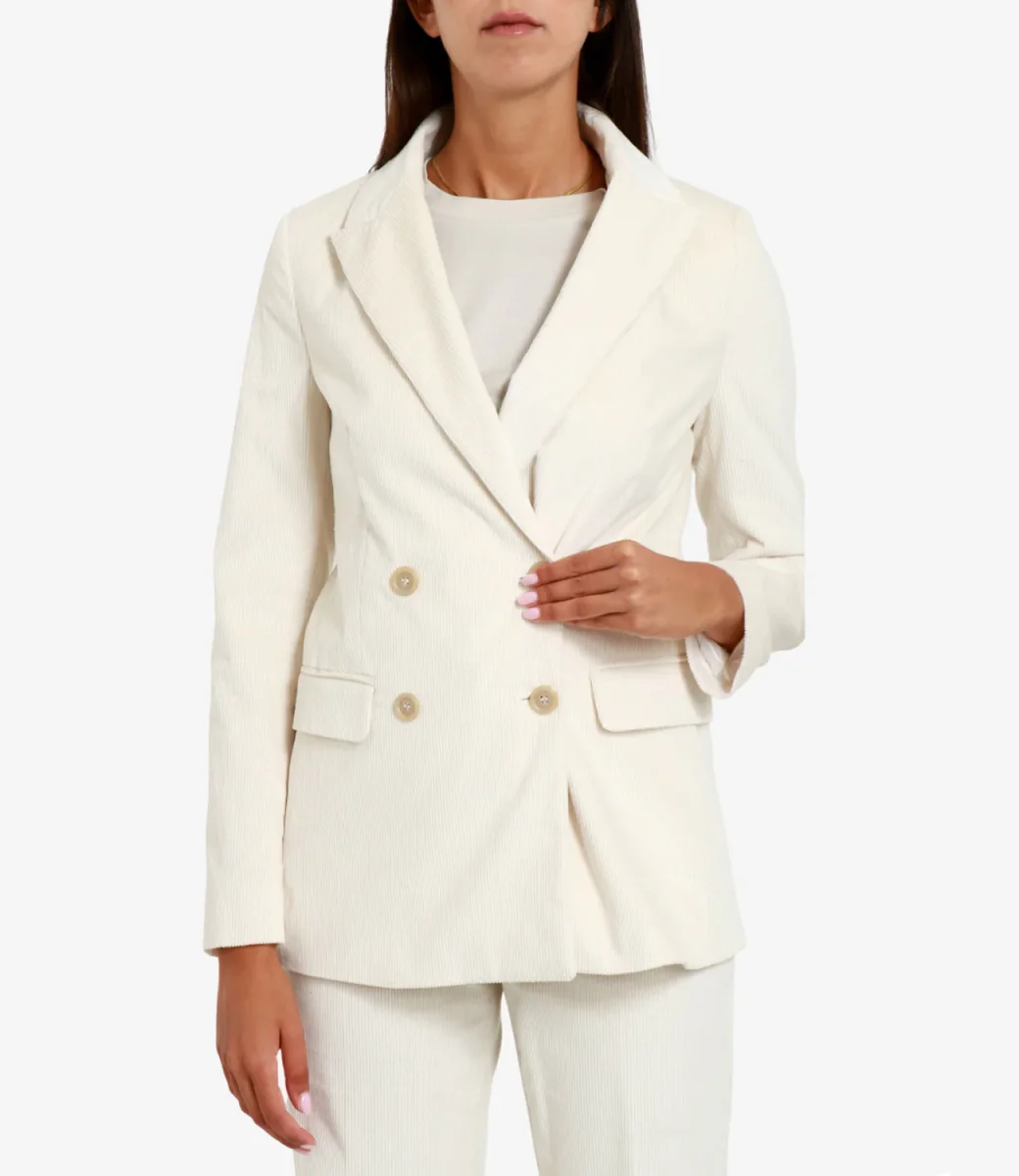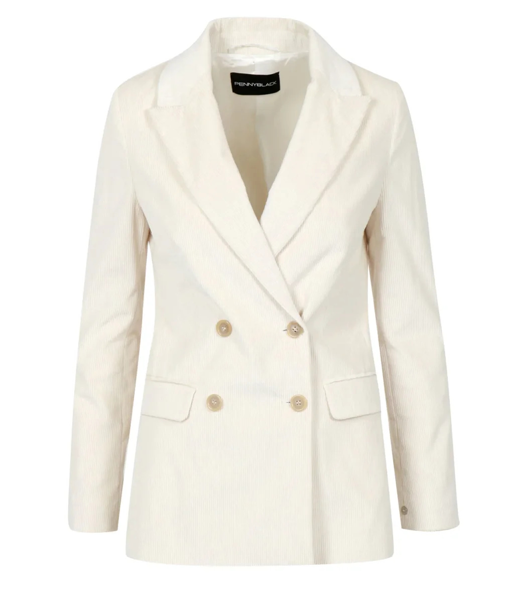 Giacca Pennyblack Calesse modello doppiopetto in velluto a coste stretch che unisce attitudine sportswear e taglio sartoriale.Fit morbido con spalle leggermente strutturate, revers a lancia e tasche a pattina. Da abbinare ai pantaloni coordinati o in mix and match.