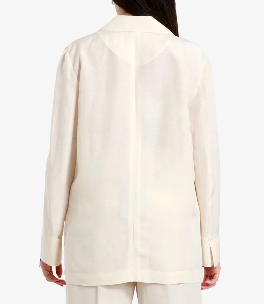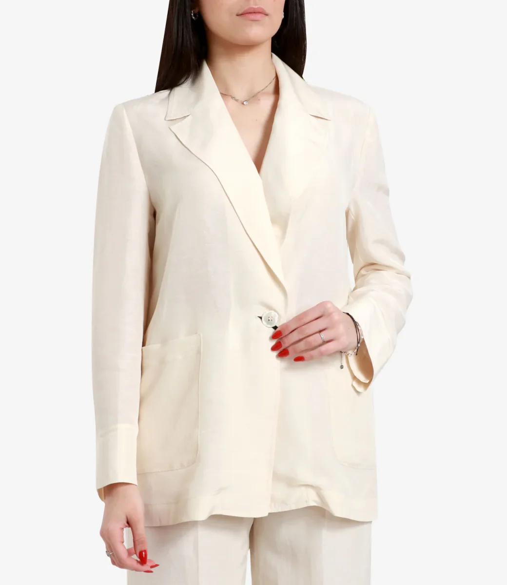 Dettagli:– Misto lino– Maniche lunghe – Chiusura mono petto– Tasche