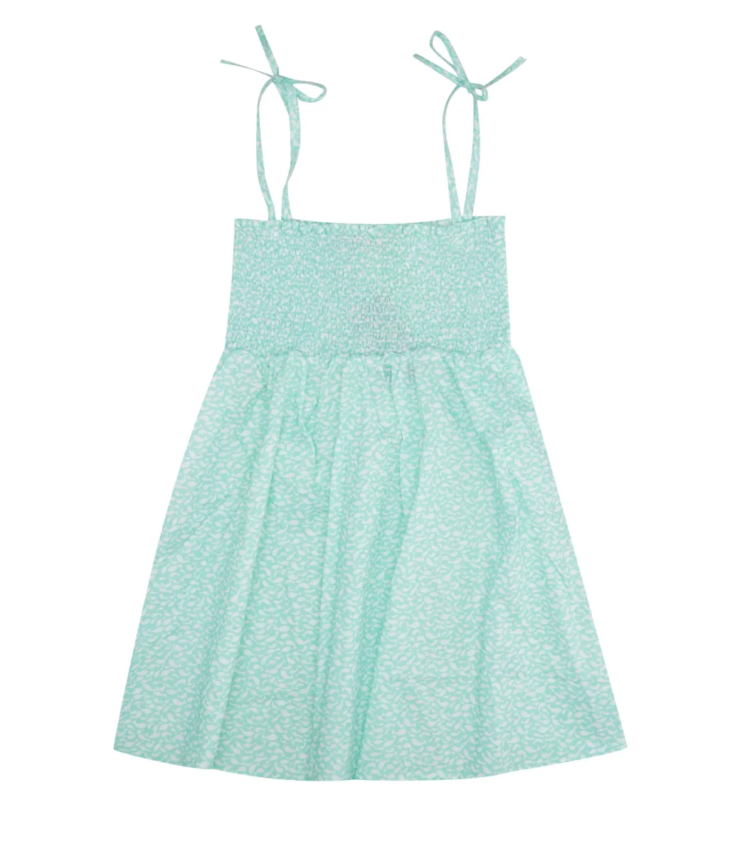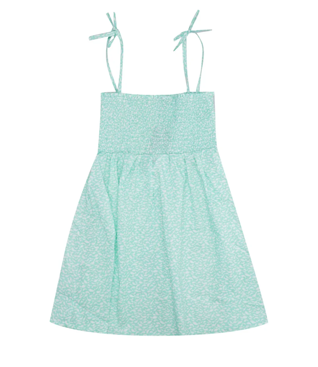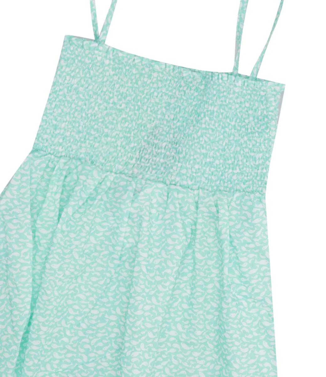 Abito Pesciolino Rosso Beachwear in cotone verde acqua con bretelline, fascia elasticizzata e stampa pesciolini.