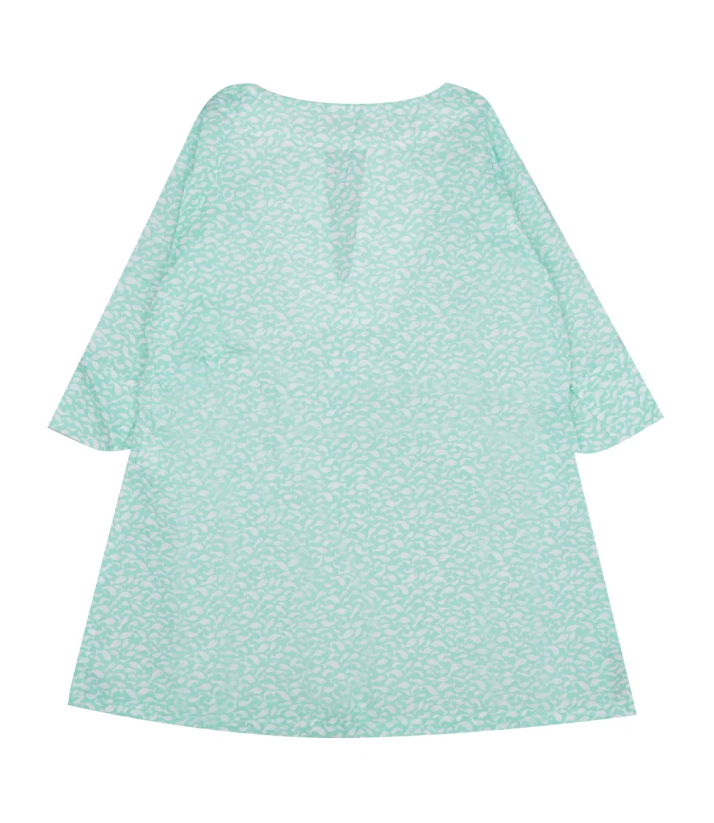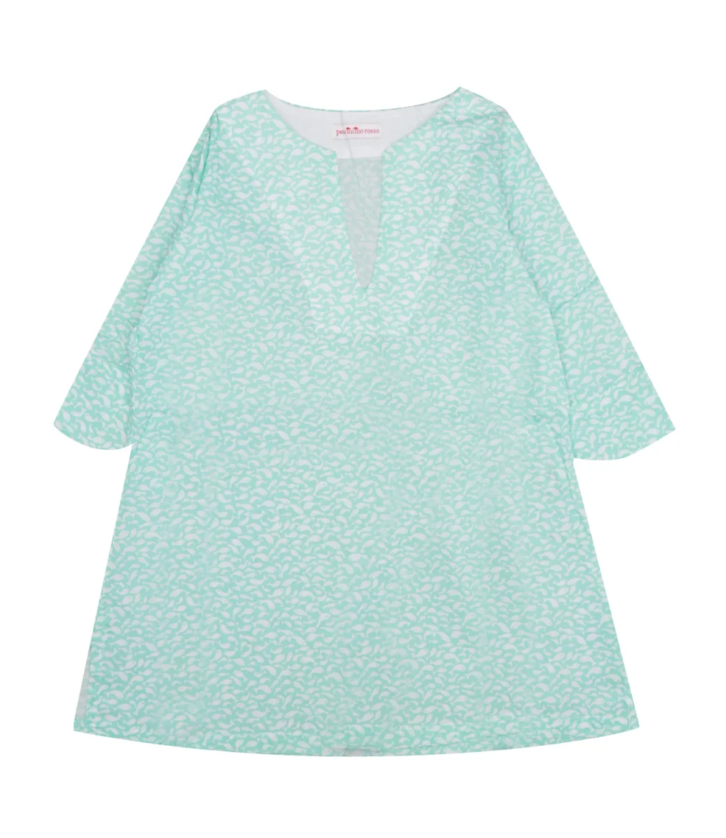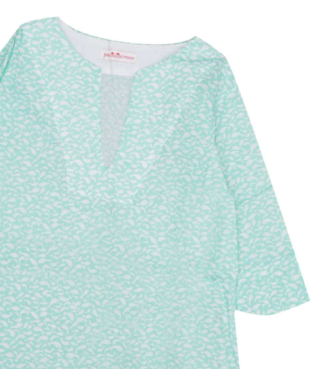 Caftano Pesciolino Rosso Beachwear in corone liberty verde acqua con scollo a V, manica 3/4, orlo con spacchi laterali e fantasia pesciolini.