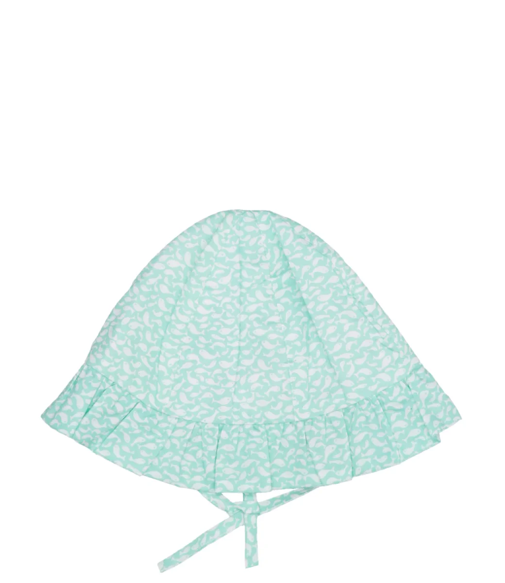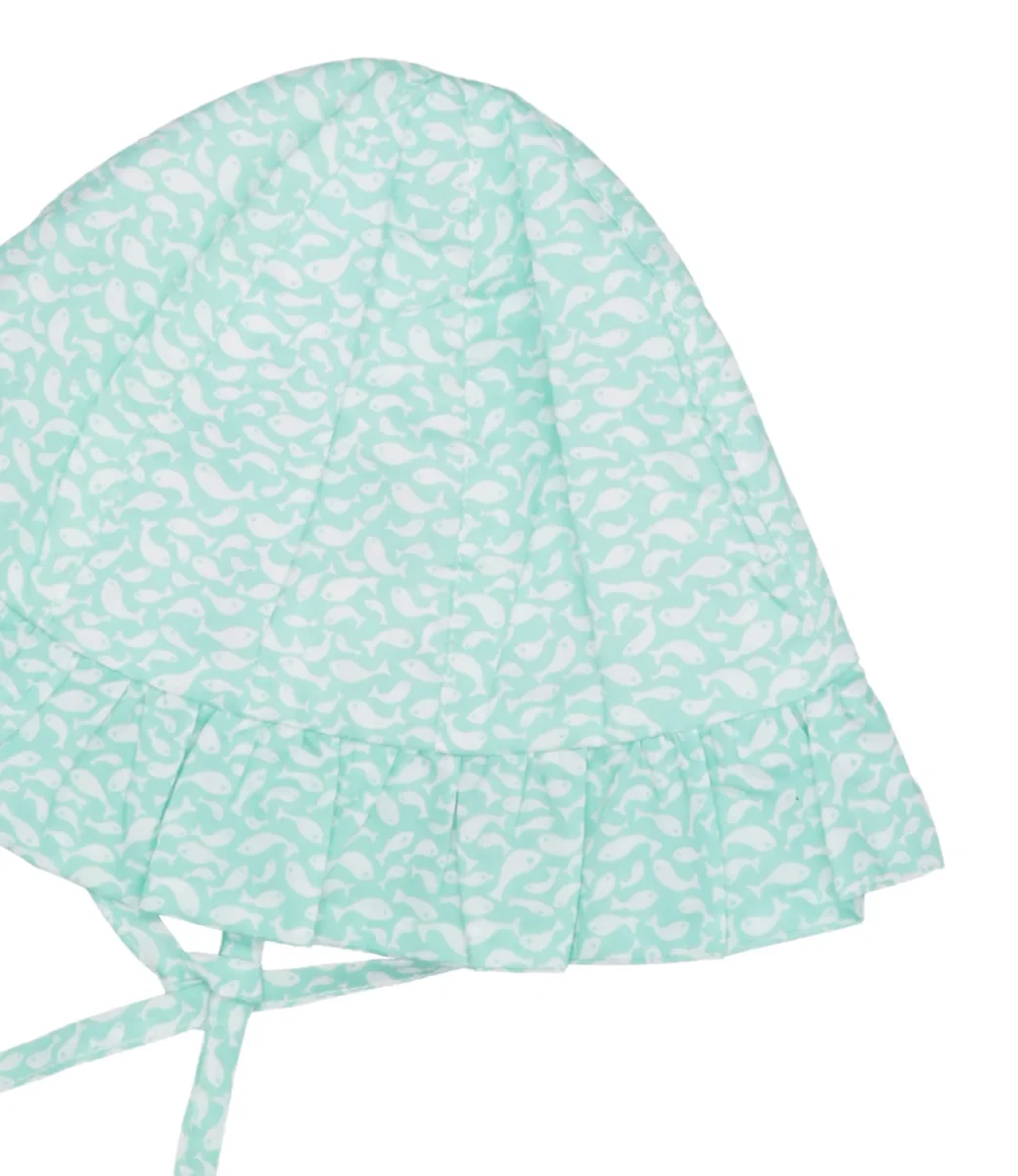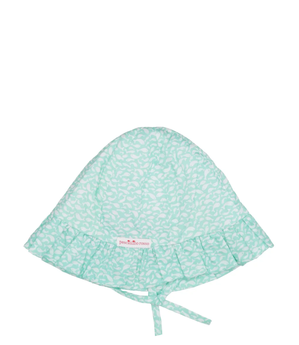 Cappello Pesciolino Rosso Beachwear in cotone liberty verde acqua con rouches, laccetti e stampa pesciolini.