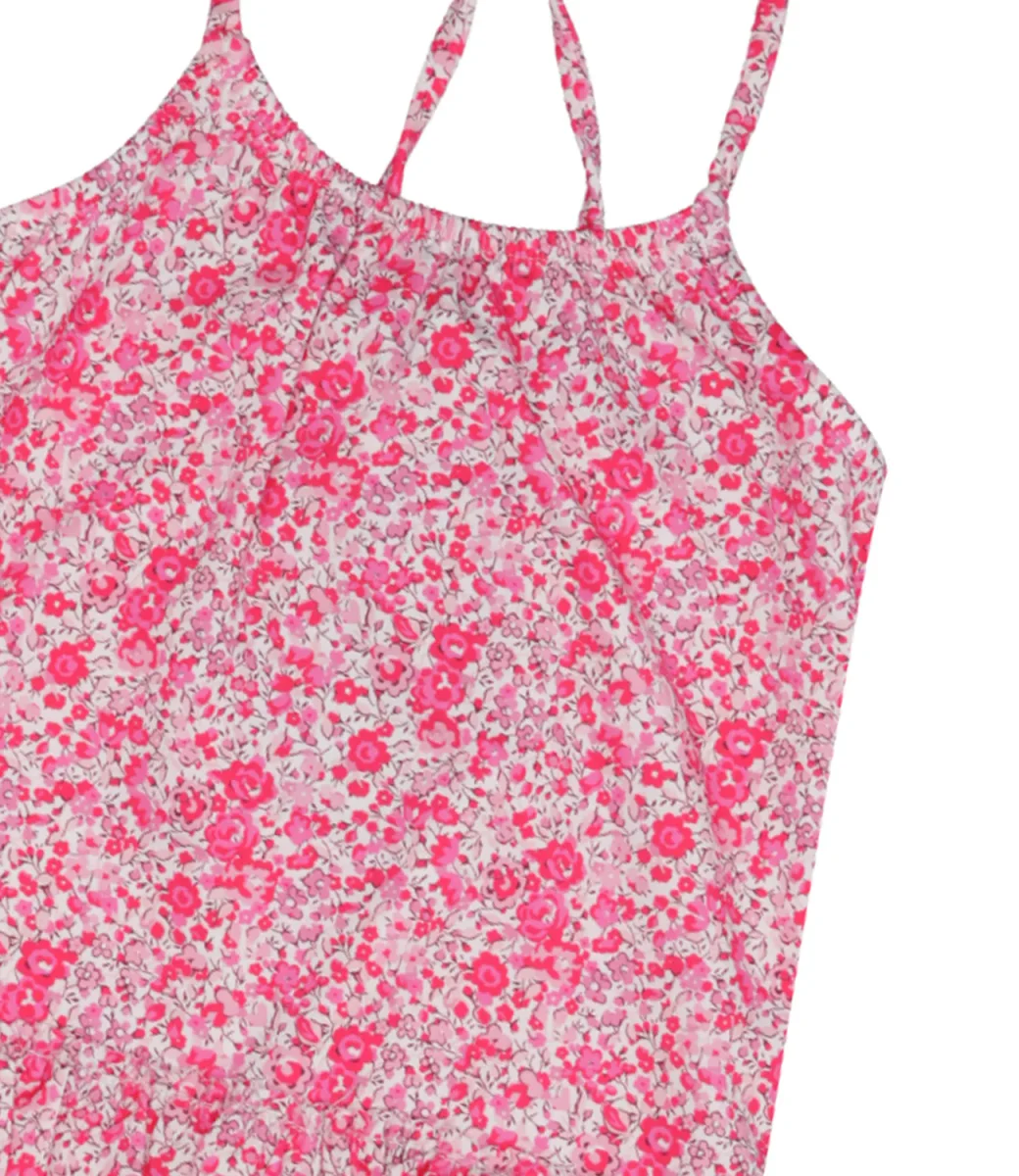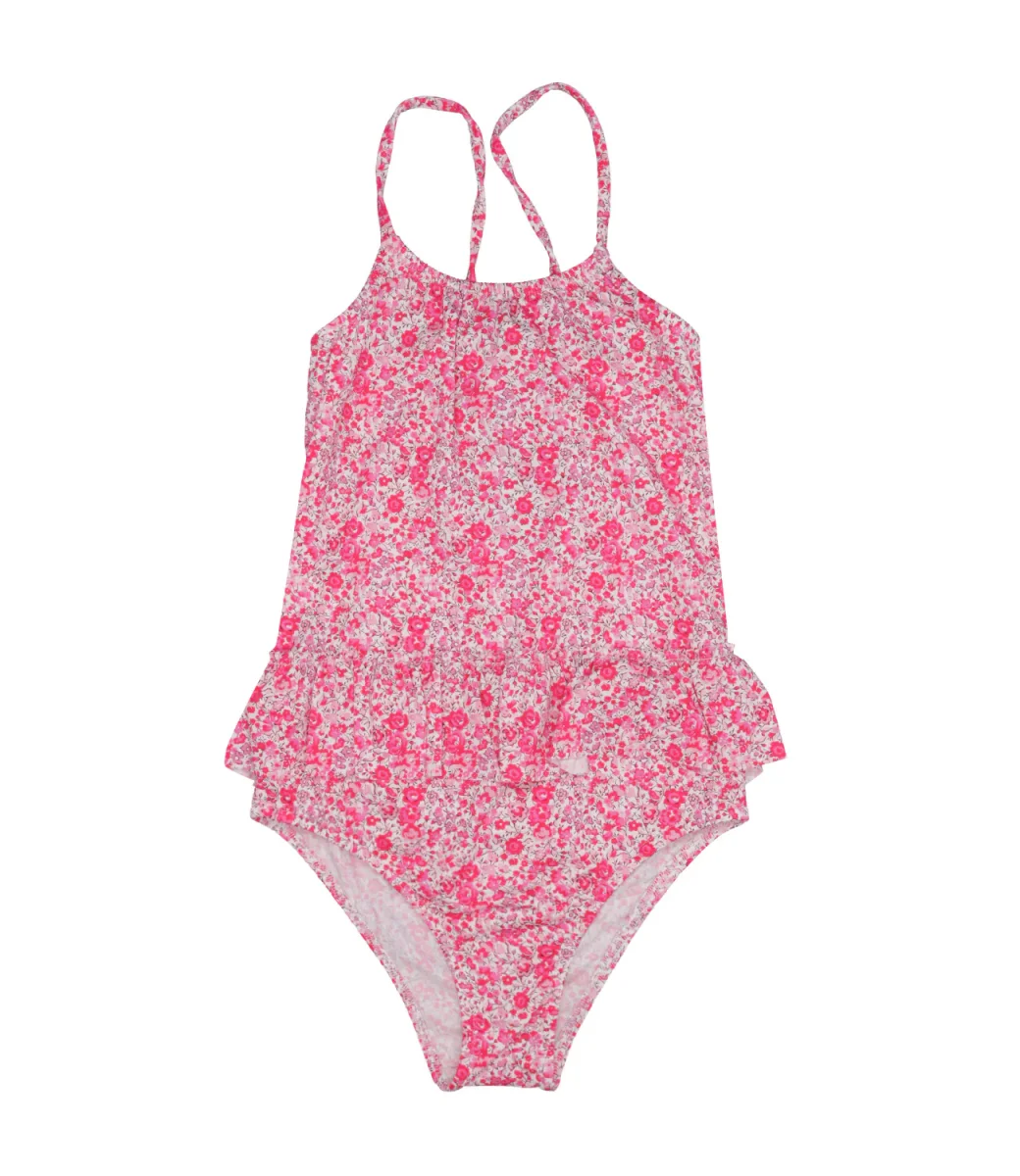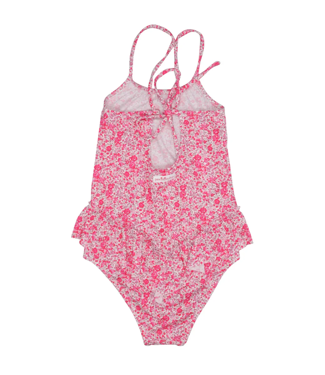 Costume intero Pesciolino Rosso Beachwear in lycra con fantasia floreale, modello intero con balza in vita, chiusura posteriore ad incrocio con laccetti.