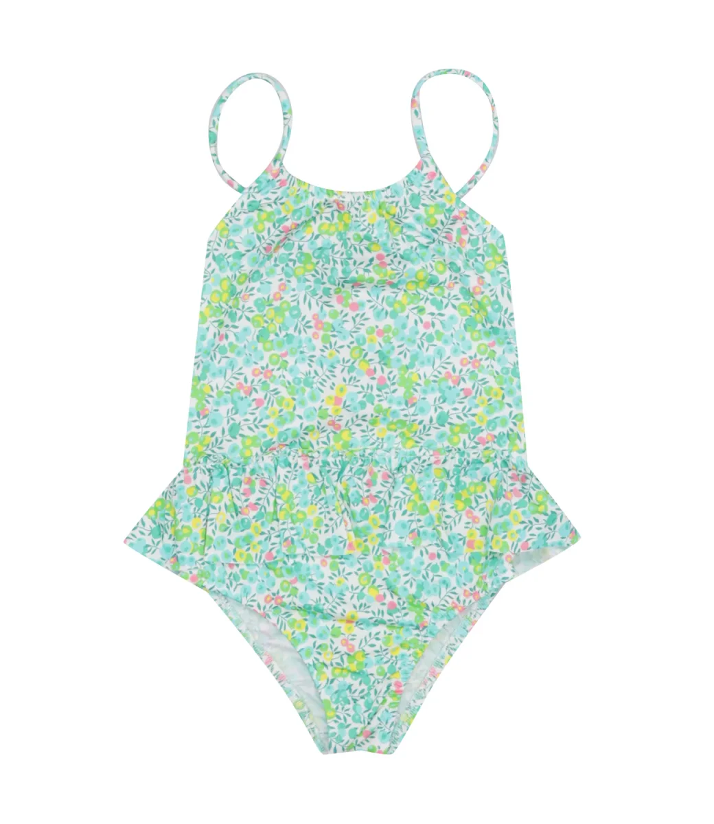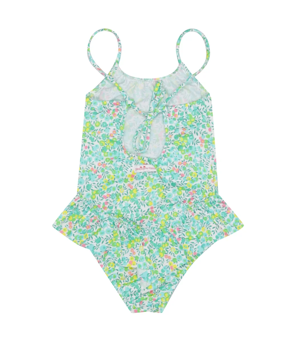 Costume intero Pesciolino Rosso Beachwear in lycra bianca e verde, balza in vita, chiusura posteriore ad incrocio con laccetti, fantasia floreale.