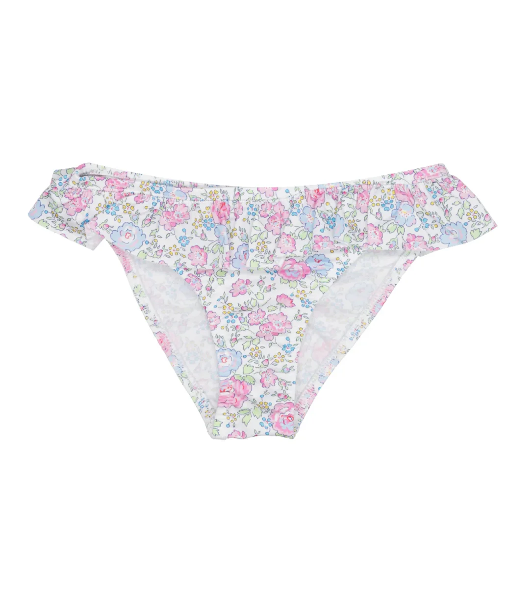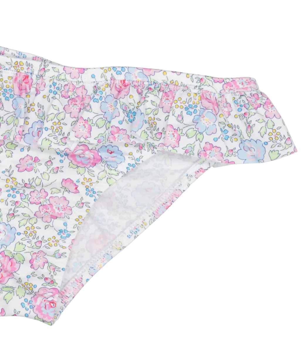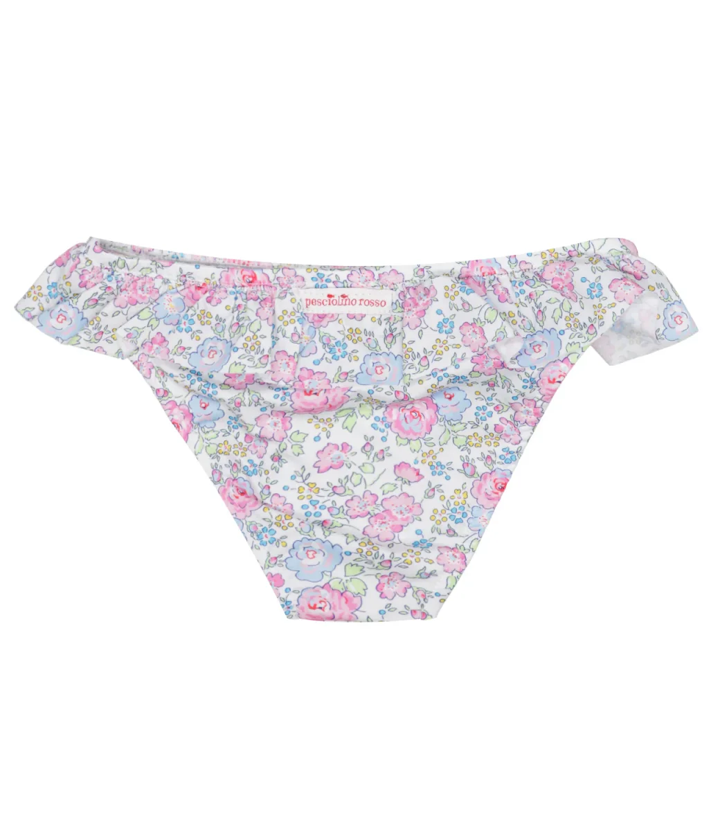 Costume slip Pesciolino Rosso Beachwear in lycra bianco, rosa e azzurro con balza e fantasia floreale.