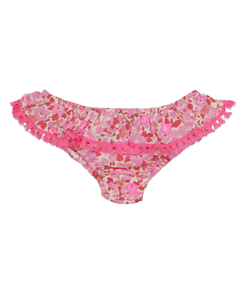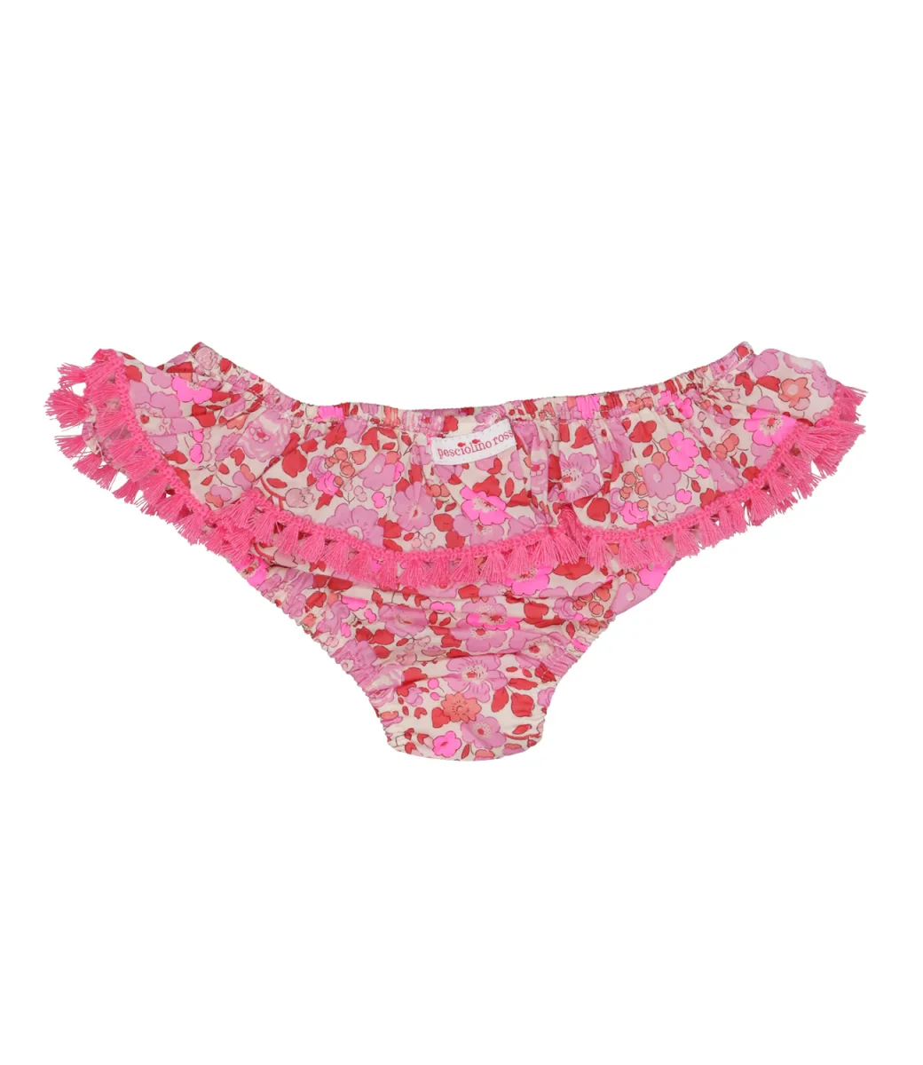 Costume slip Pesciolino Rosso Beachwear in lycra con fantasia floreale, modello con balza in vita e ricamo con frange sul profilo.