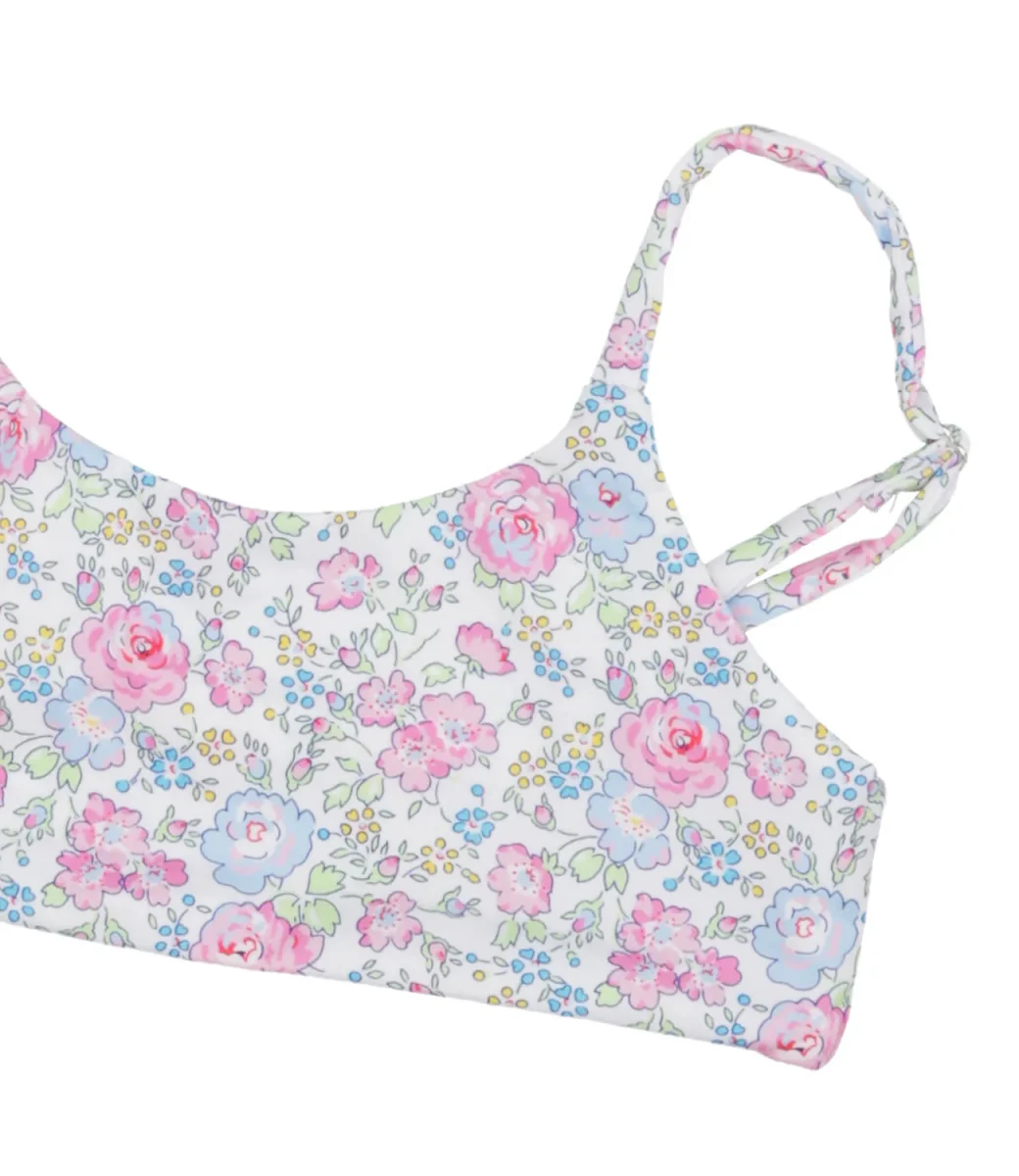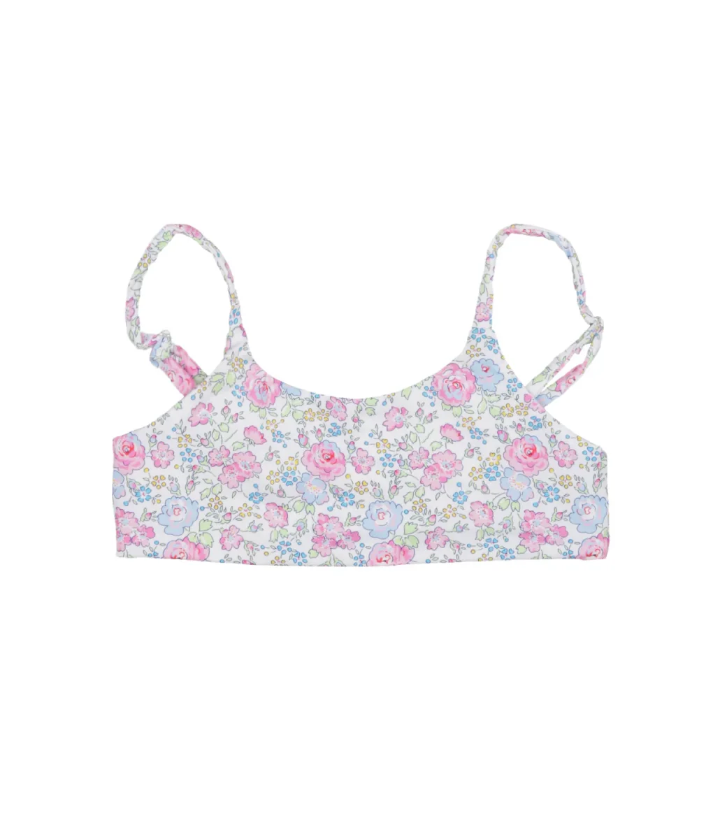 Costume top Pesciolino Rosso Beachwear in lycra bianco, rosa e azzurro con bretelline regolabili e stampa floreale.