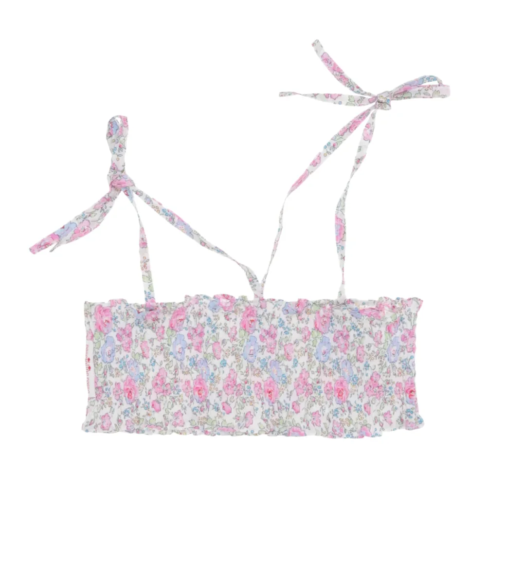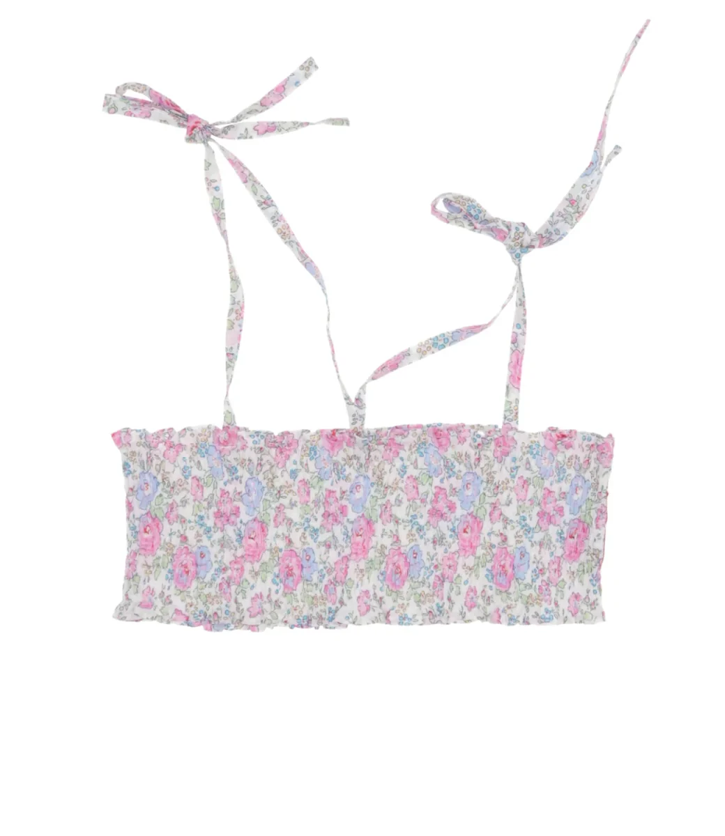 Top Pesciolino Rosso Beachwear in cotone liberty bianco,rosa ed azzurro con arricciatura elastica, bretelline regolabili con fiocco e stampa con fiori
