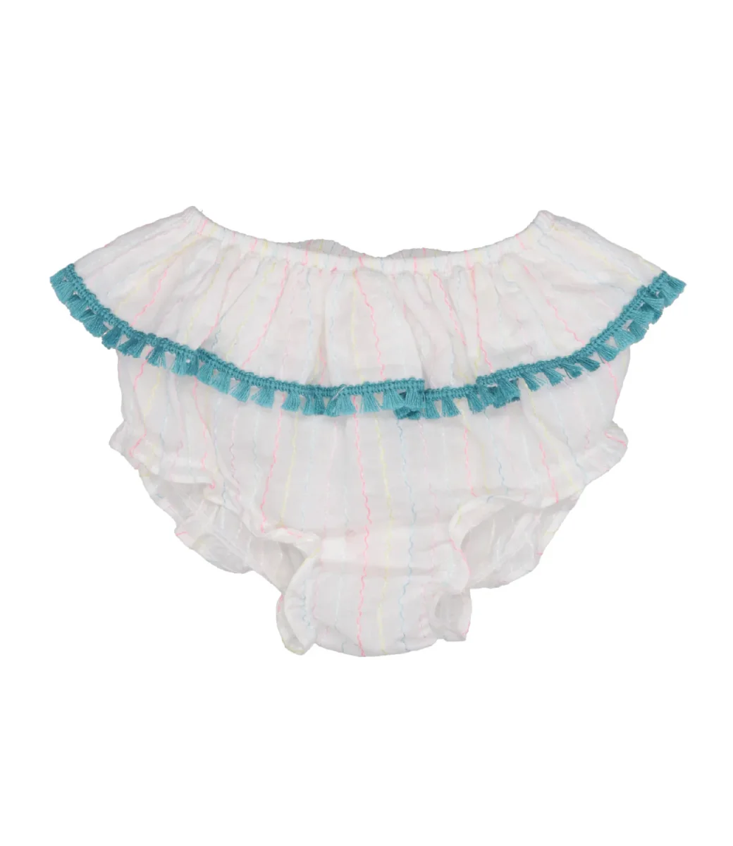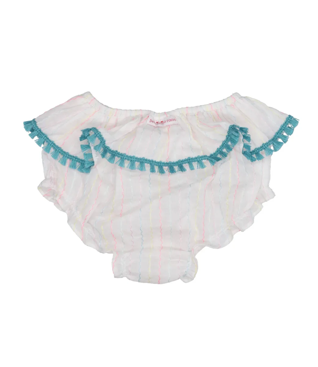 Coulotte Pesciolino Rosso Kids Beachwear in misto cotone, fantasia a righe. Modello con balza in vita e ricamo con frange sul profilo.
