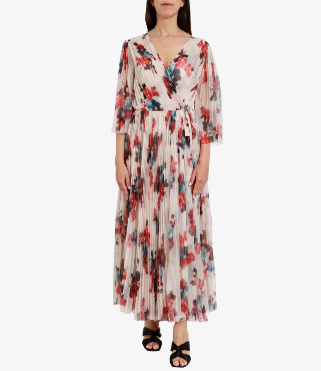 Abito Philosophy di Lorenzo Serafini realizzato in tulle con stampa con fiori all over. Design romantico dalle linee morbide in plissè.