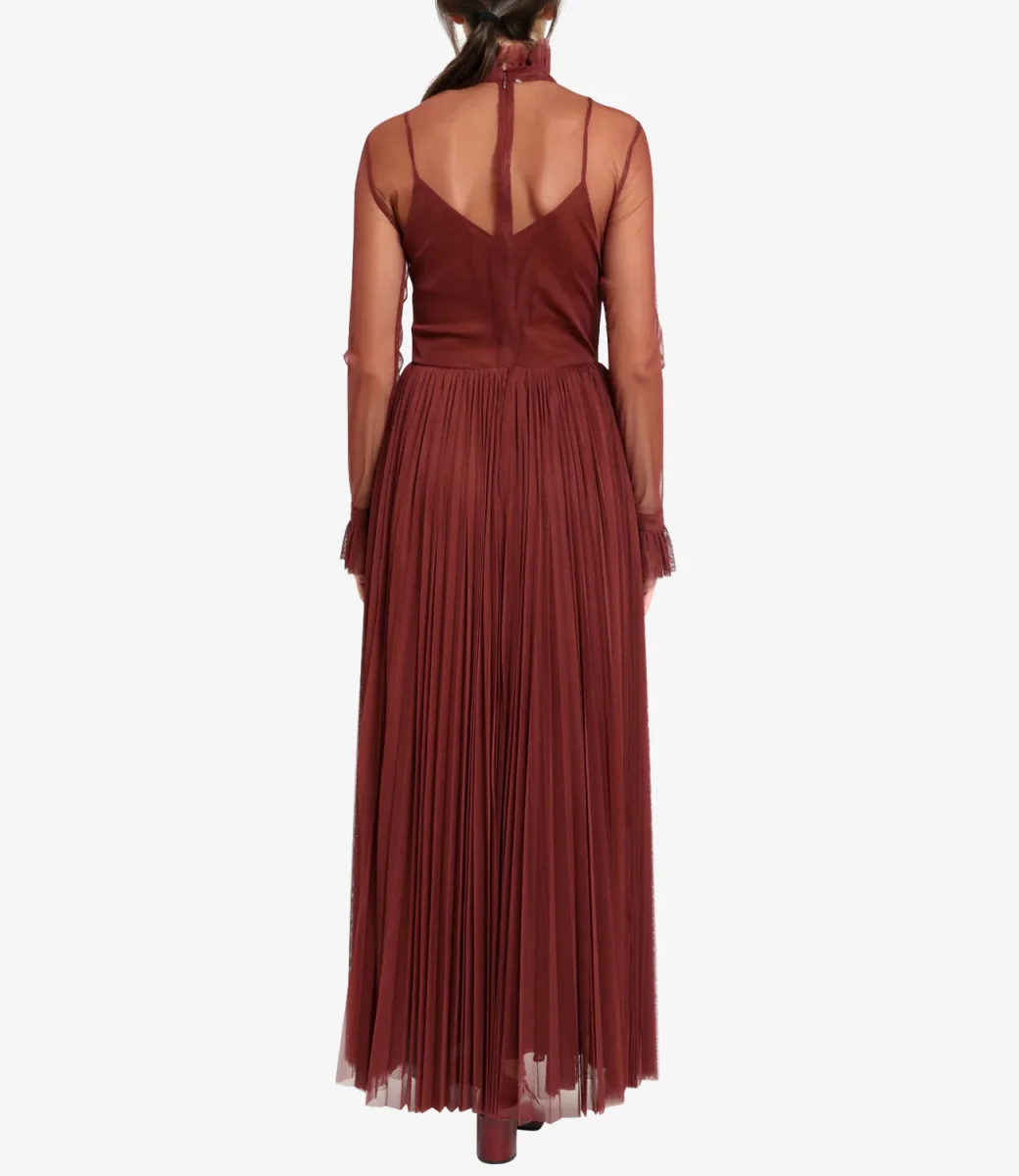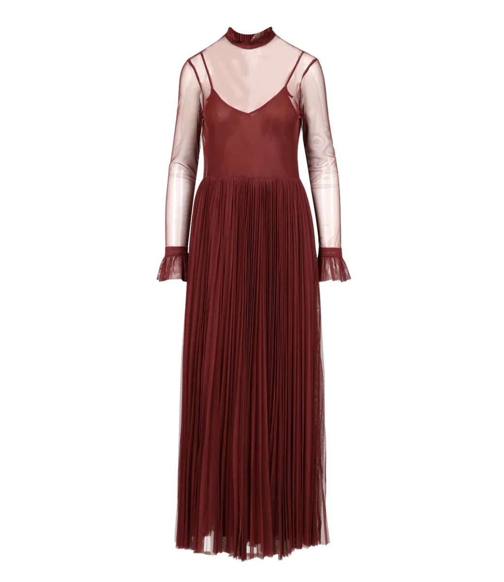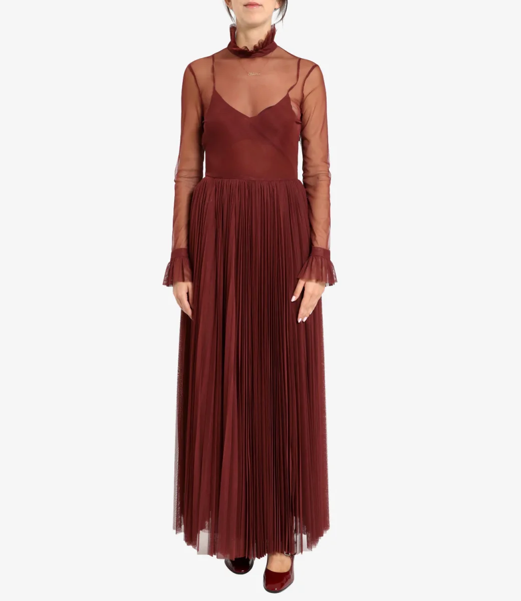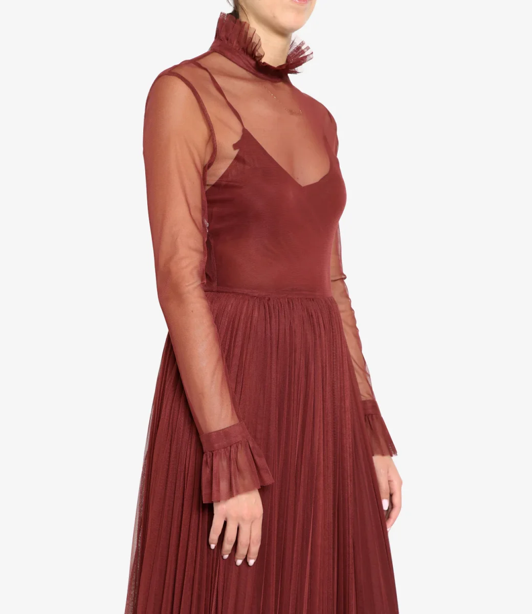 Abito Philosophy di Lorenzo Serafini in tulle con sottoveste in tinta e gonna plissettata. Le ruche al collo e ai polsi aggiungono un tocco romantico in pieno stile Philosophy.