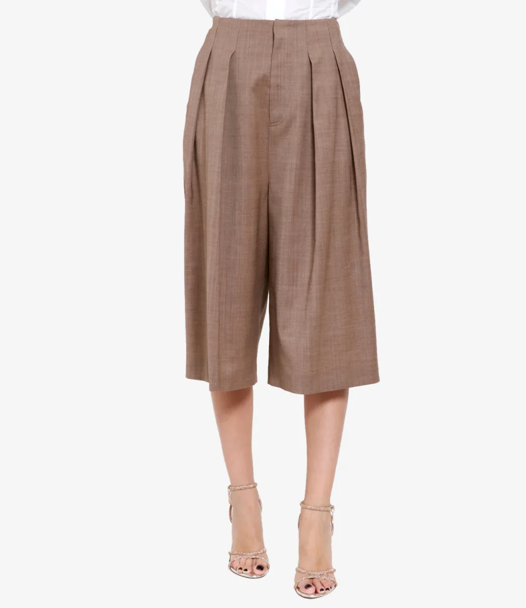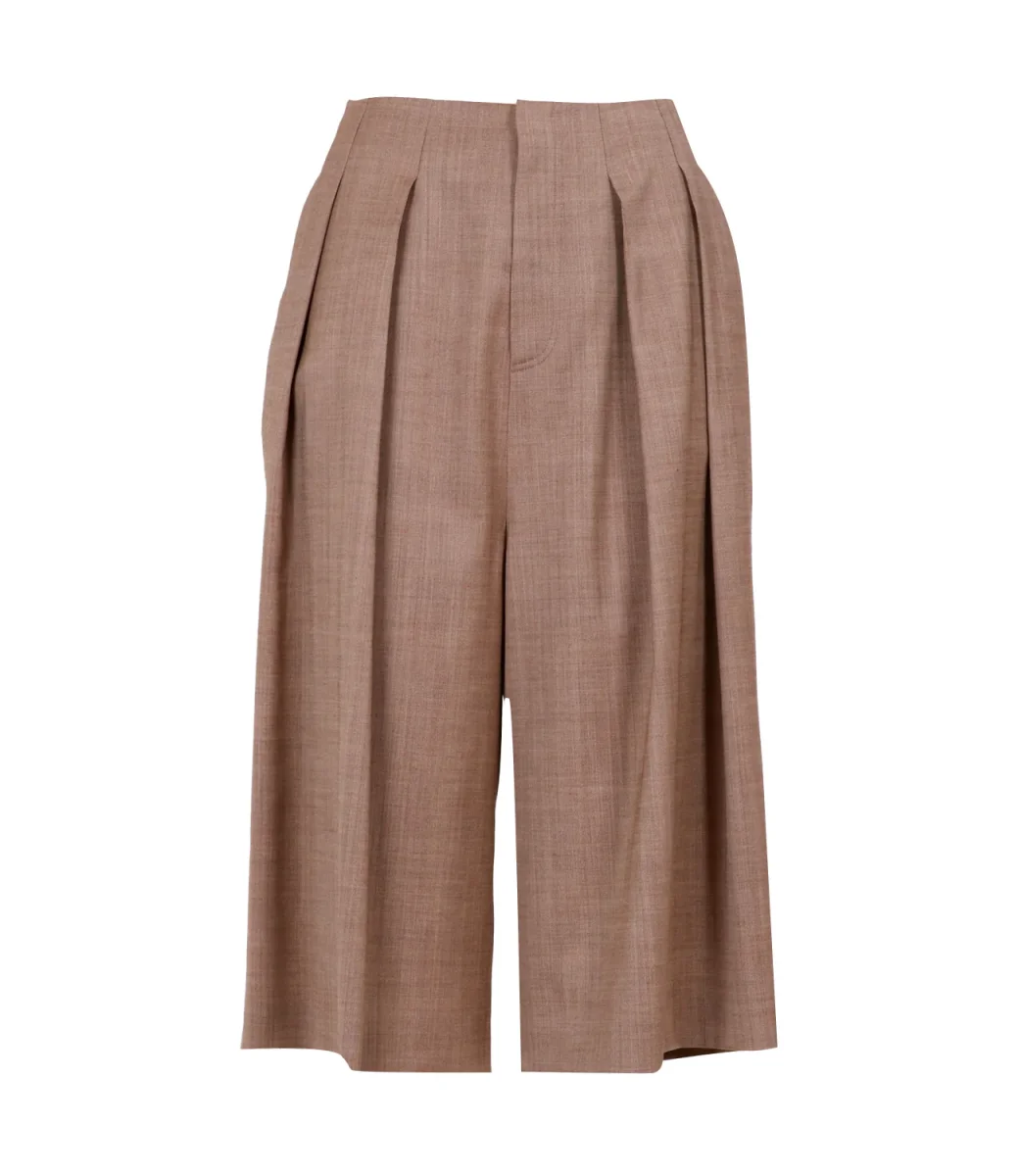 Bermuda Philosophy di Lorenzo Serafini in misto lana e lino, modello a vita alta dal taglio sartoriale con ampia sulla gamba dal design a pieghe larghe sul davanti. Un look che combina un casual chic in abbinamento al suo stesso gilet.