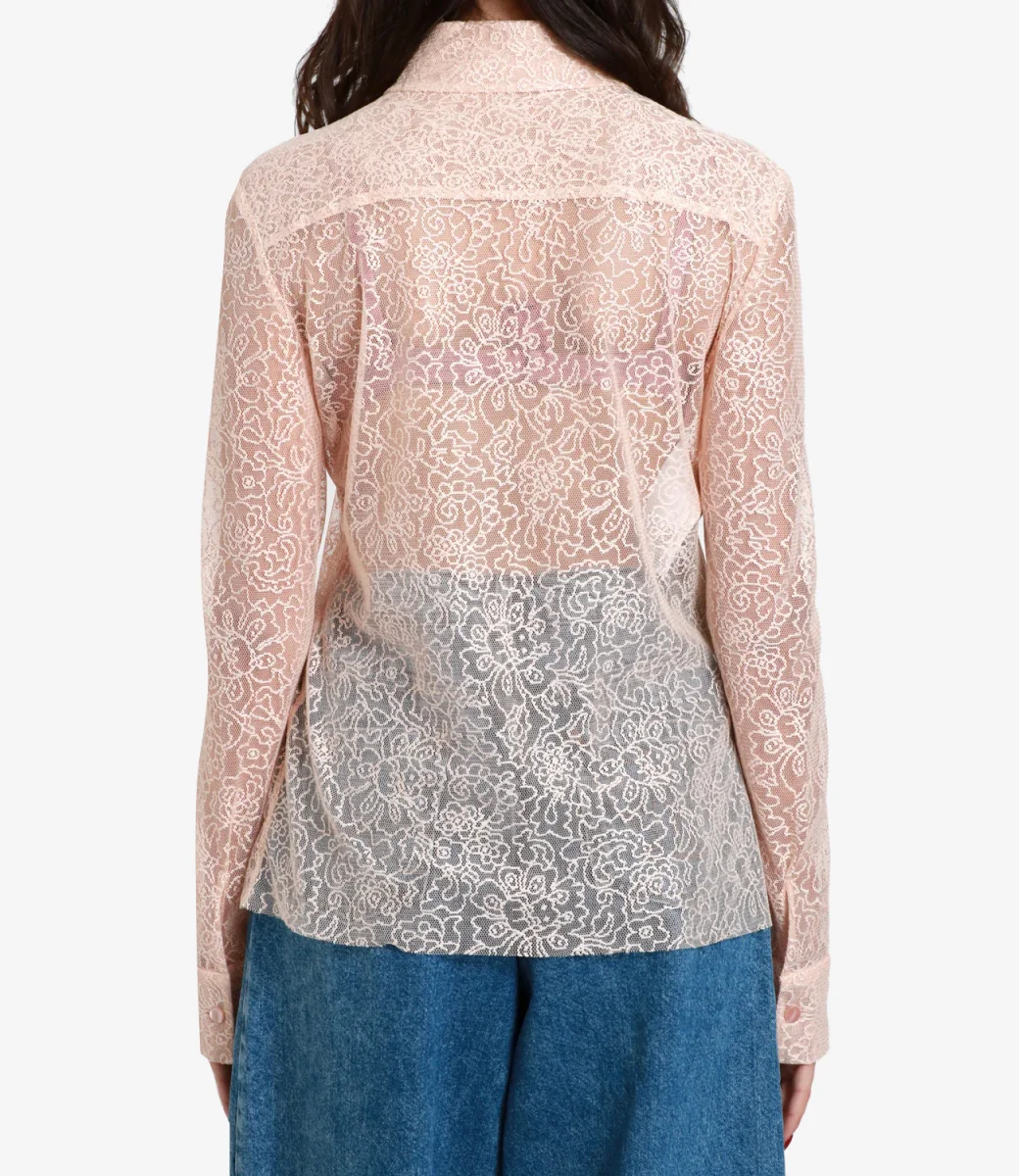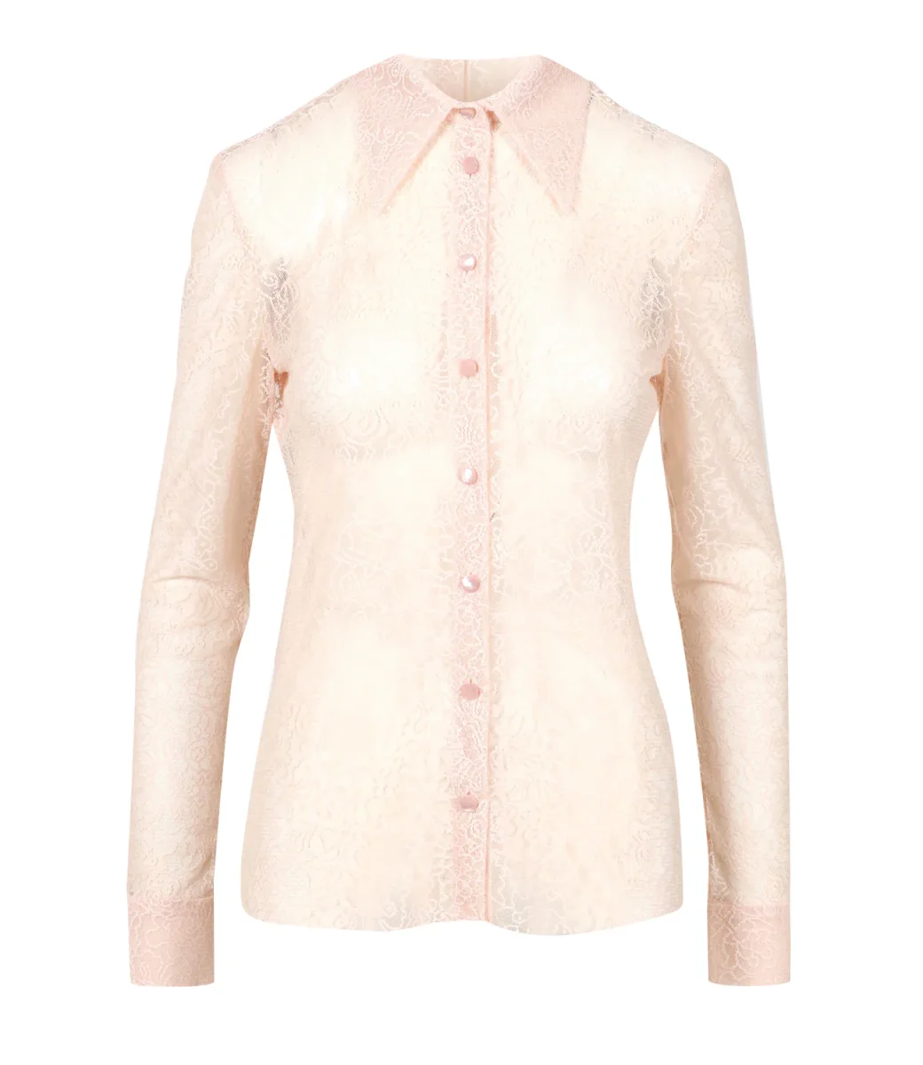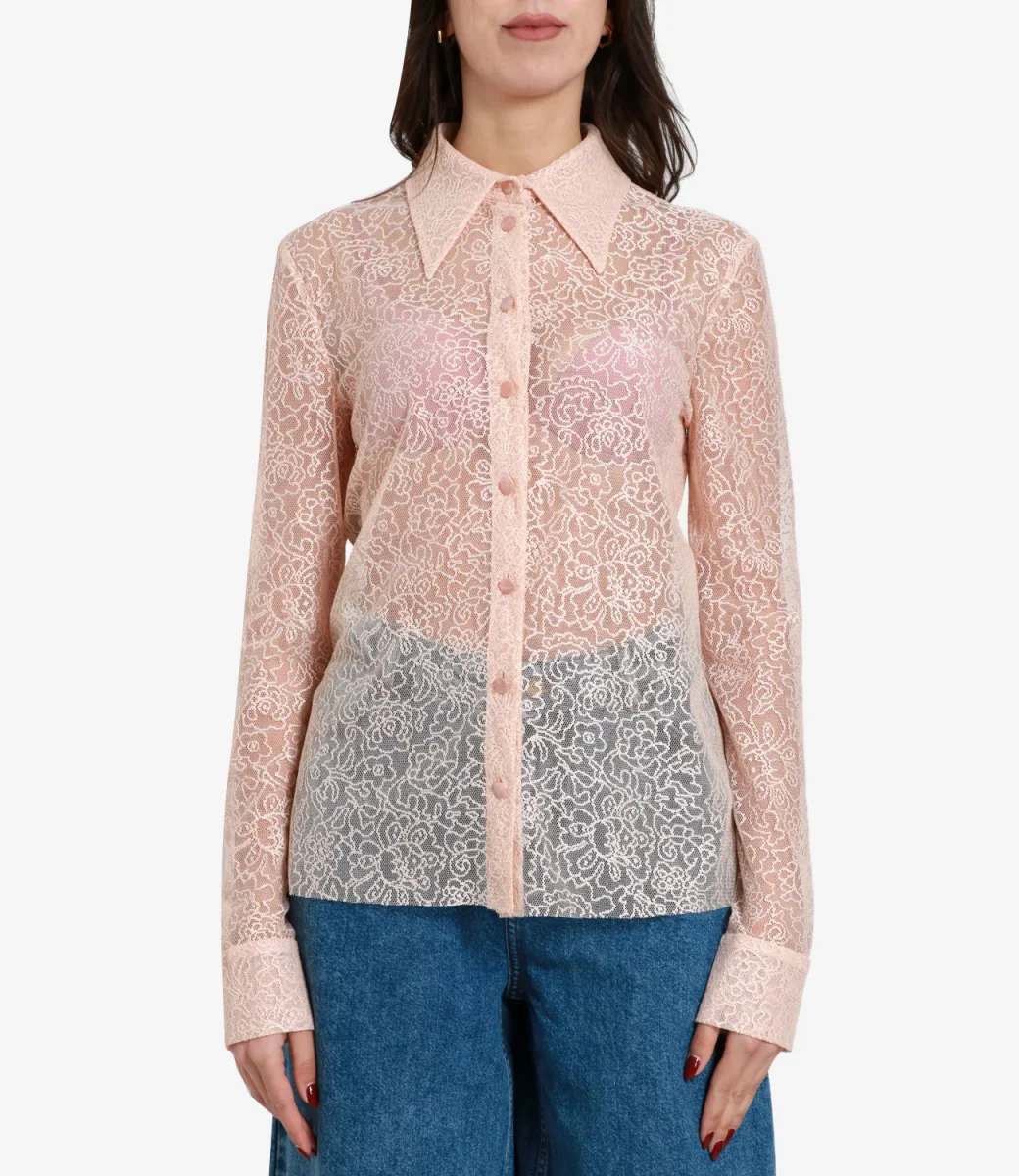 Camicia Philosophy di Lorenzo Serafini con colletto, maniche lunghe, chiusura con bottoni e ricamo all over. La modella è alta 1.75m ed indossa una 40.