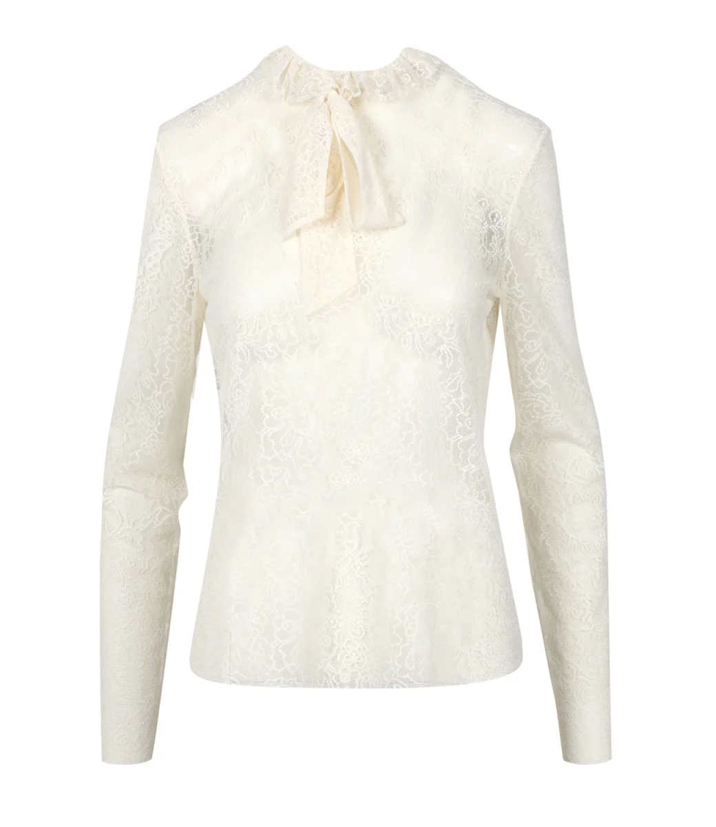 Camicia Philosophy di Lorenzo Serafini con fiocco sul collo e ricamo all over. La modella è alta 1.75m ed indossa una 40.