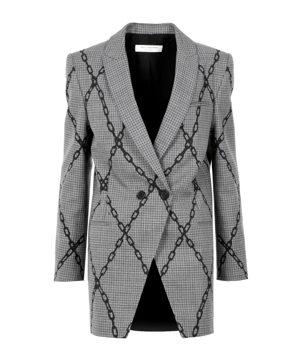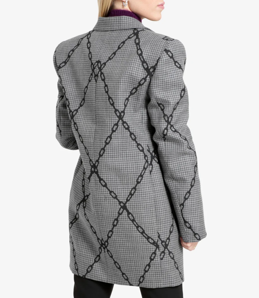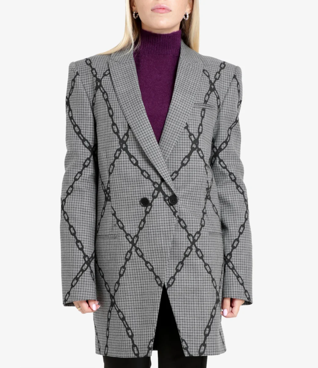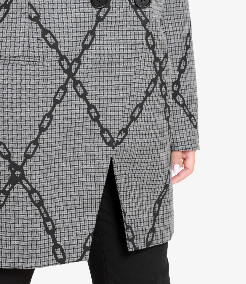 Blazer grigio con stampa con catene, motivo a quadri e chiusura frontale con bottoni.