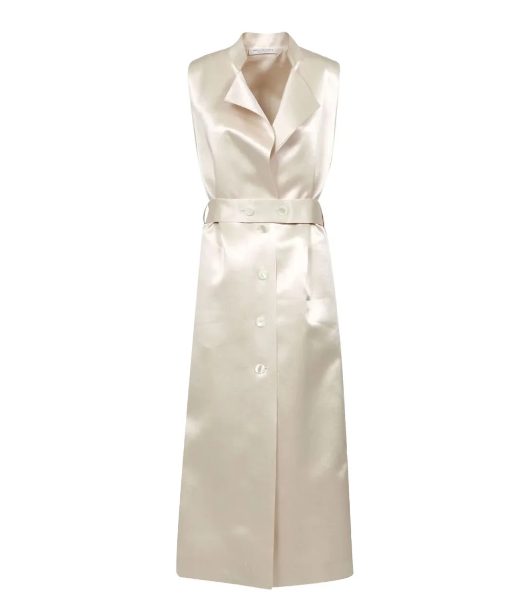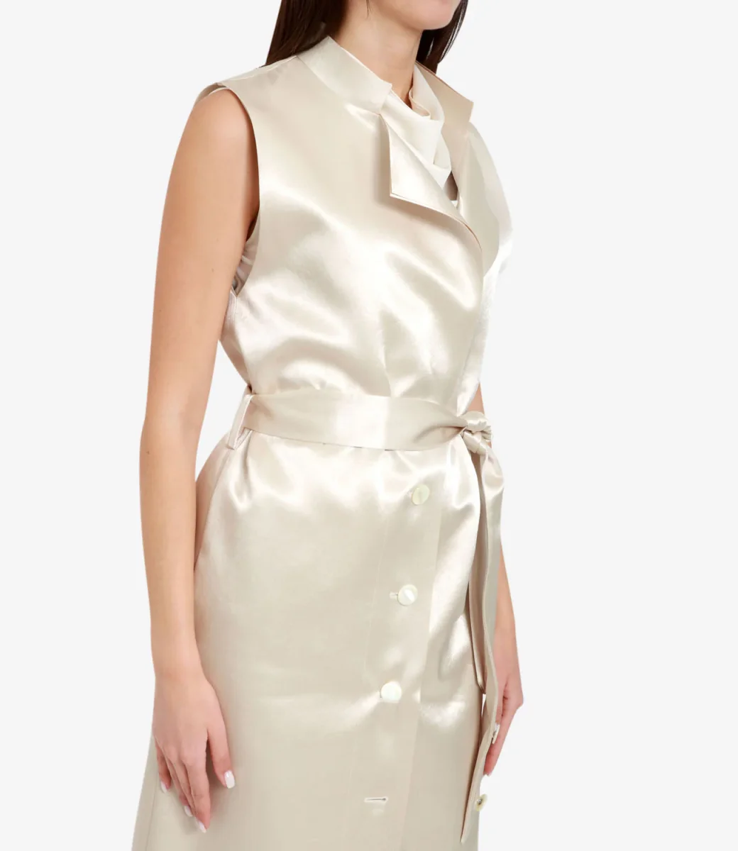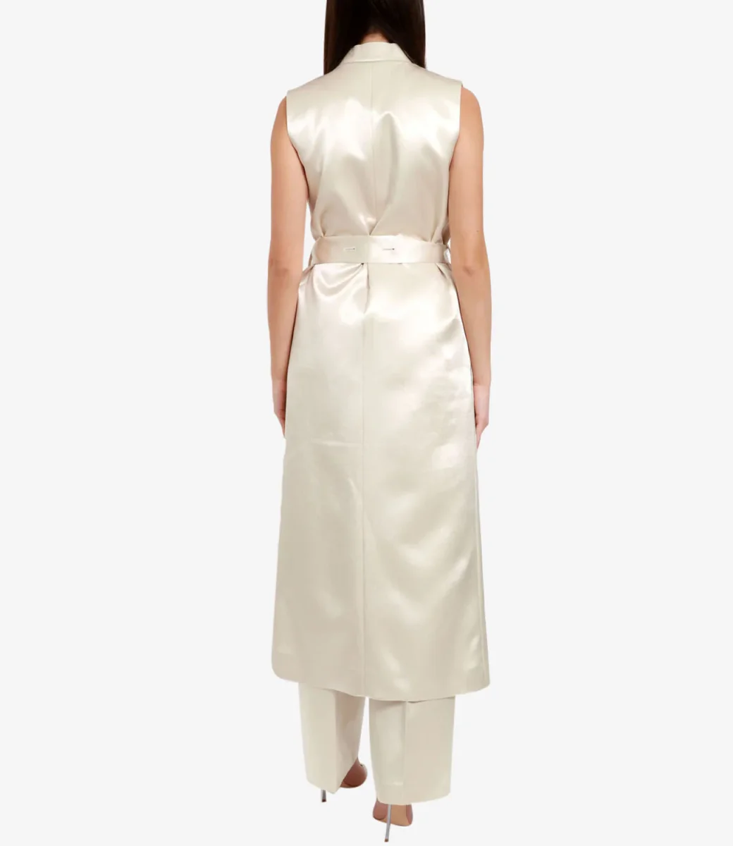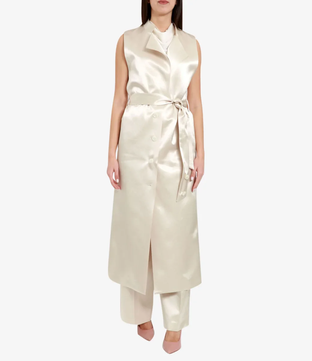 Gilet Philosophy di Lorenzo Serafini realizzato in duchesse lucido, design extra-long con collo rever morbido, abbottonatura lunga con bottoni foderati e cintuta in tessuto in tono imprezziosita da bottoni applicati foderati in tessuto in tono. Capo da indossare come gilet con il proprio pantalone in collezione per un outfit sofisticato o come abito per uno look più libero.