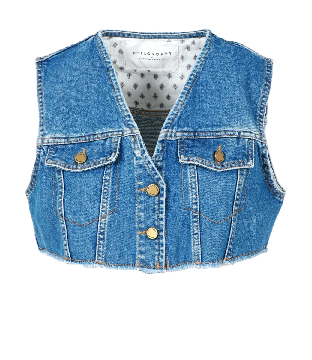 Gilet Philosophy di Lorenzo Serafini in denim con tasche con patta e bottoni. La modella è alta 1.75m ed indossa una 40.