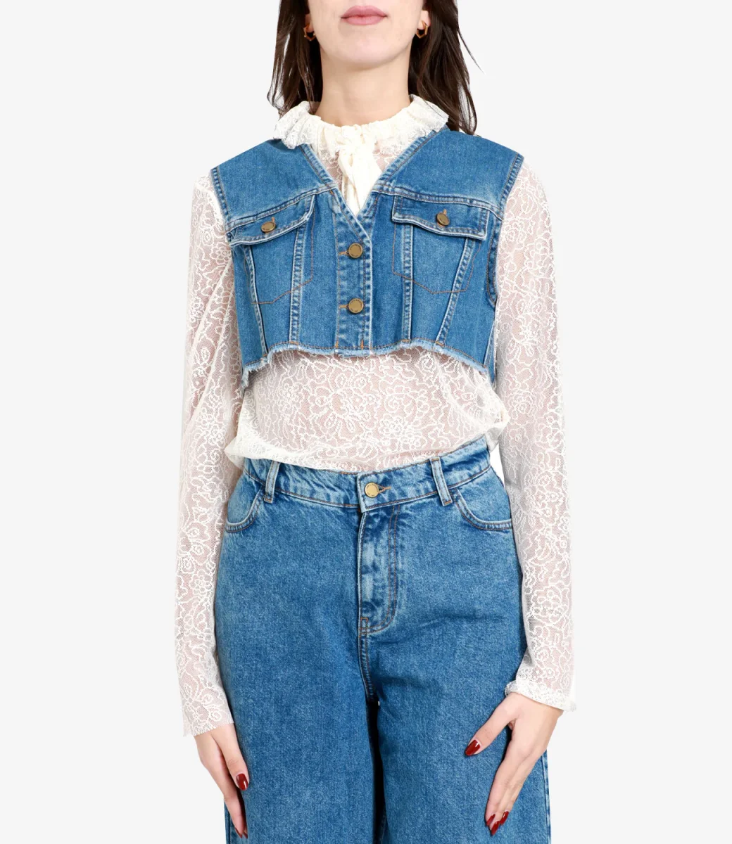 Dettagli:– Denim– Smanicato– Bottoni– Tasche