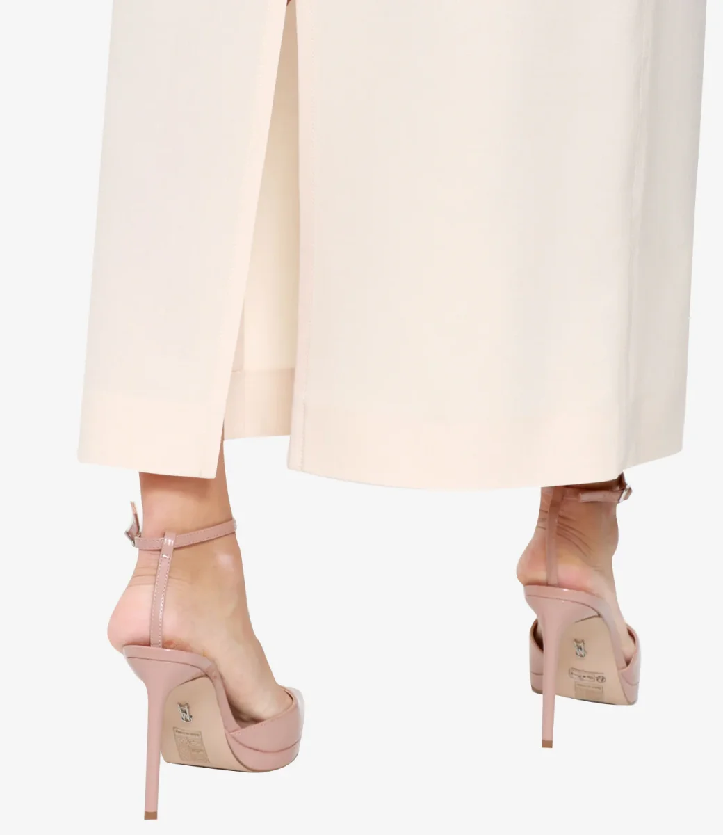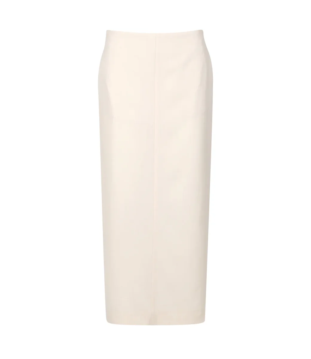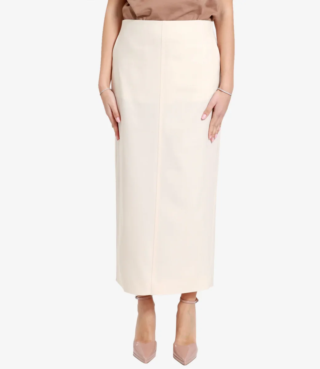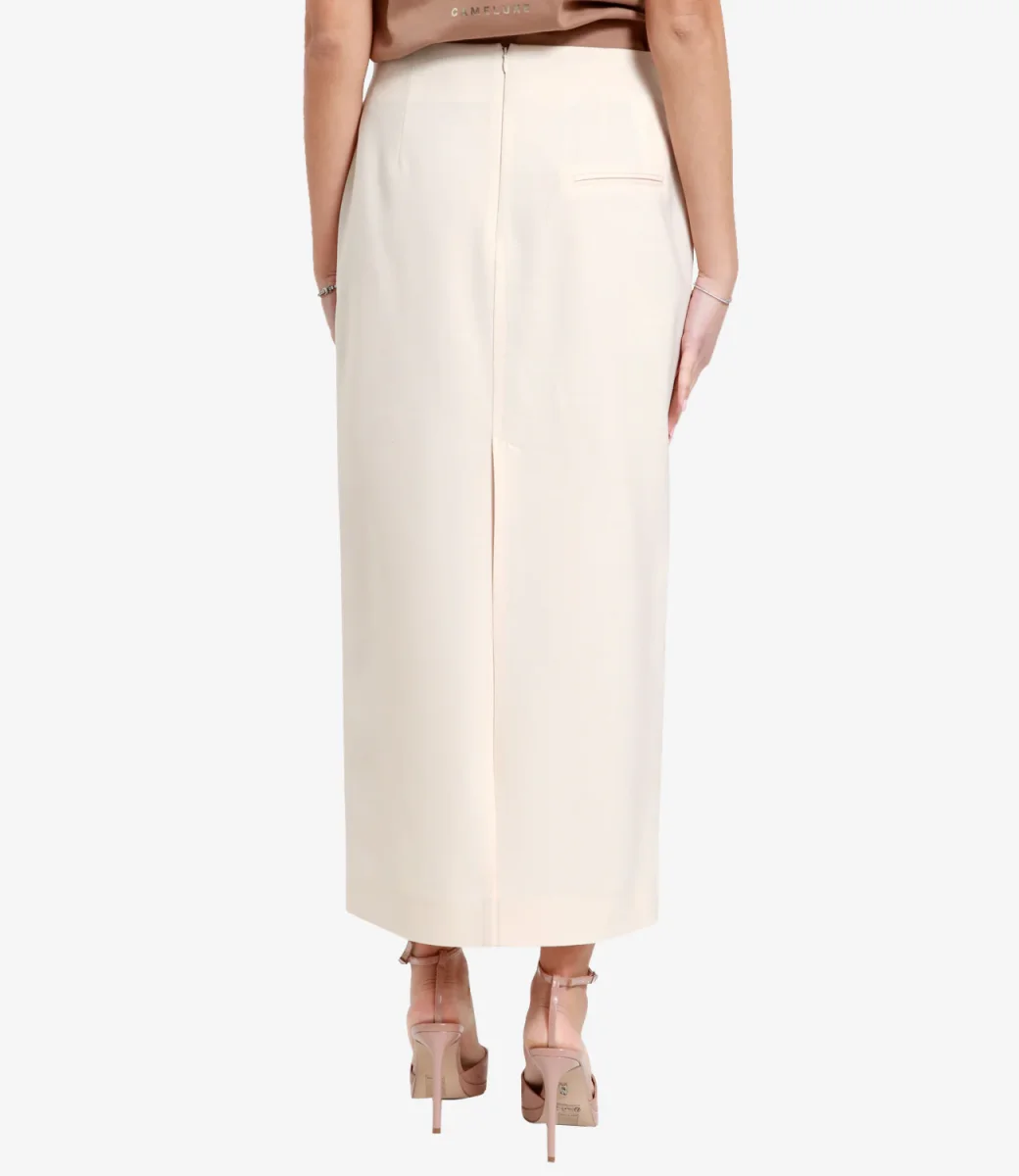 Gonna Philosophy di Lorenzo Serafini modello a tubino e vita media, taschino e spacco posteriore, chiusura con zip a scomparsa. La modella è alta 1.75m ed indossa una 40.