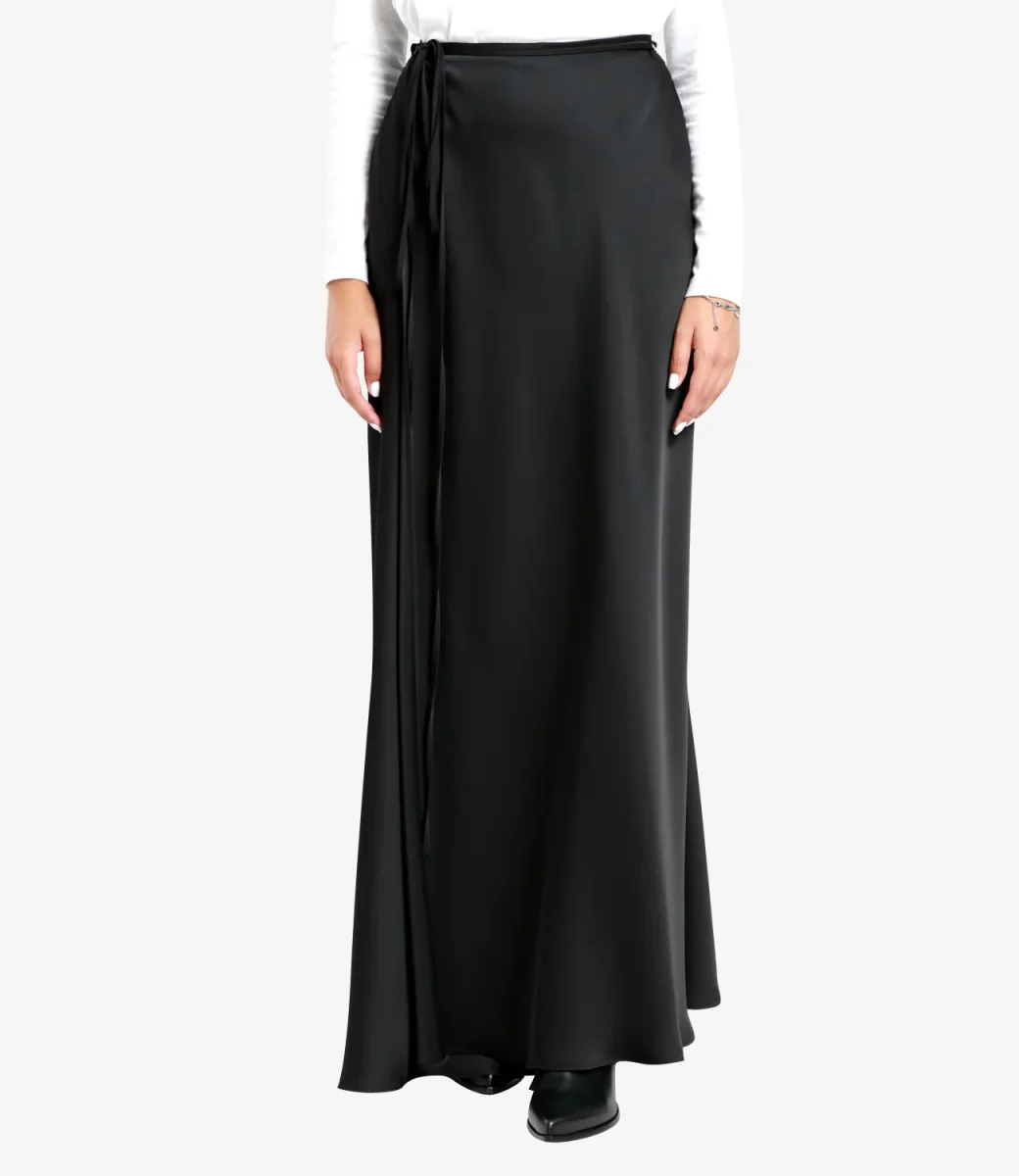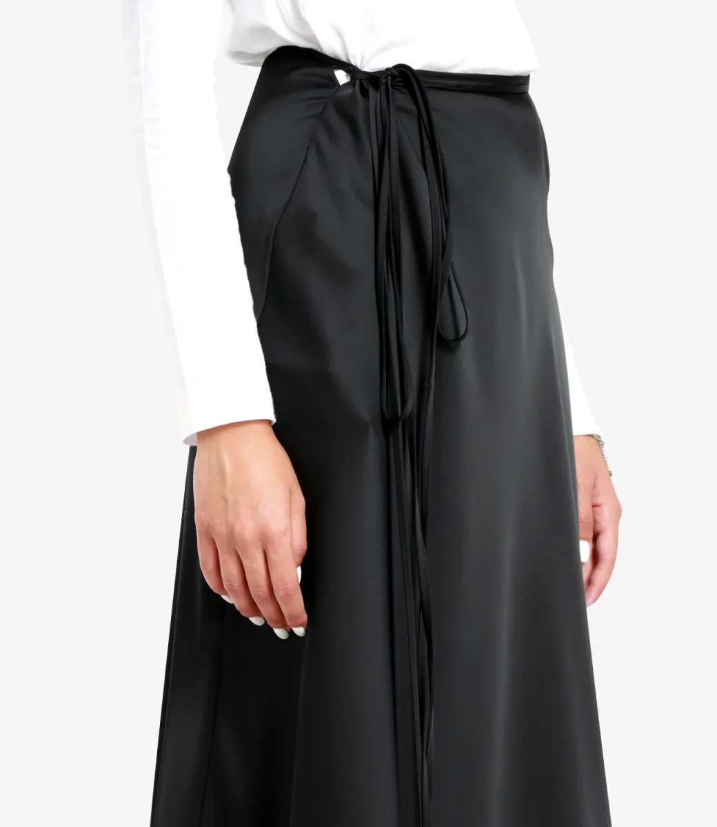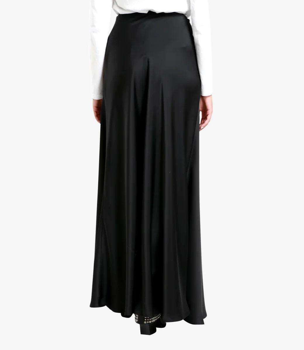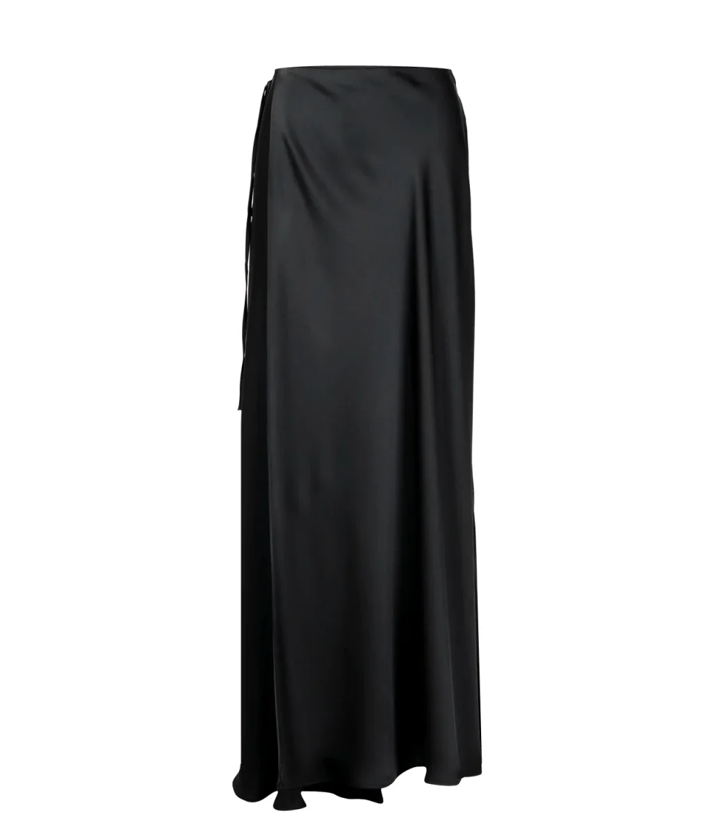 Maxi gonna Philosophy di Lorenzo Serafini in satin dalla silhouette fluida. L’allacciatura a fiocco laterale enfatizza la costruzione a portafoglio del modello.