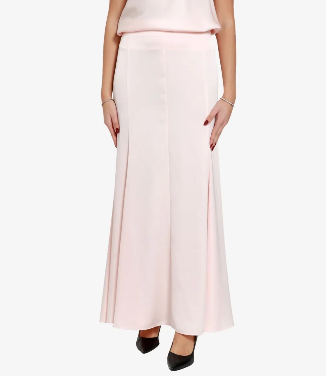 Gonna Philosophy di Lorenzo Serafini in satin con chiusura posteriore con zip a scomparsa. La modella è alta 1.75m ed indossa una 40.