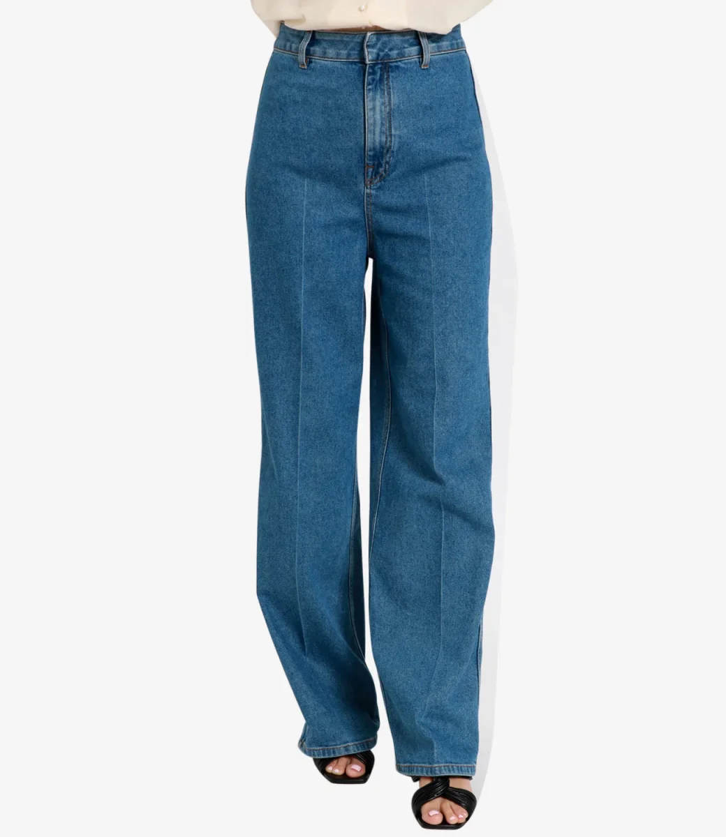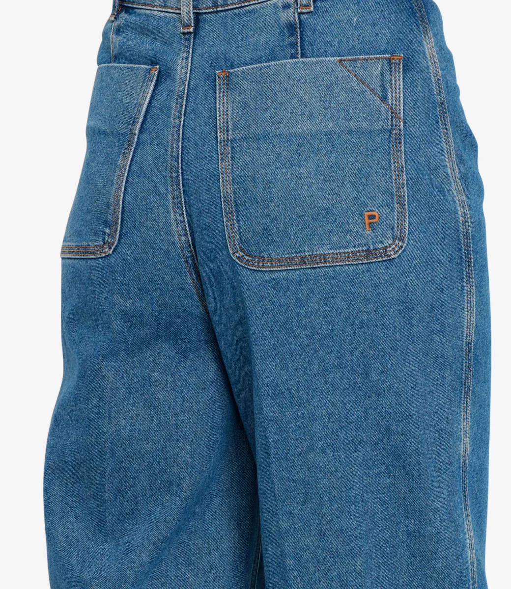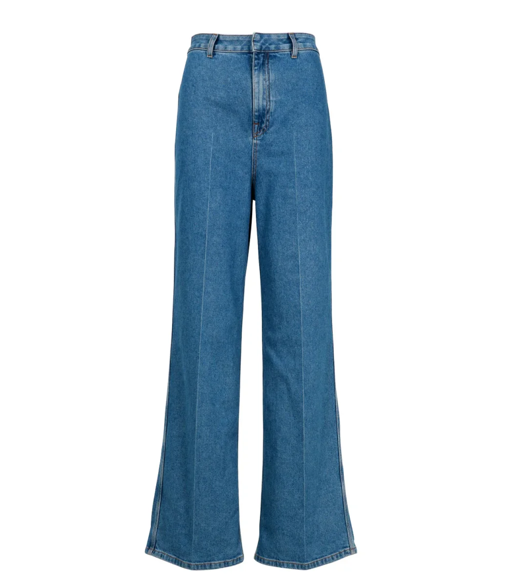 Jeans Philosophy di Lorenzo Serafini in denim di cotone, vita alta con passanti, chiusura con gancetto nascosto e zip con patta, due tasche applicate sul retro, piega stirata sulla lungheza sul davanti e sul retro.