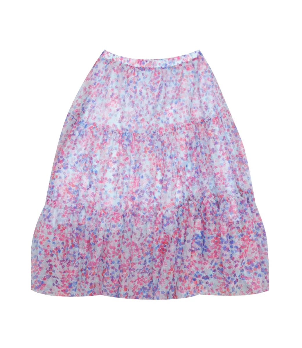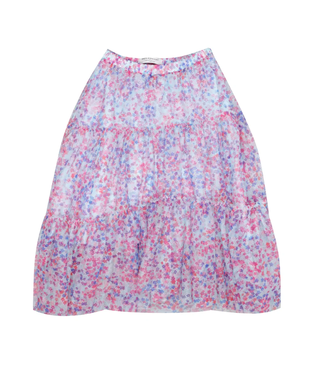 Gonna Philosophy di Lorenzo Serafini Kids in tulle celeste con lavorazione a balze, fantasia floreale e vita elasticizzata.