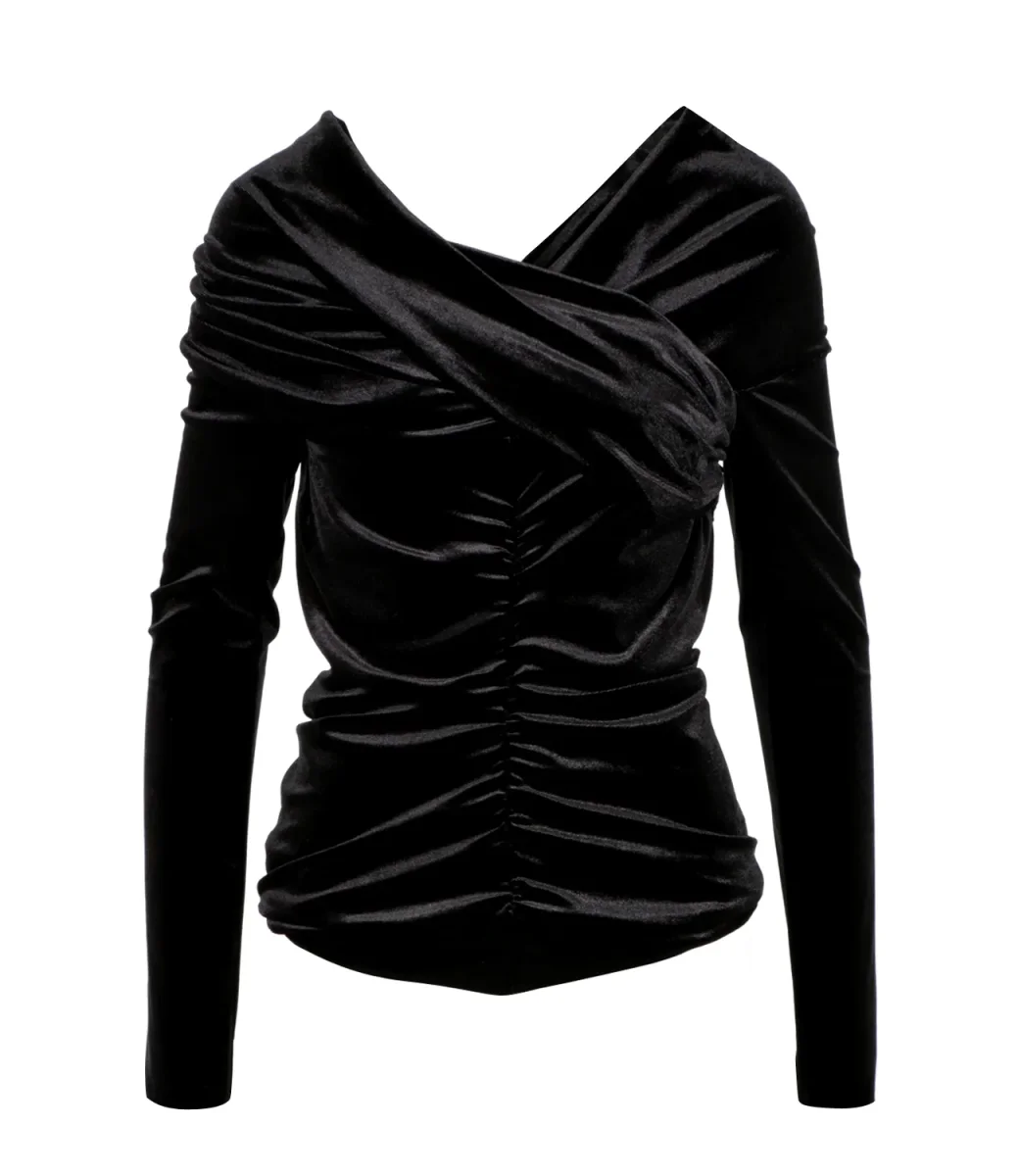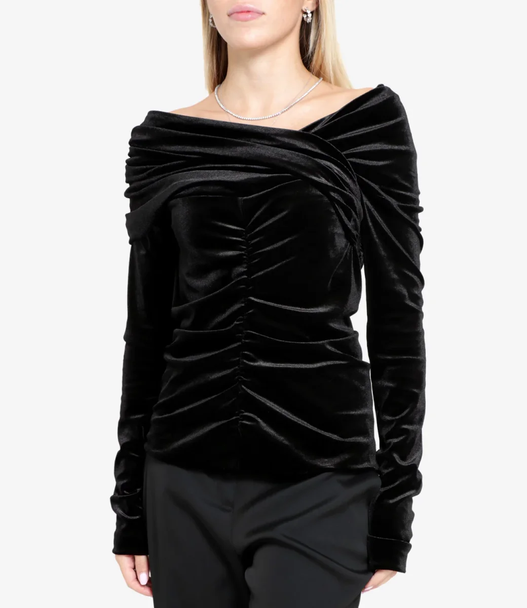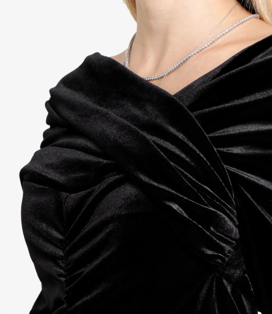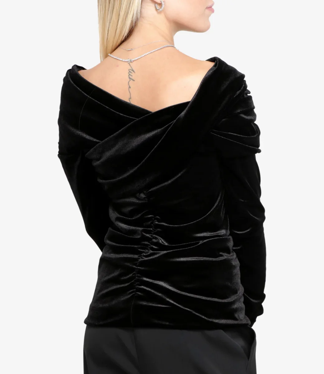 Maglia nera con scollo a V e dettaglio con fasce incrociate.