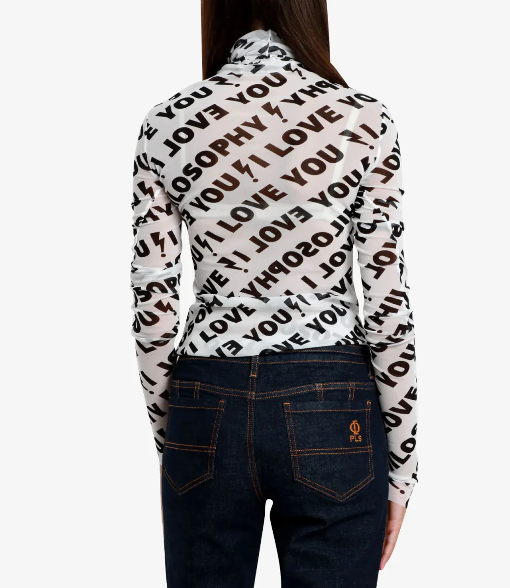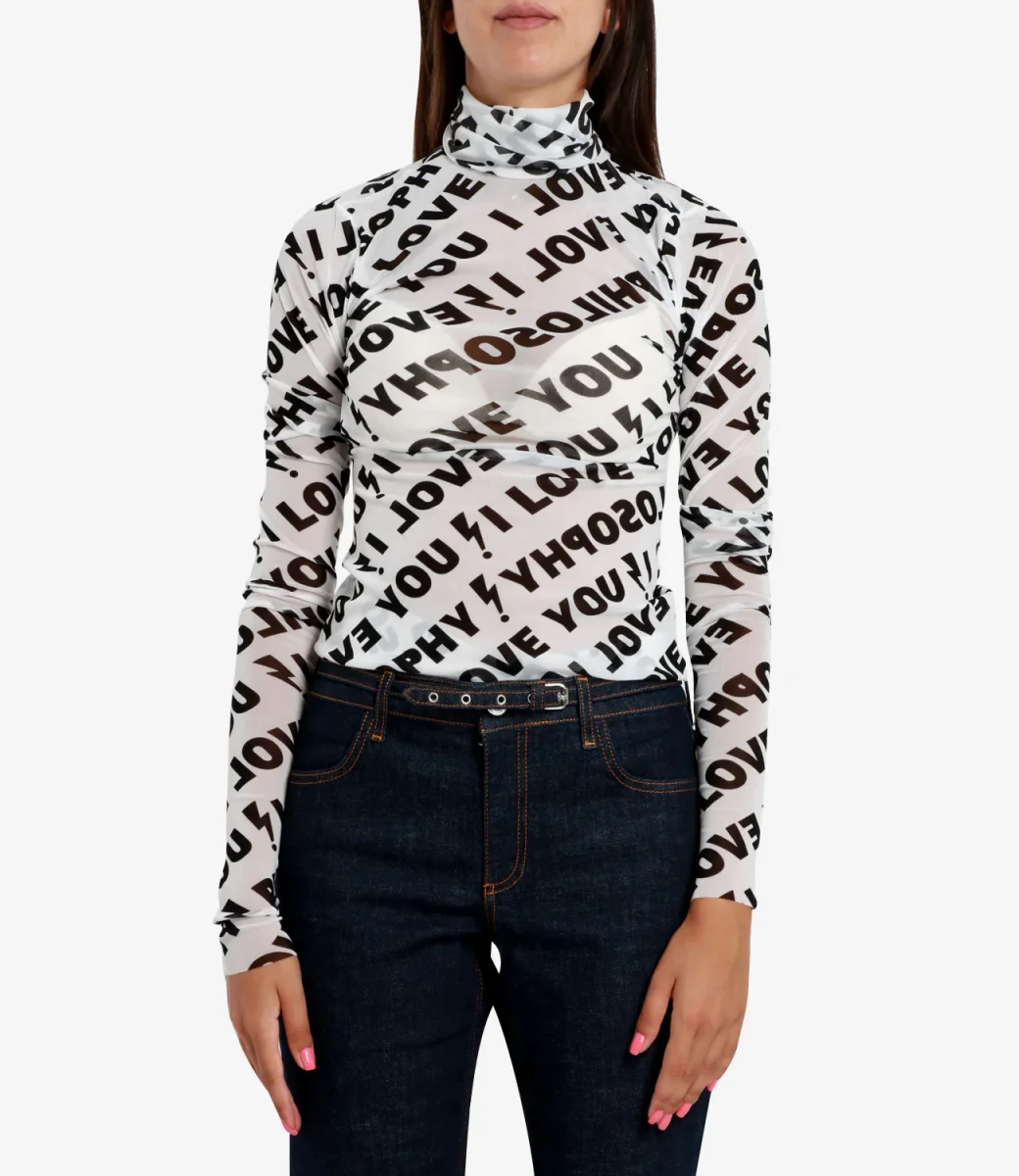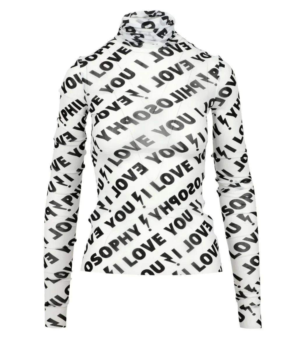 Dolcevita in tulle stretch Philosophy di Lorenzo Serafini dalla silhouette bodycon iper femminile. La stampa ‘I Love You Philosophy’ all over dona un fascino punk al capo.