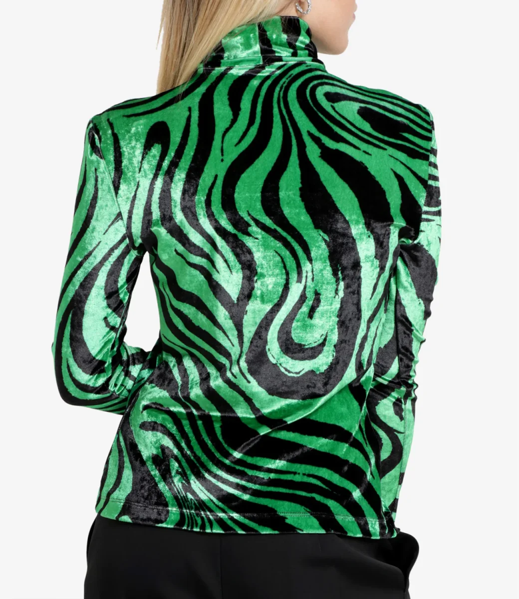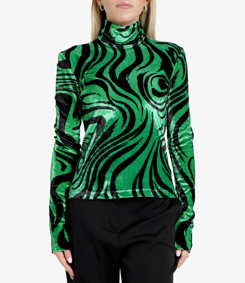 Maglia a collo alto con stampa a fantasia astratta verde e nero.
