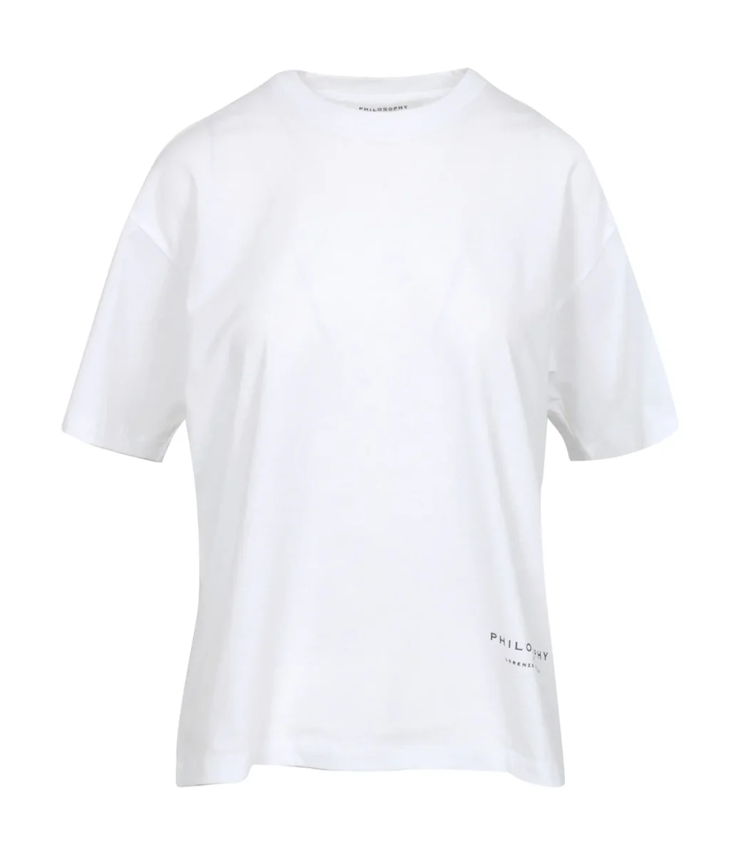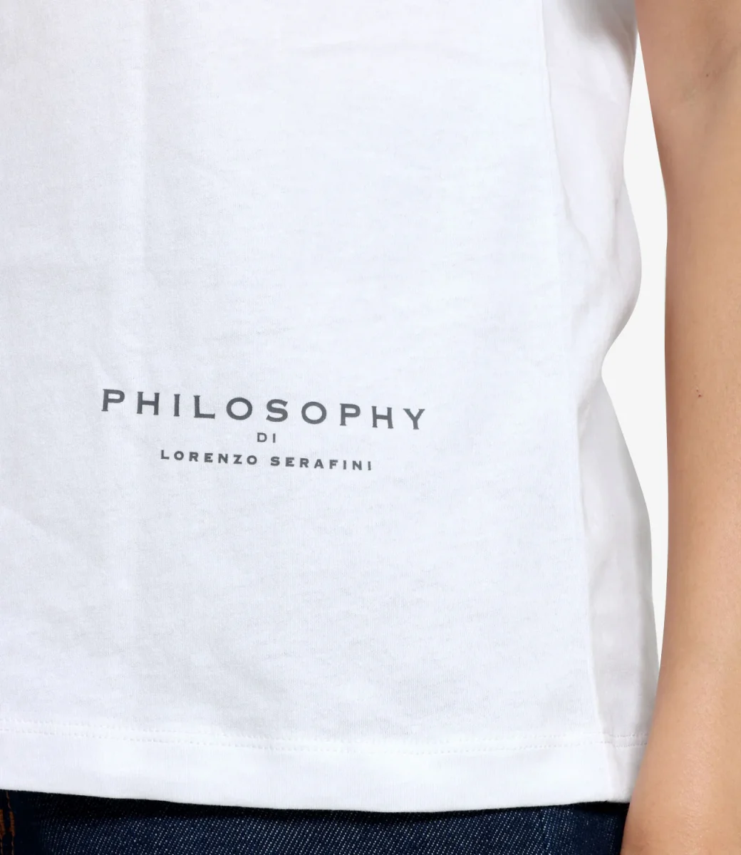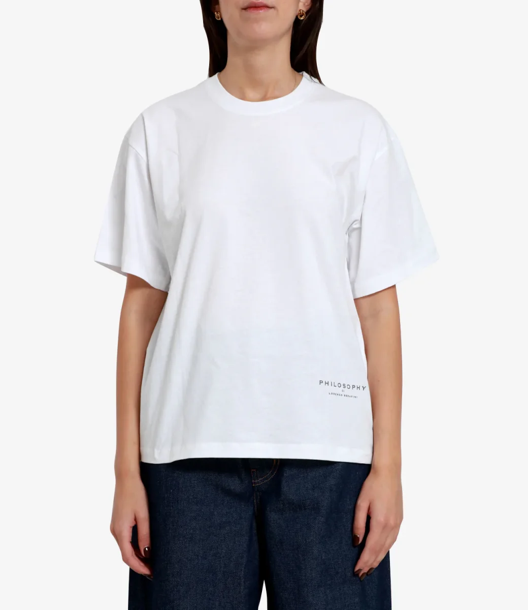 T-Shirt Philosophy di Lorenzo Serafini in cotone, girocollo, maniche corte con spalla scesa, logo lettering stampato al fondo laterale sinistro e sulle spalle.