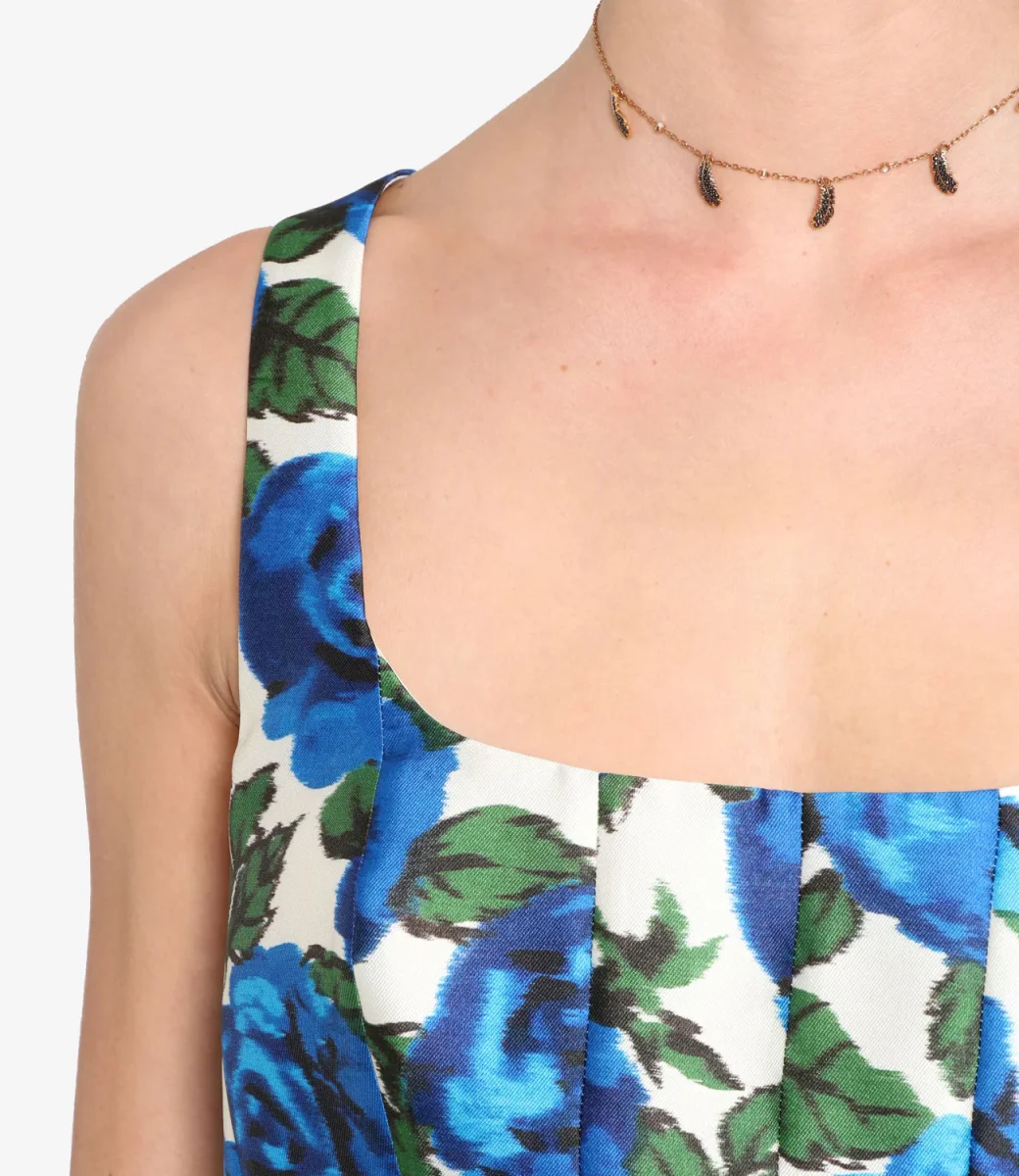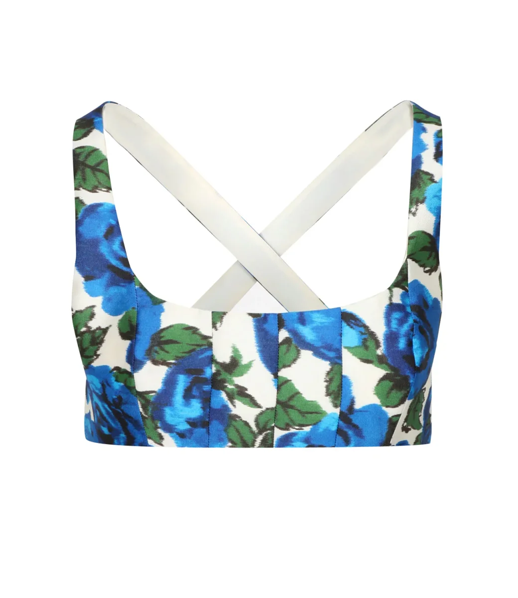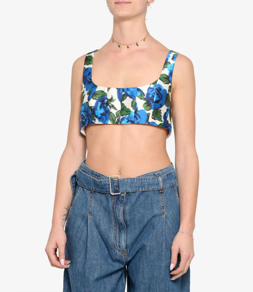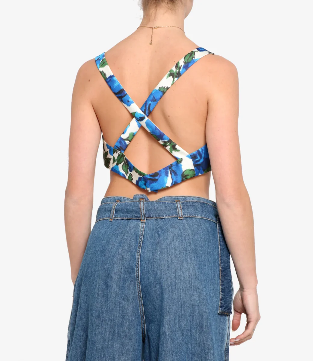 Micro top in radzmir con stampa fiori dai tratti grafici e pittorici. Per un total look floreale e iper femminile, indossalo con la gonna a vita alta o lo short coordinati.