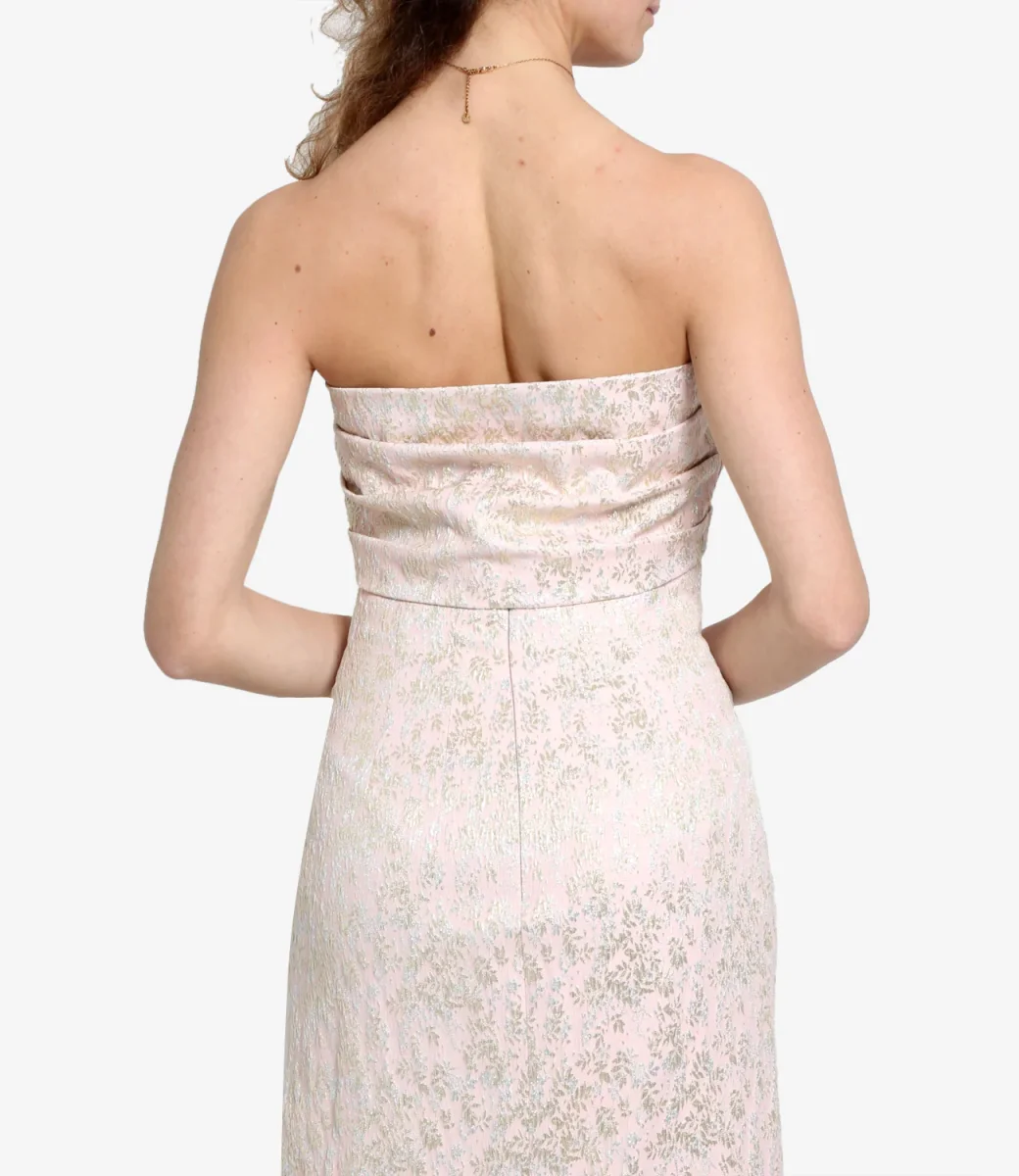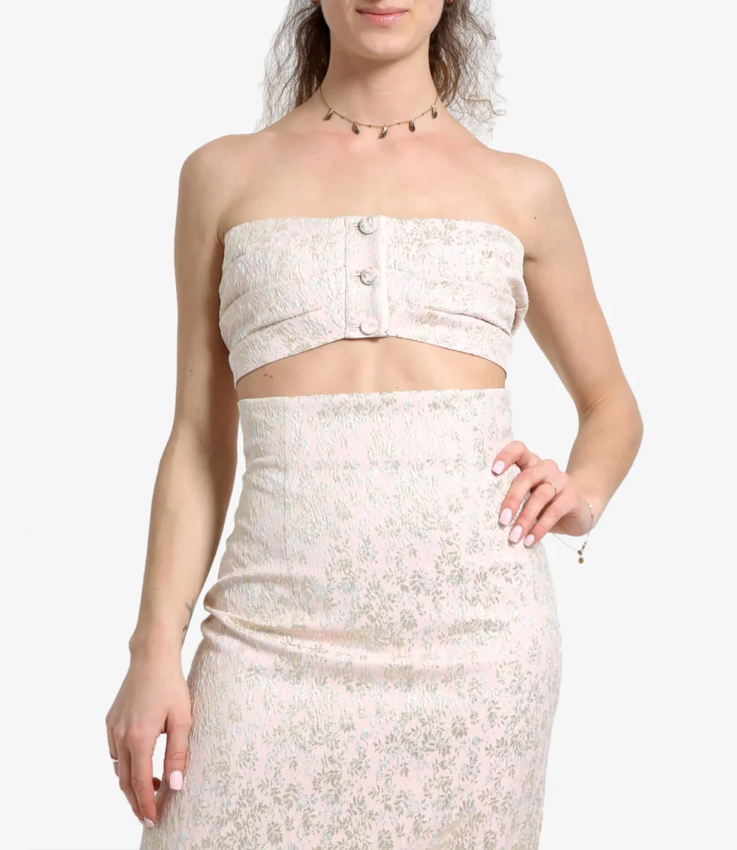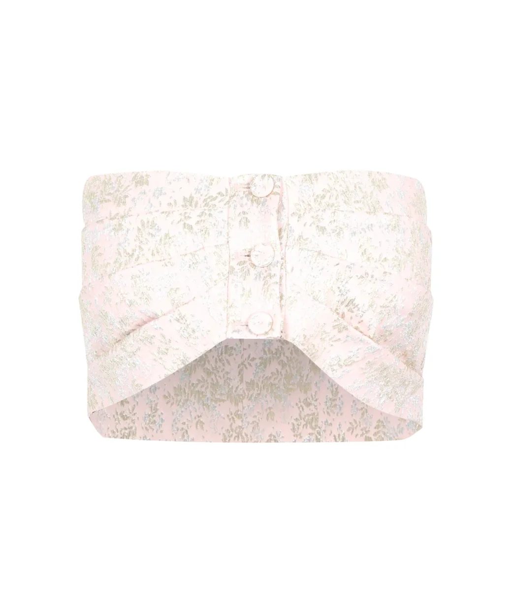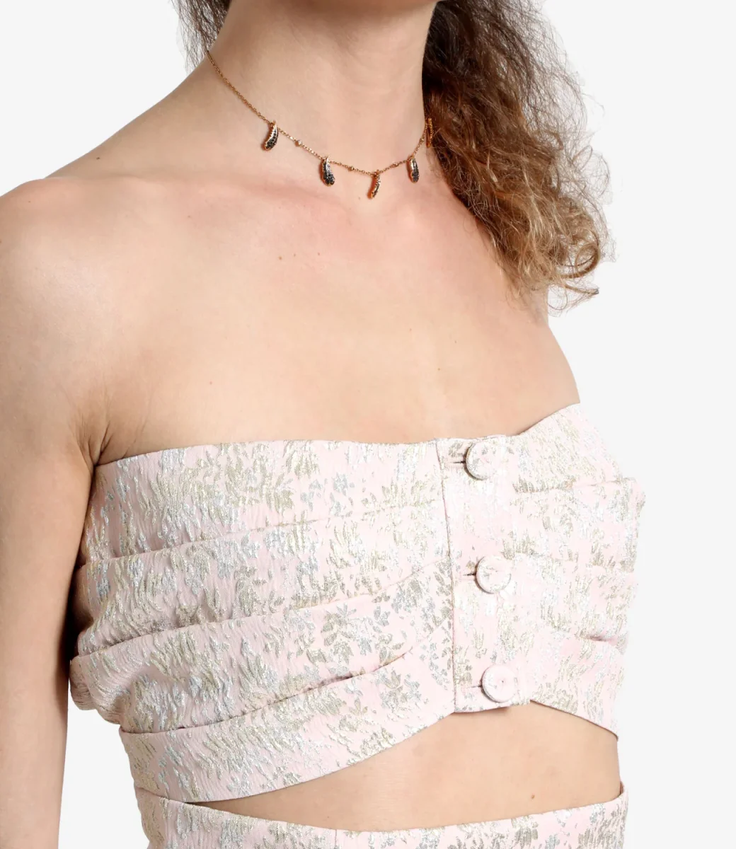 Micro top Philosophy di Lorenzo Serafini off-the-shoulder con abbottonatura centrale. Realizzato in jacquard cloqué, rivela una texture oro e argento dall’elegante effetto laminato. Abbinalo alla gonna tubino nello stesso tessuto per un look coordinato elegante e femminile.
