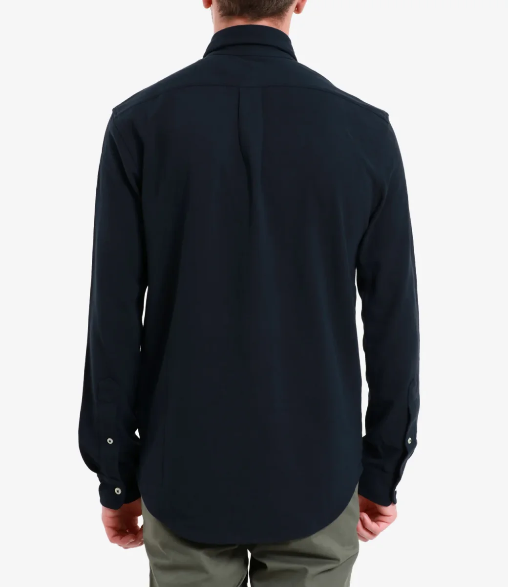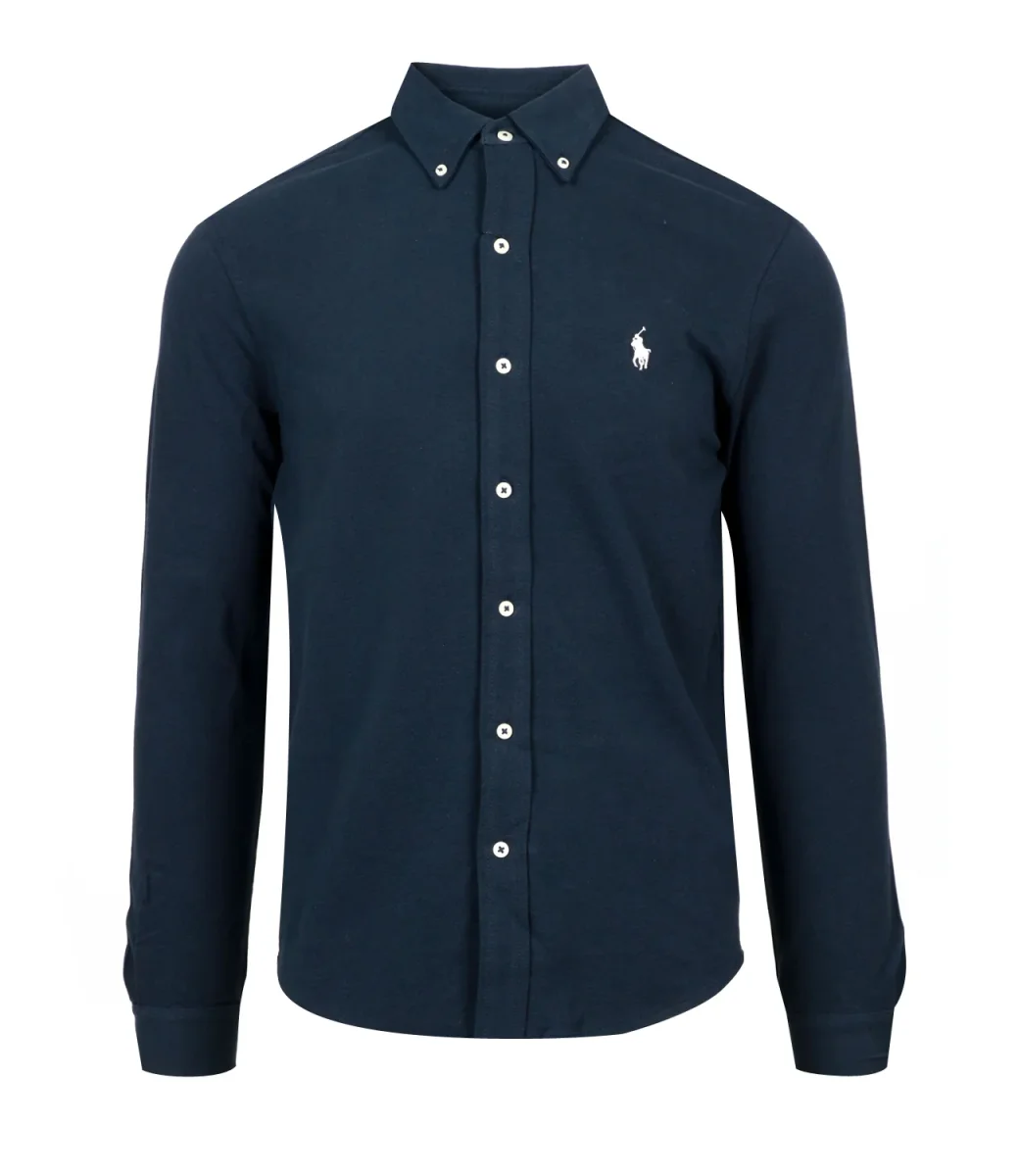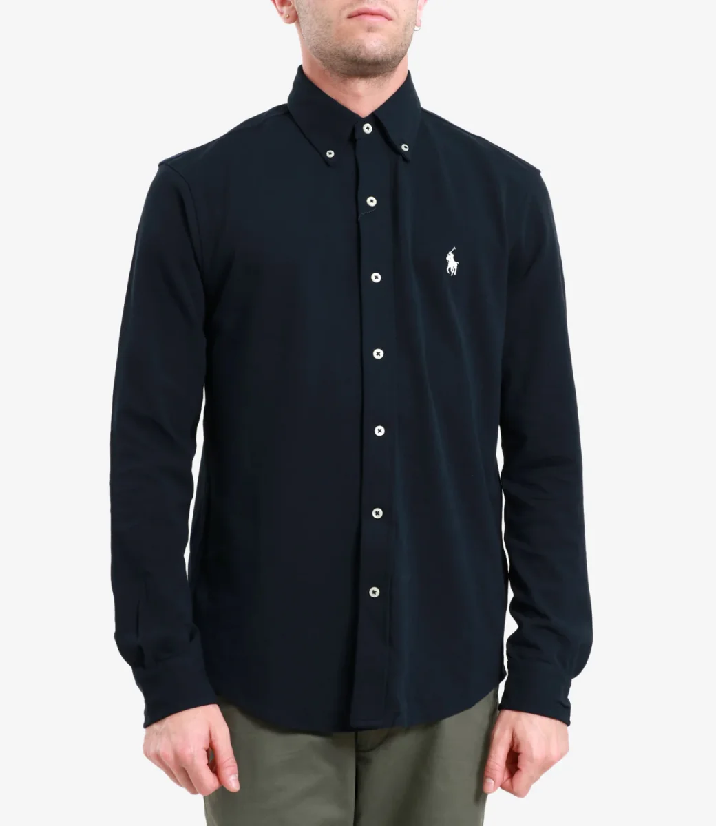 Camicia Polo Ralph Lauren in piqué di cotone, collo button-down, chiusura con bottoni, logo ricamato sul petto lato sinsitro, maniche lunghe con polsini con bottoni, fondo stondato.