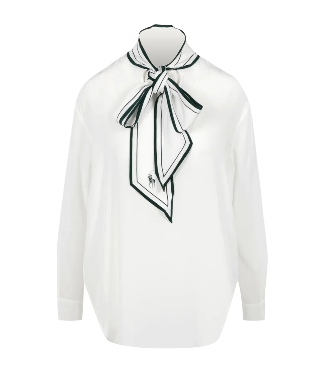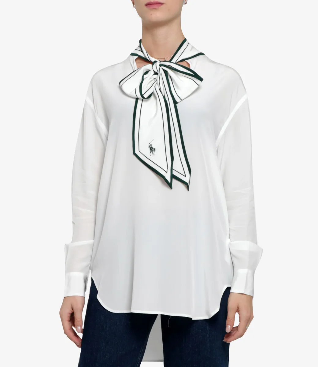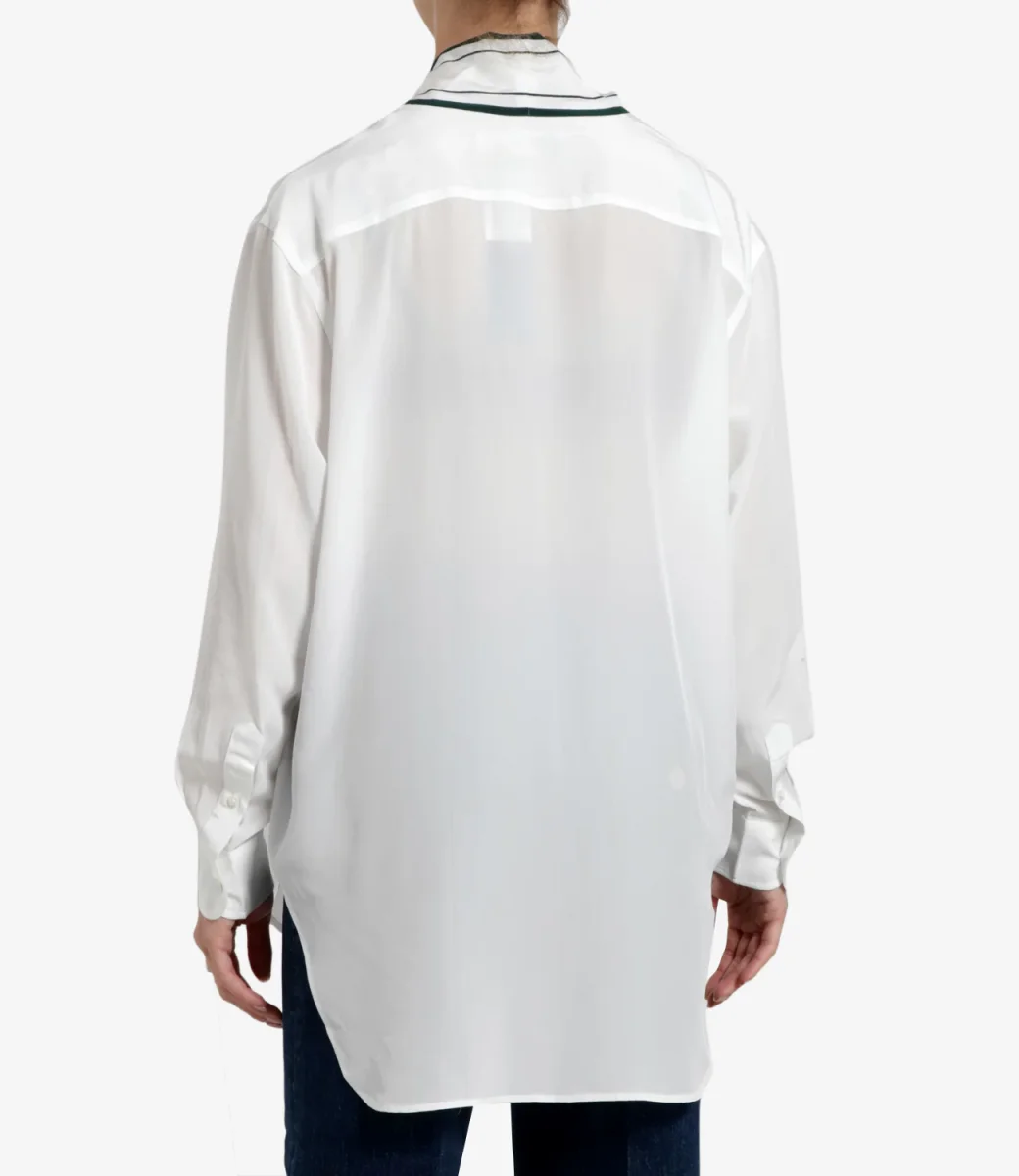 Realizzata in pregiata seta di gelso, questa camicia presenta un taglio oversize ed è impreziosita da lacci sul collo con righe a contrasto.