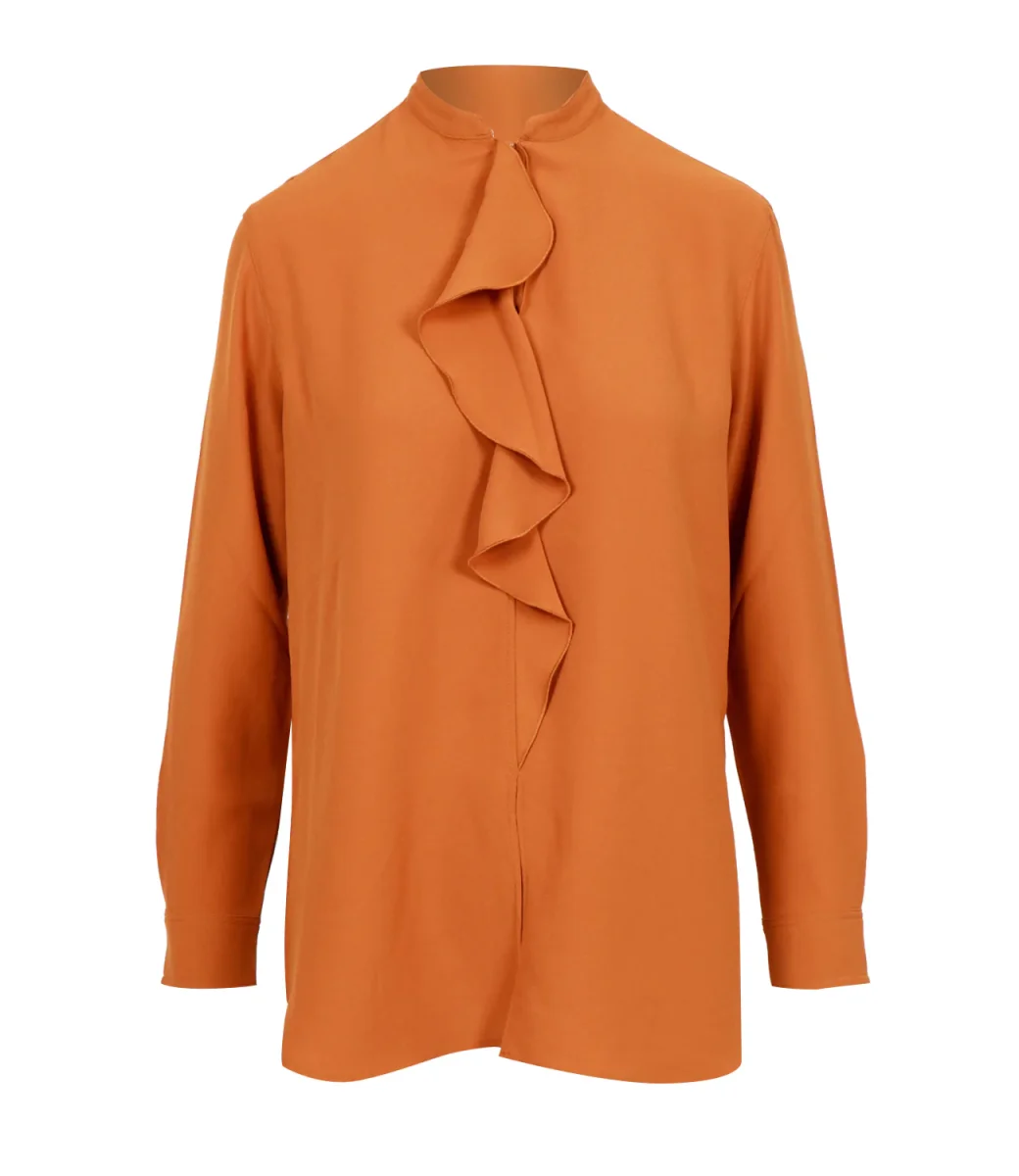 Camicia Polo Ralph Lauren in georgette double-face dal taglio morbido. Collo a fascetta e abbottonatura frontale con volant applicato, Maniche con polsini a bande orlo a camicia con spacco laterale. Bottoni con logo LRL: simil-perla sulla chiusura, metallo ai polsini.