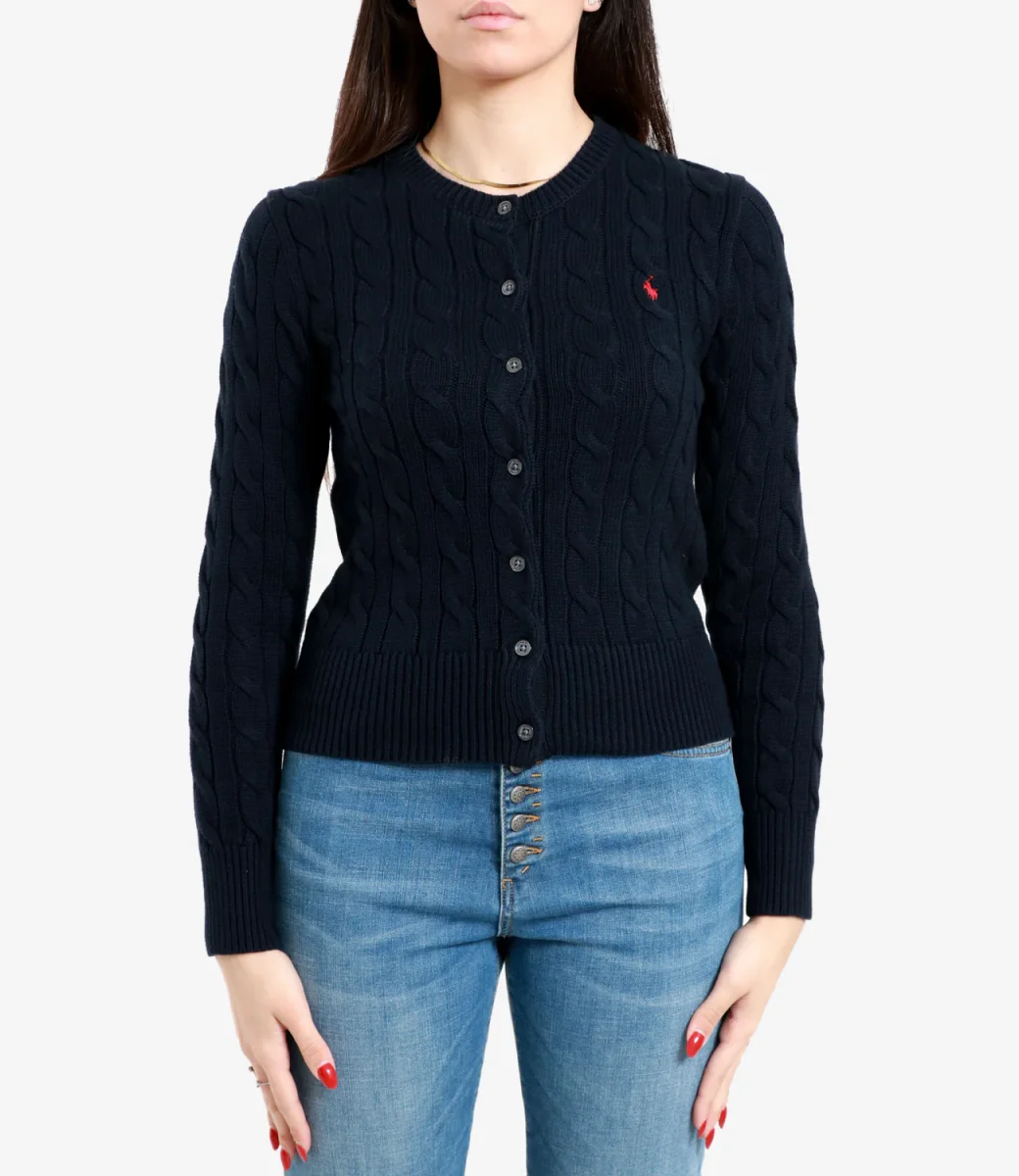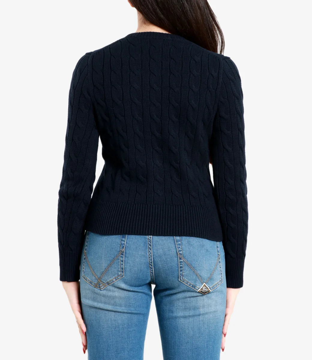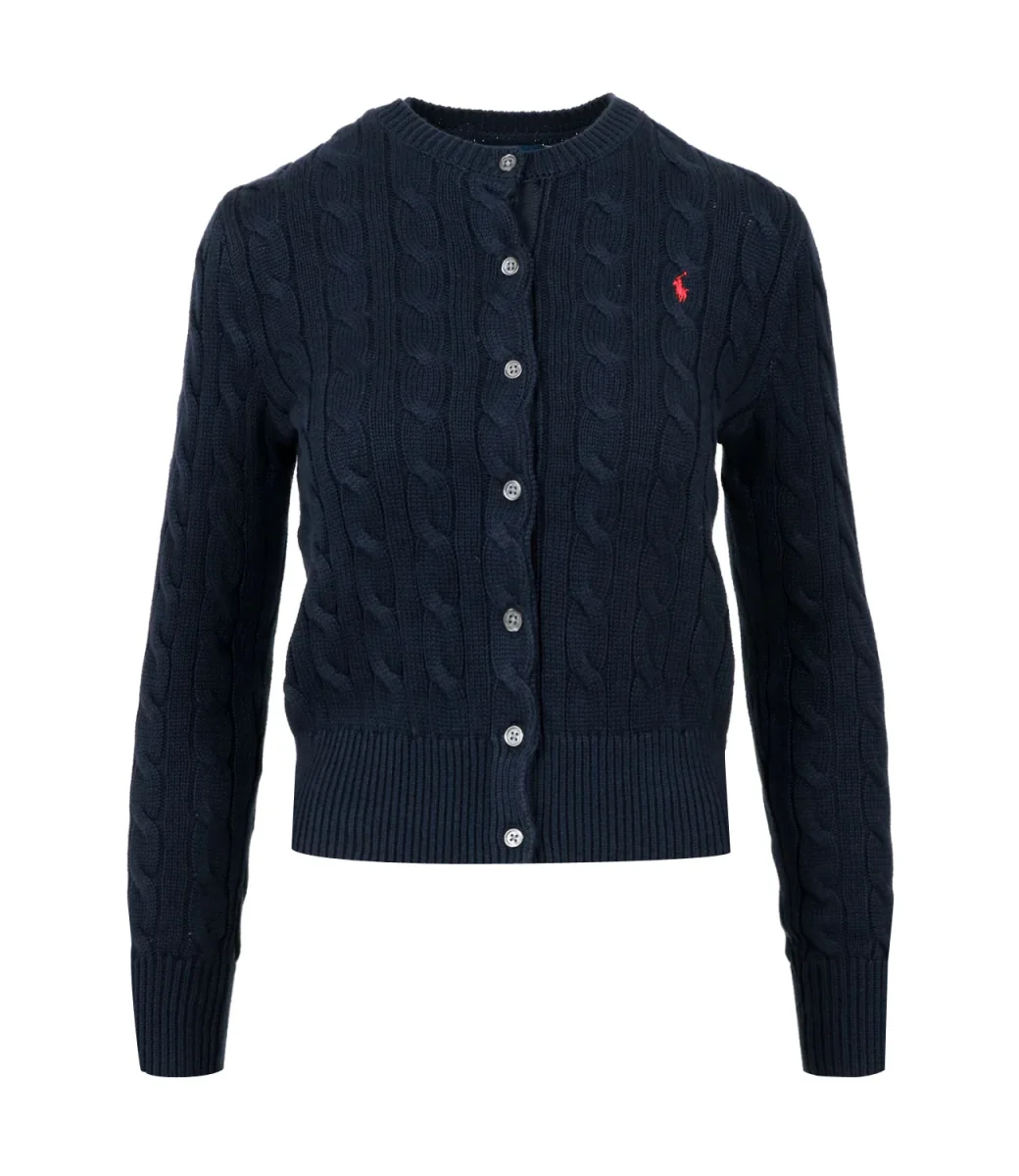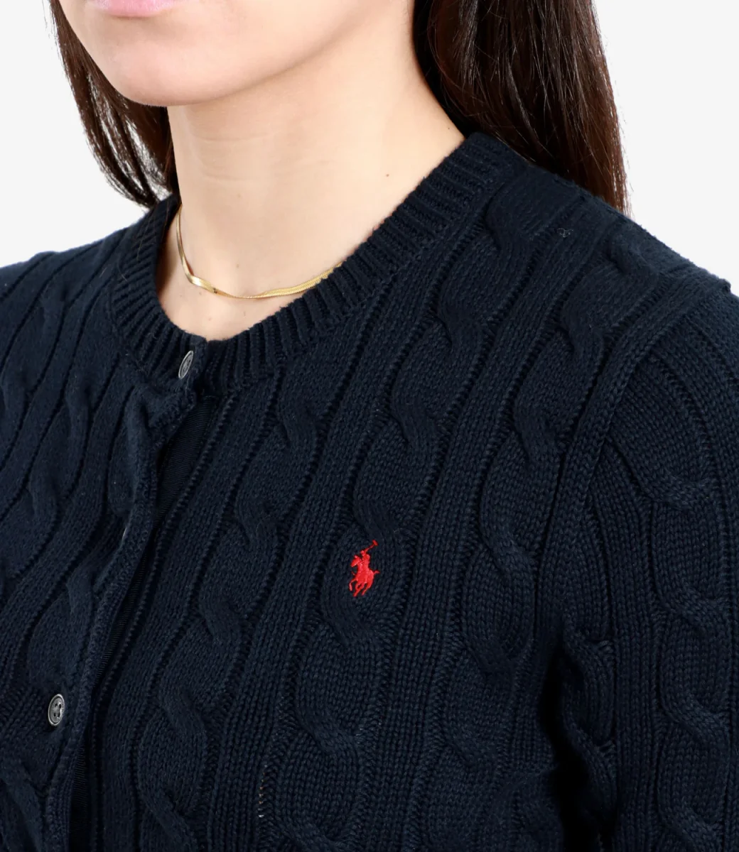 Questo cardigan aderente a girocollo Polo Ralph Lauren realizzato in puro cotone dalla classica lavorazione a trecce, sfoggia il nostro esclusivo pony ricamato sul torace.
