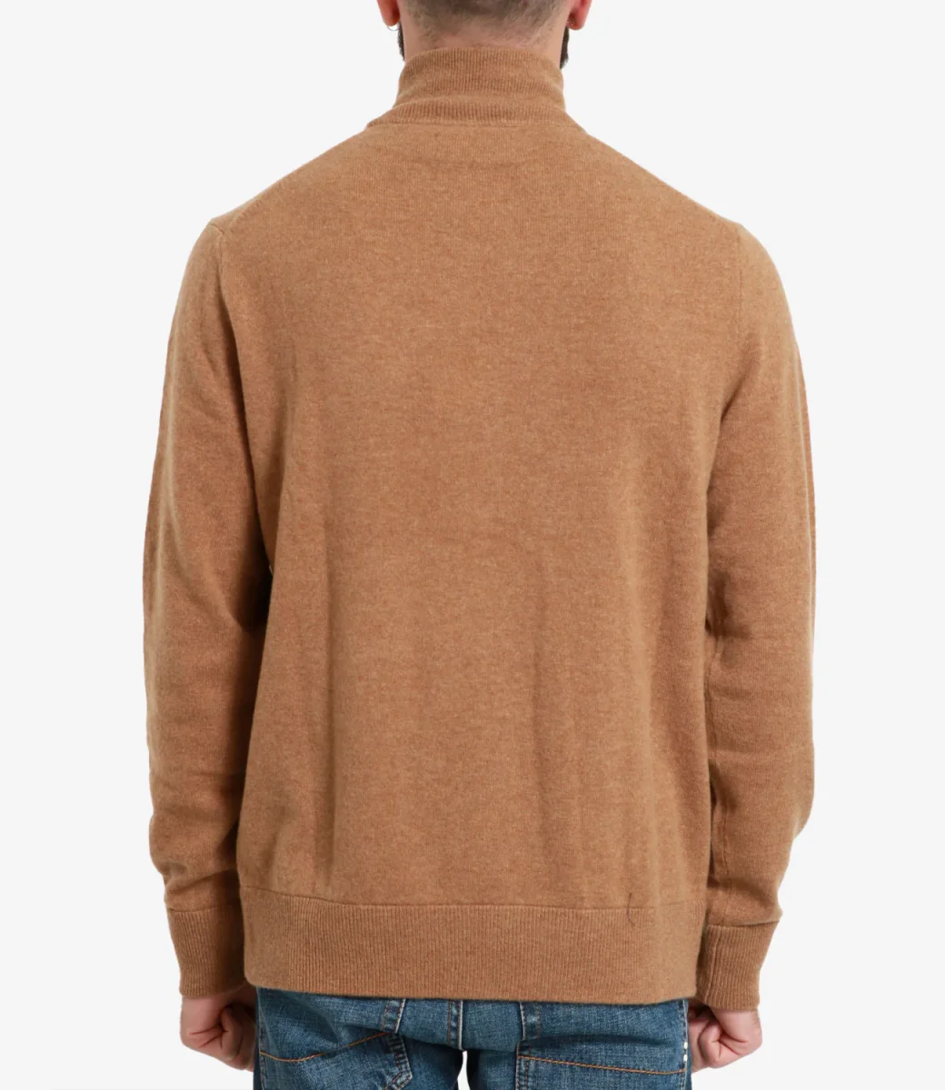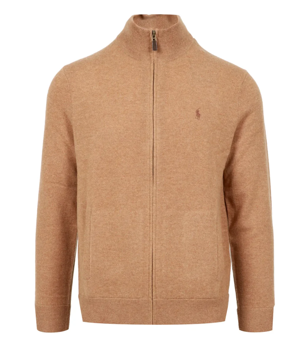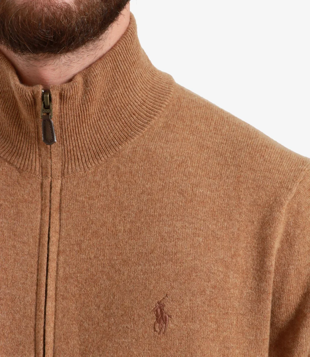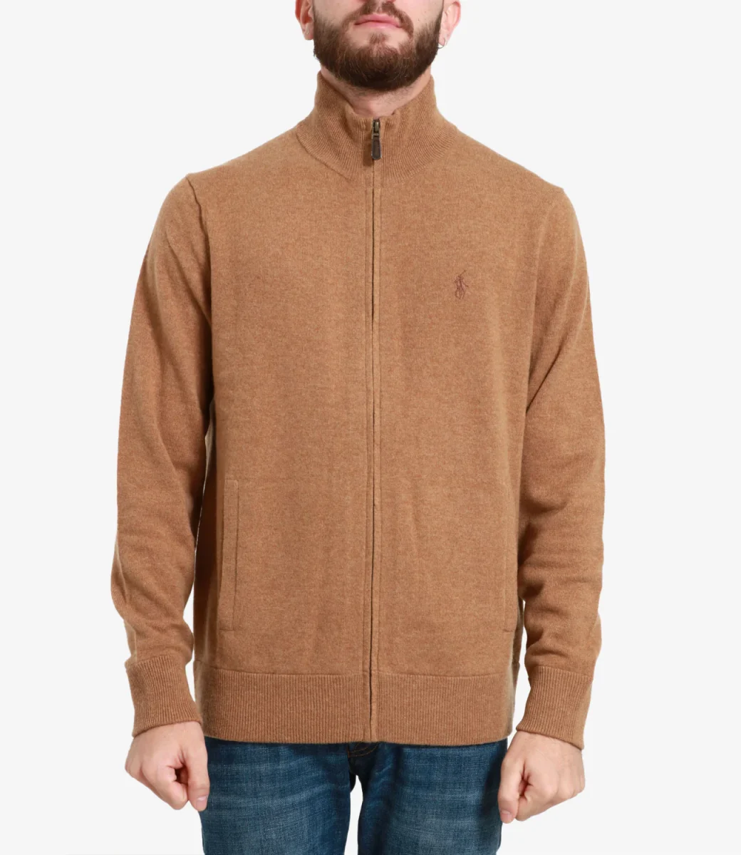 Cardigan Polo Ralph Lauren in lana a collo alto con maniche lunghe, chiusura frontale con zip, tasche e logo ricamato sulla parte sinistra del petto.