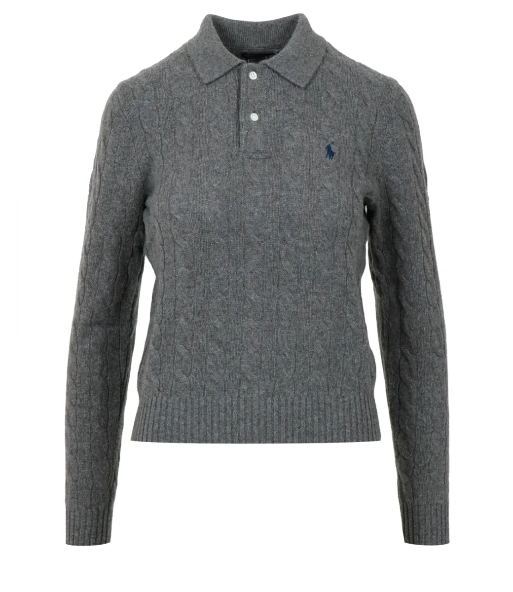Maglia Polo Ralph Lauren in lana e cachemire, con distintivo motivo a trecce, Colletto a polo con due bottoncini sul davanti, maniche lunghe con polsini a costine, iconico pony ricamato sul petto lato sinistro, fondo con bordo a costine.