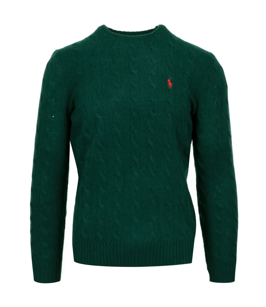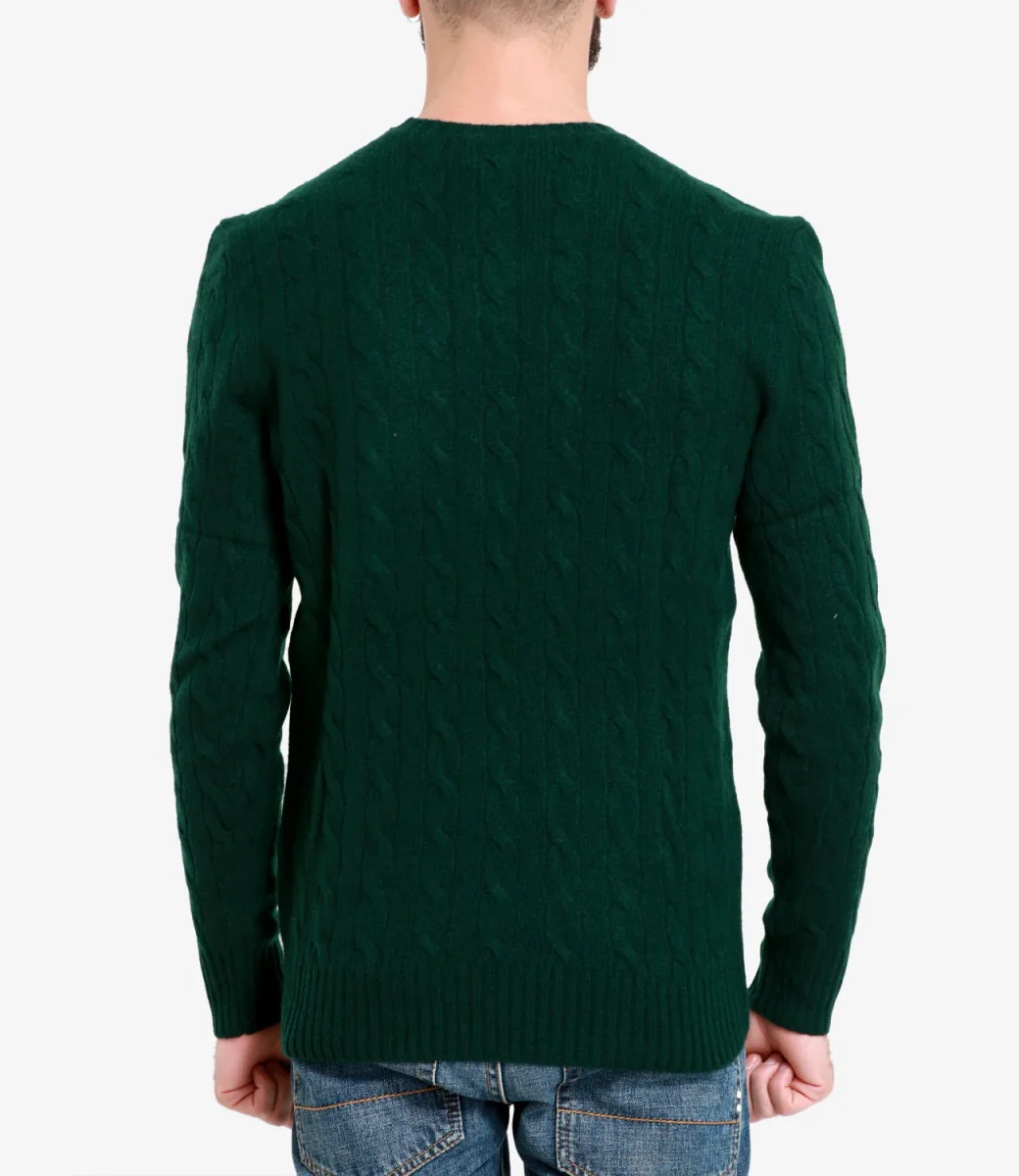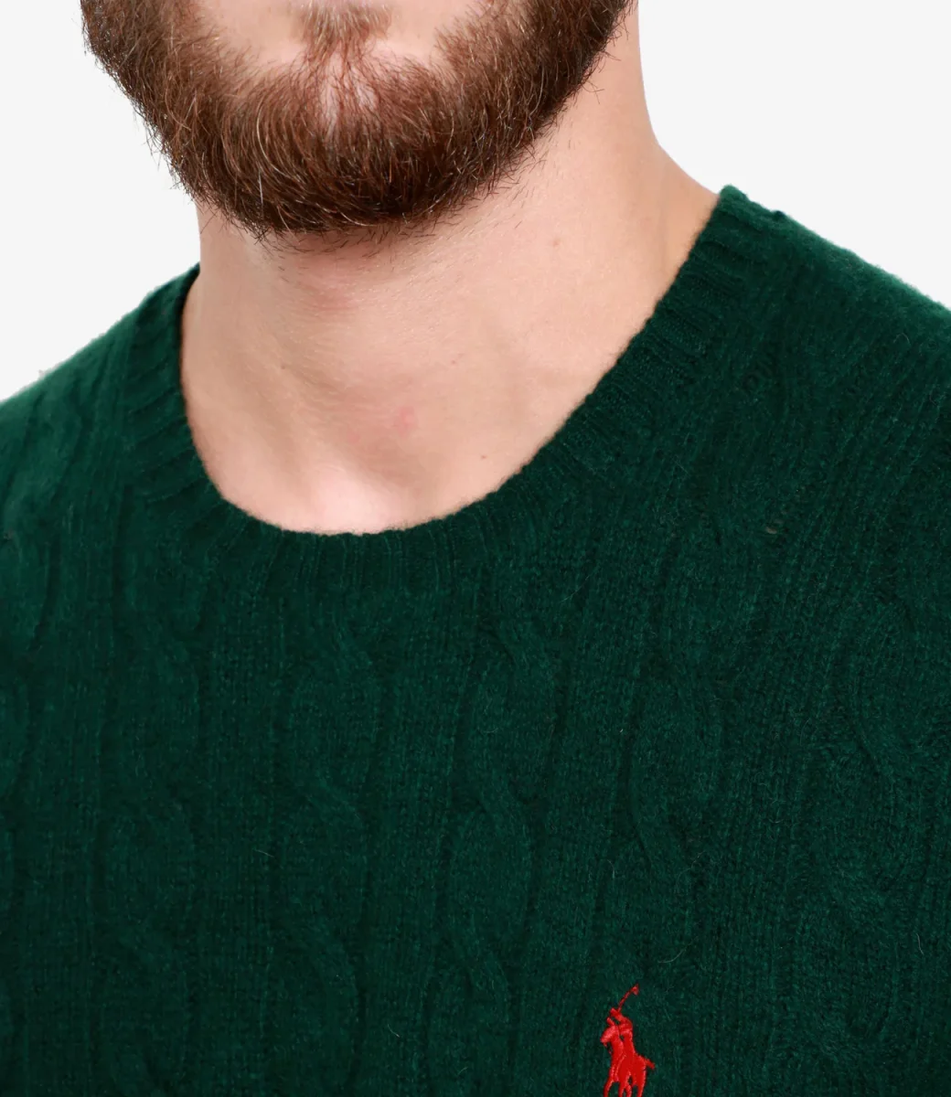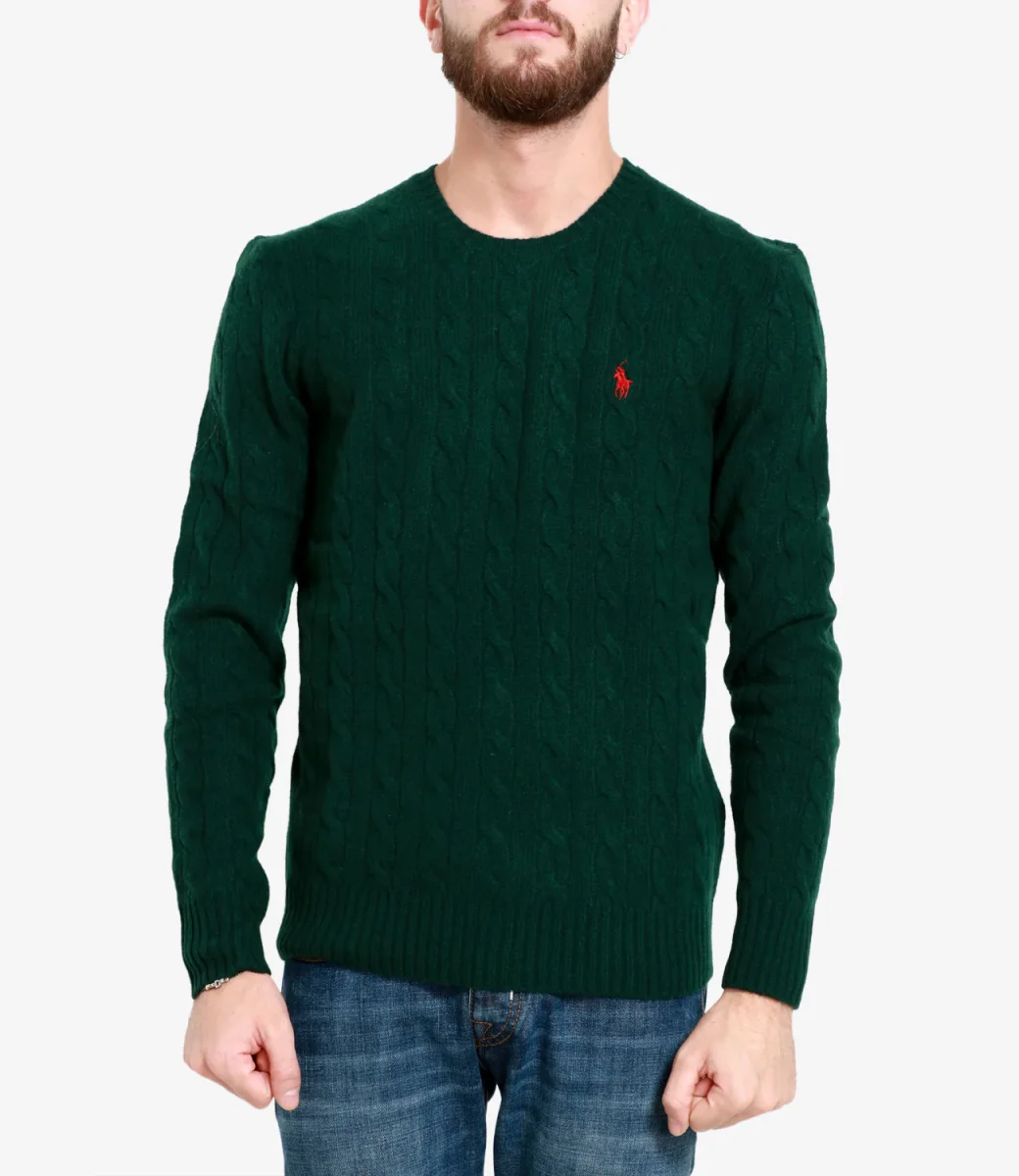 Maglia Polo Ralph Lauren, iconico capo a trecce, realizzata con filato di lana italiana e cashmere, girocollo, maniche lunghe con polsini a costine, fondo con bordo a coste.
