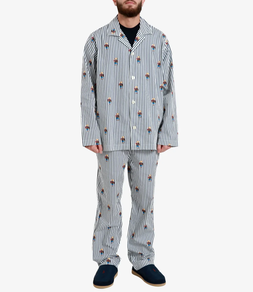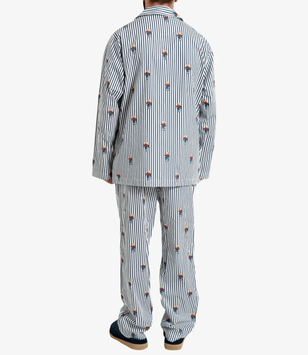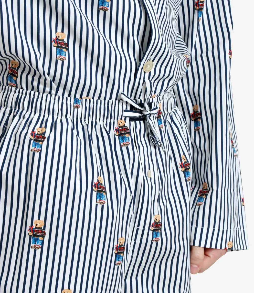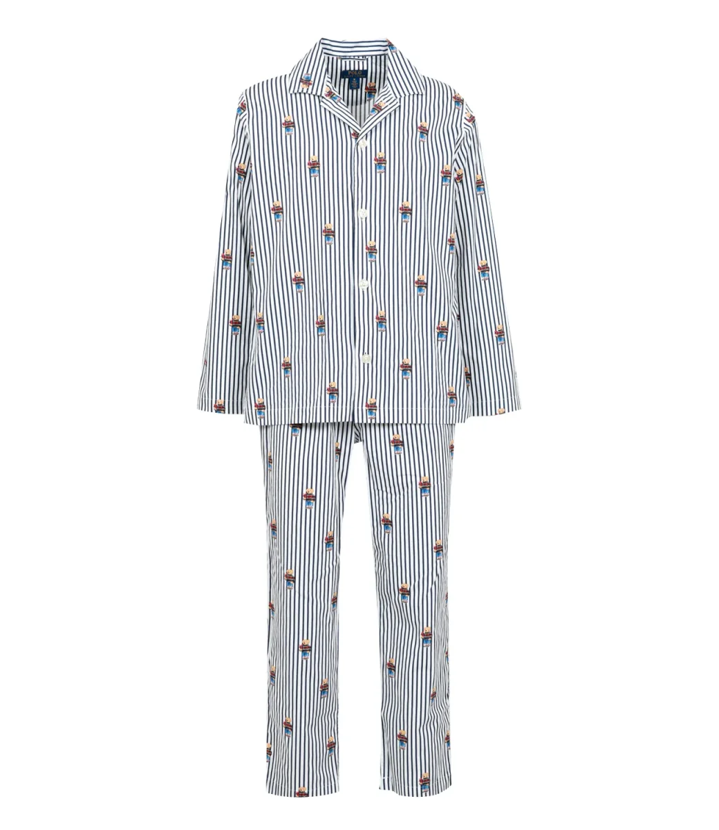 Pigiama Polo Ralph Lauren in cotone a righe e con il nostro iconico Polo Bear all over, camicia con maniche lunghe, con chiusura frontale con bottoni a vista, collo revers, pantalone con vita elasticizzata e coulisse , orlo dritto.