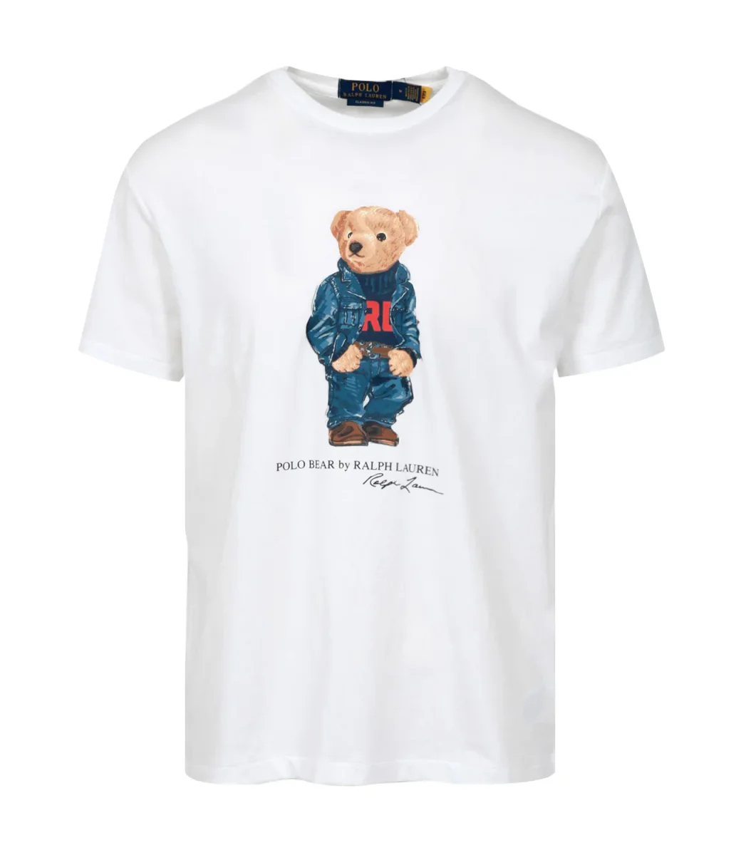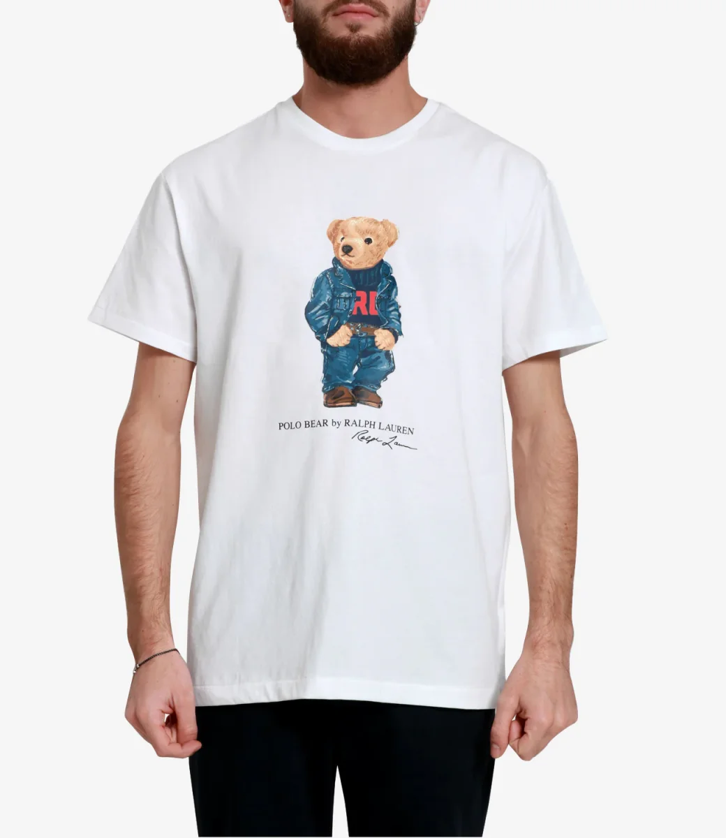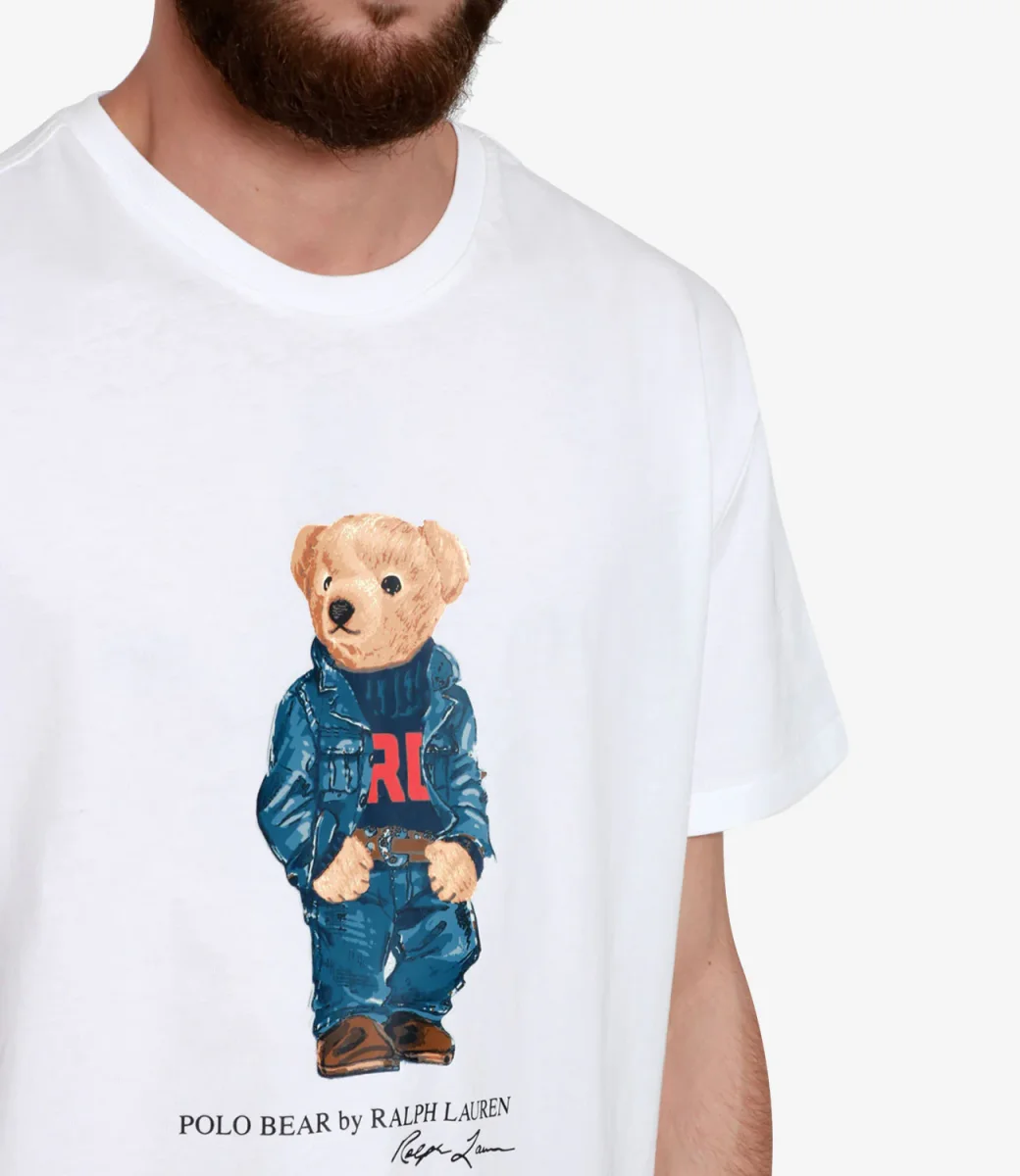 T-shirt Polo Ralph Lauren in morbido cotone, girocollo, maniche corte. Polo Bear e scritte “Polo Bear by Ralph Lauren” e “Ralph Lauren” stampato sul torace.