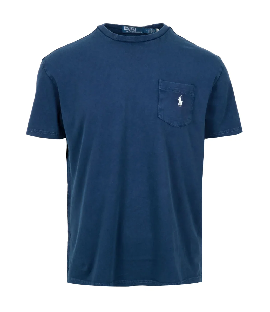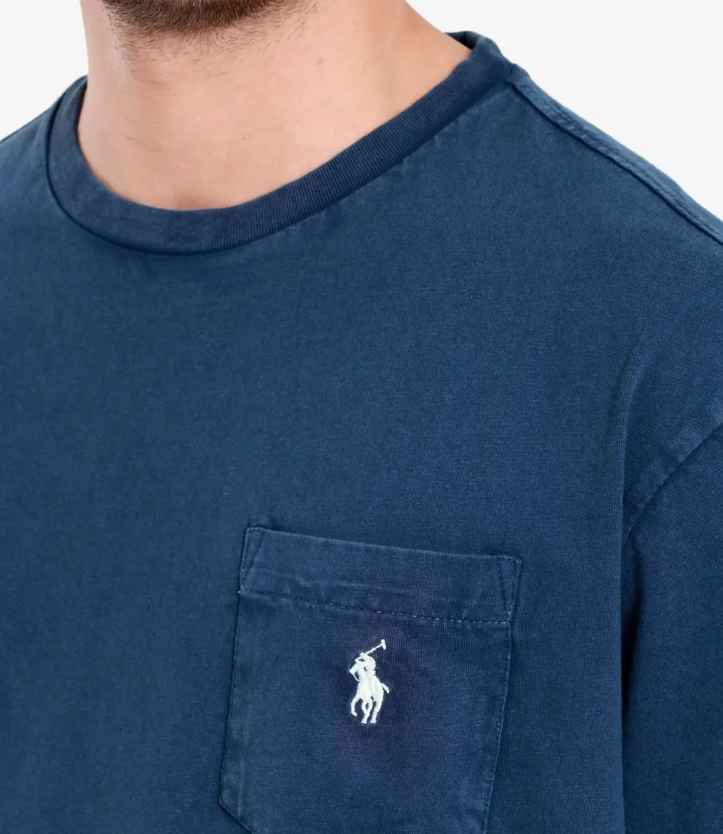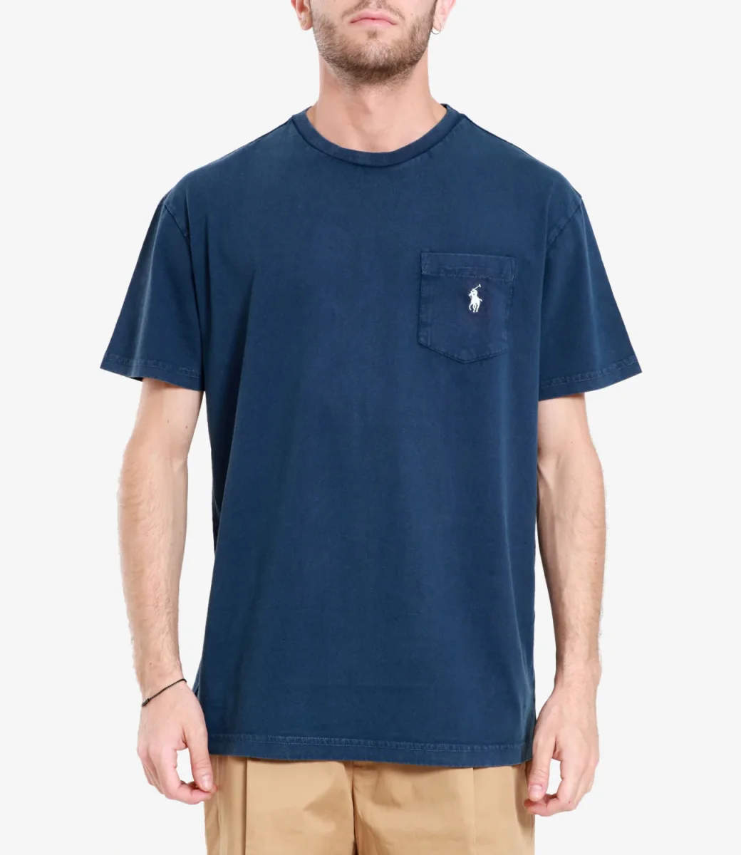T-Shirt Polo Ralph Lauren riproposta per questa stagione in leggero jersey di cotone e lino, con taschina applicata sul davanti, girocollo, maniche corte.
