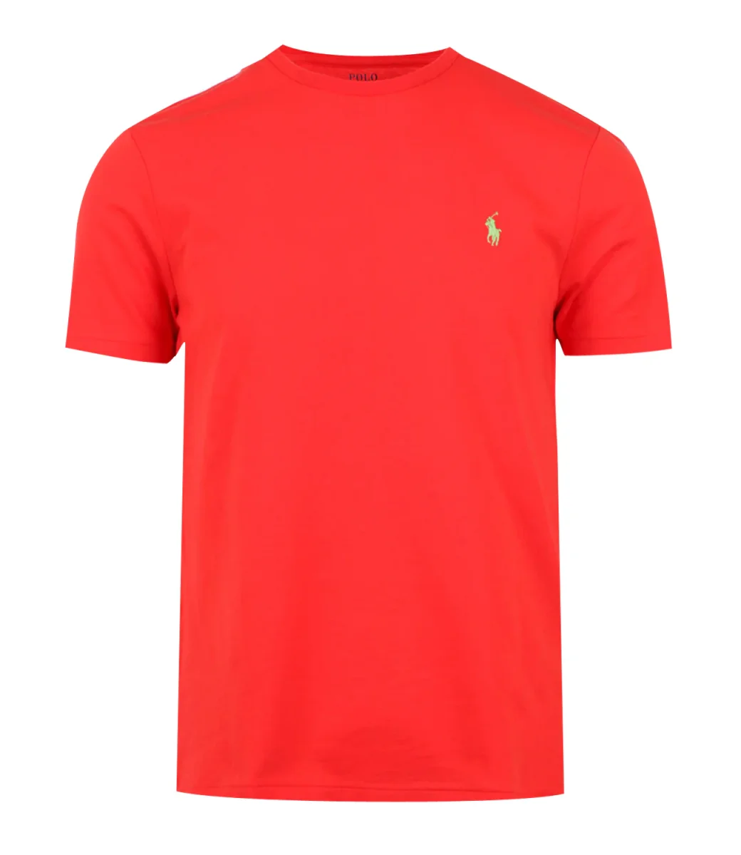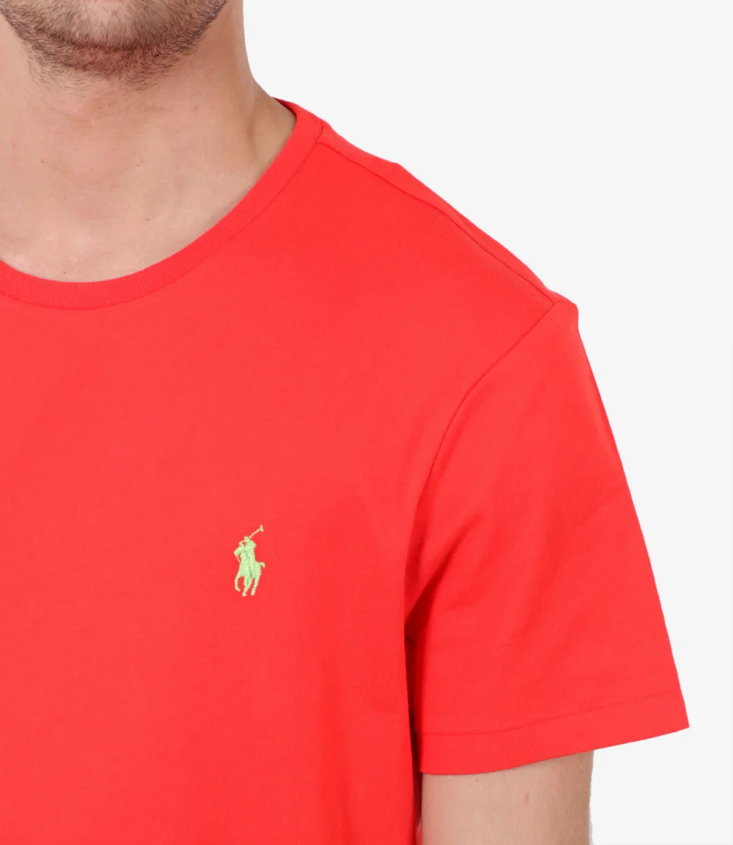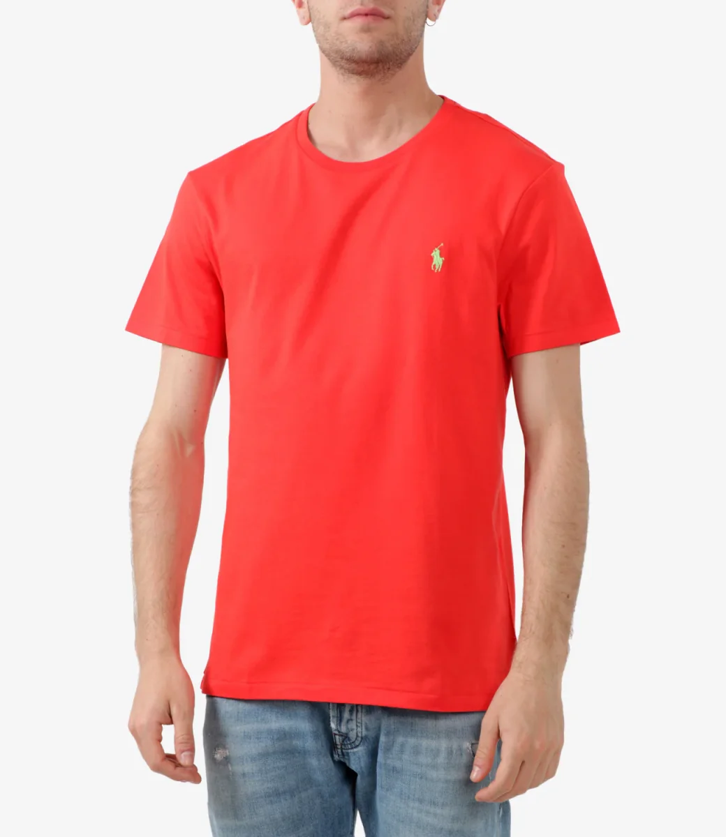 T-Shirt Polo Ralph Lauren in jersey di cotone corallo, precedentemente lavata per conferirle un aspetto autenticamente vissuto è un must have che diventerà uno dei modelli preferiti del guardaroba, girocollo, maniche corte, iconico Pony ricamato sul lato sinistro frontale, slim fit