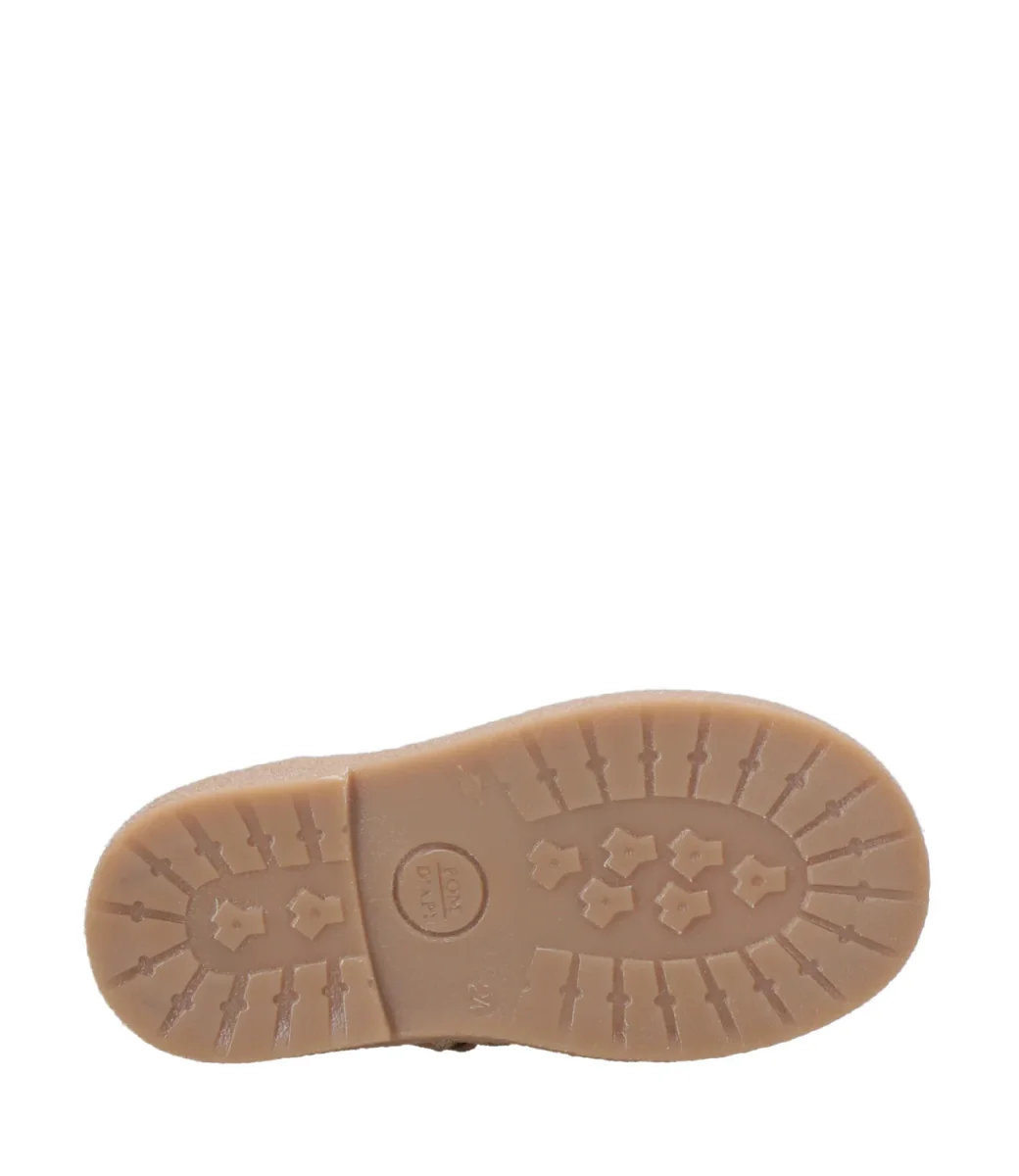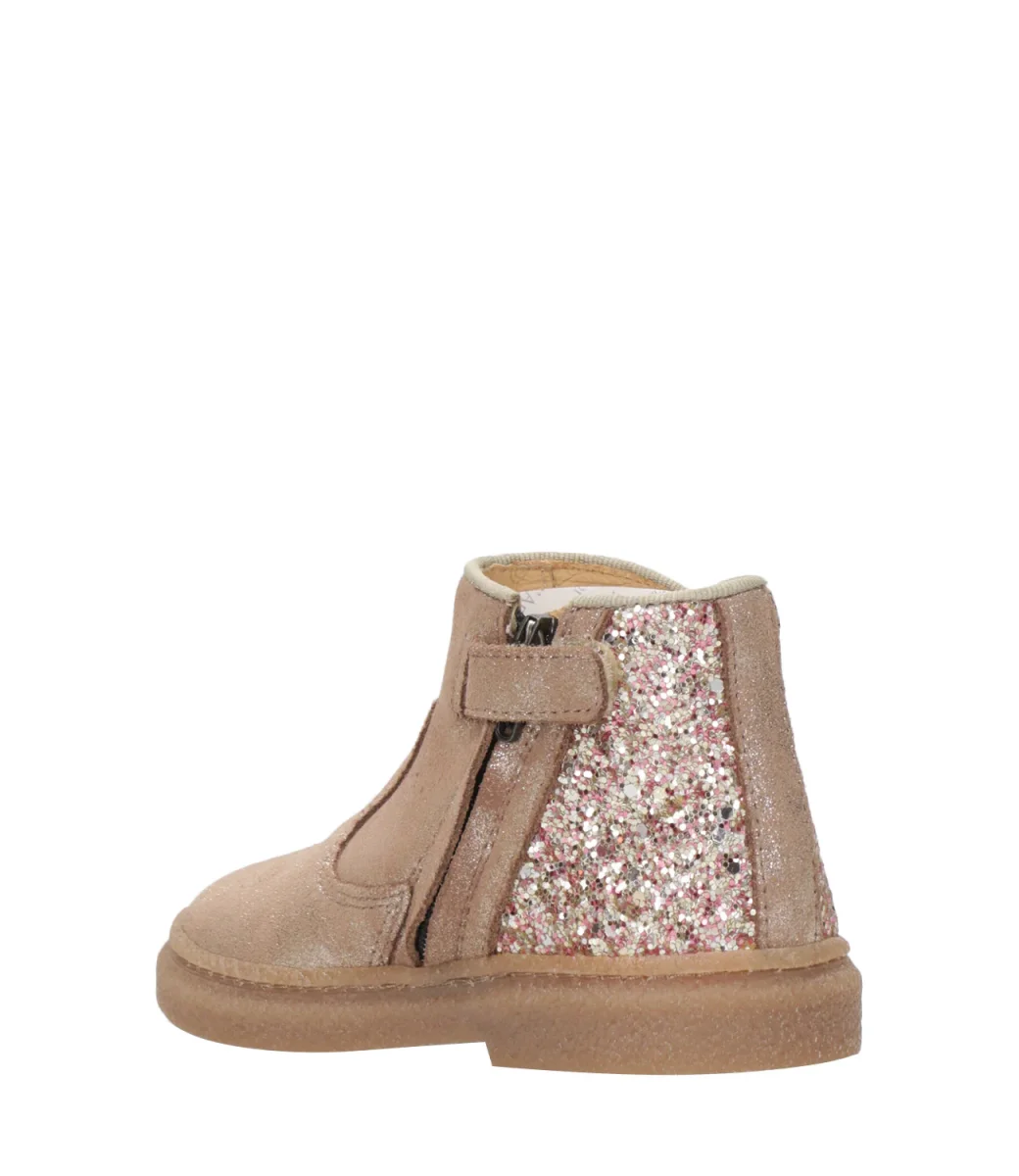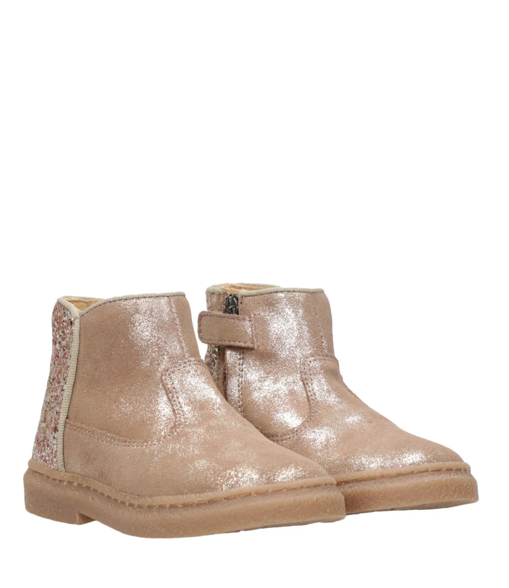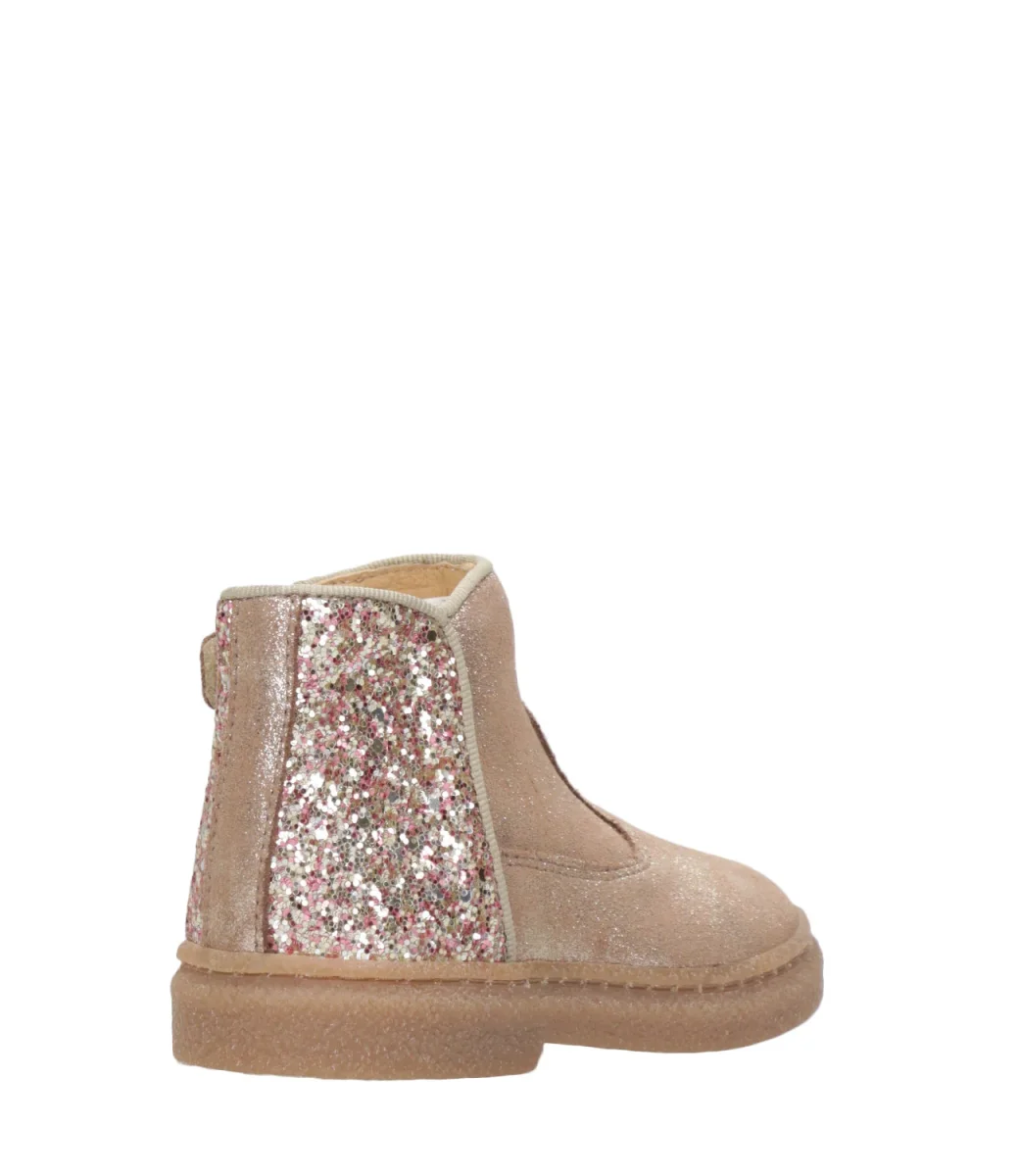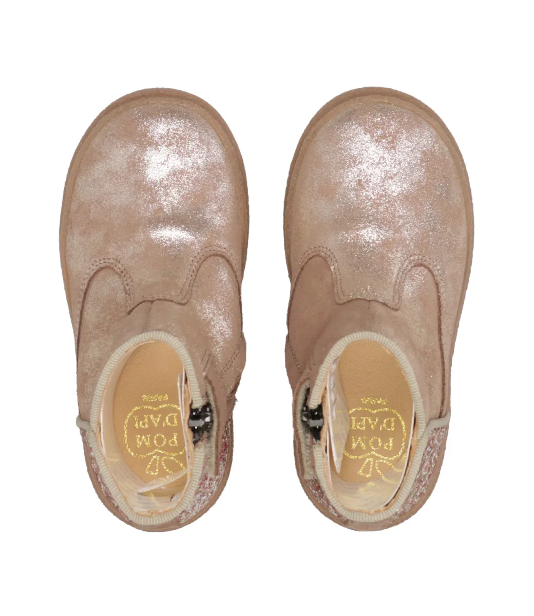 Scarpa Pom D’Api Trix in camoscio spalmato e tessuto glitterato, leggero e flessibile, progettato con materiali di qualità per il corretto sviluppo del piede, con tomaia alta per un sostegno ottimale della caviglia e del collo del piede ed è facile da indossare grazie alla cerniera interna.
