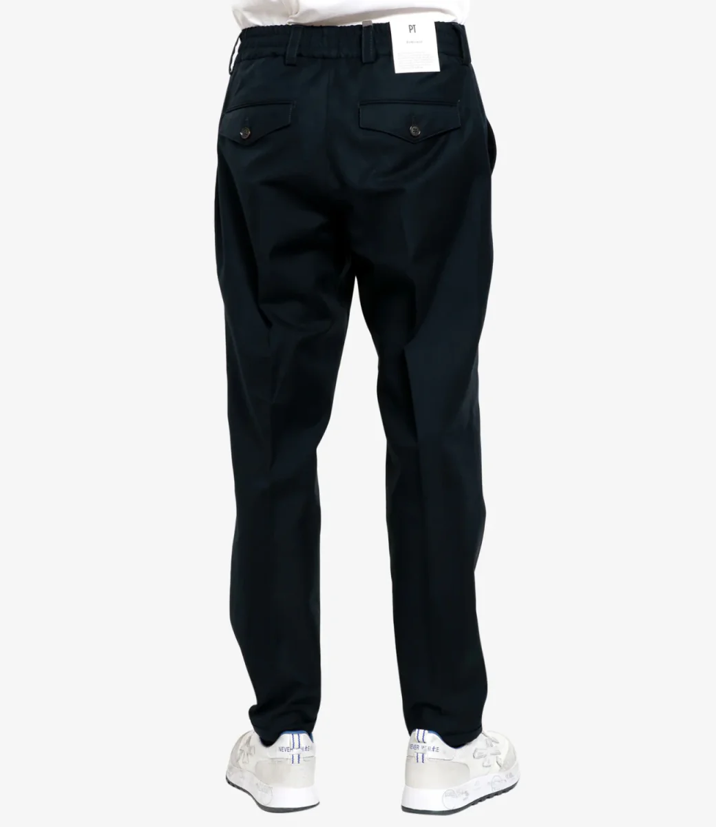Pantalone PT Torino in cotone, chiusura frontale con bottone e zip, passanti per cintura in vita, tasche a filo laterali, tasche posteriori con patta, orlo con risvolto.