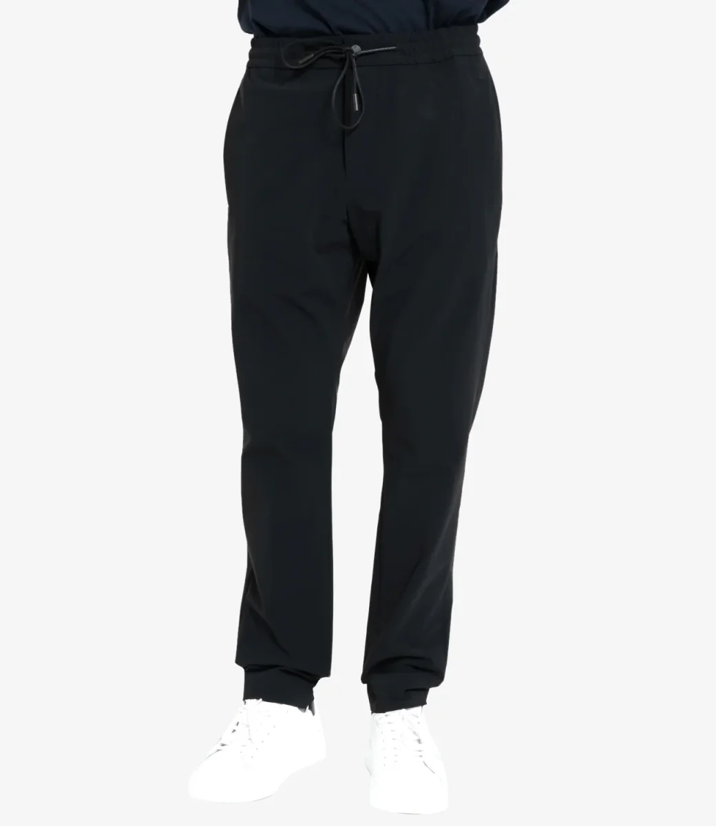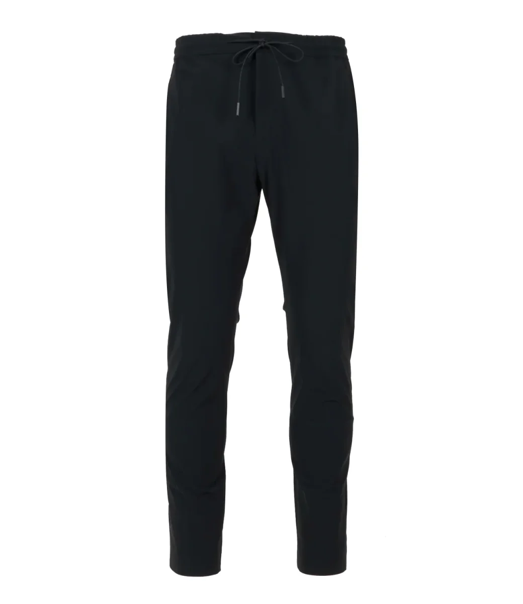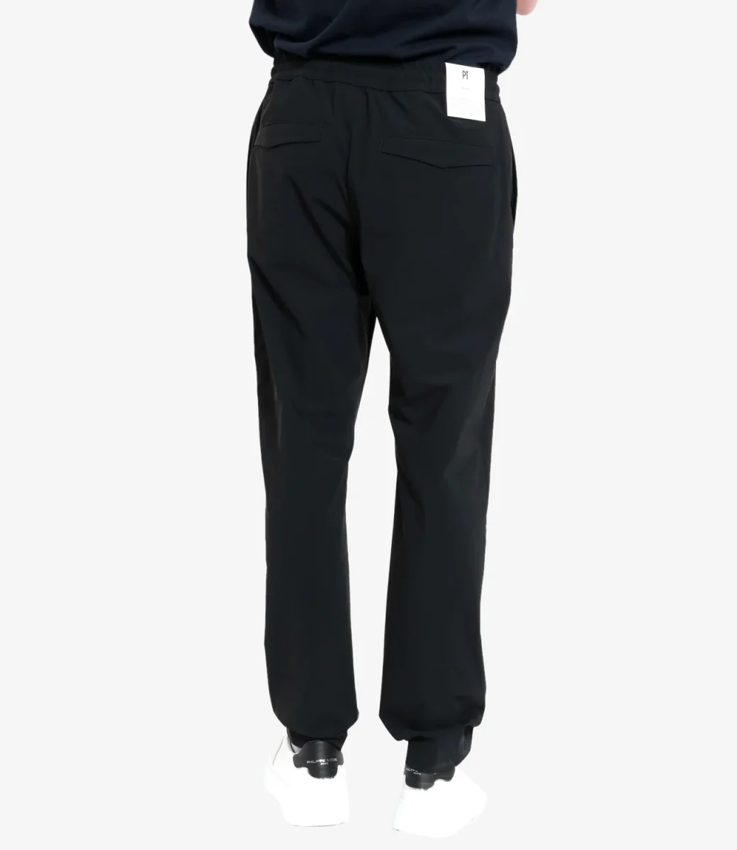 Pantalone PT Torino in tessuto tecnico con vita alta e coulisse in vita, tasche frontali e posteriori. Il modello è alto 1.75m ed indossa una 44.