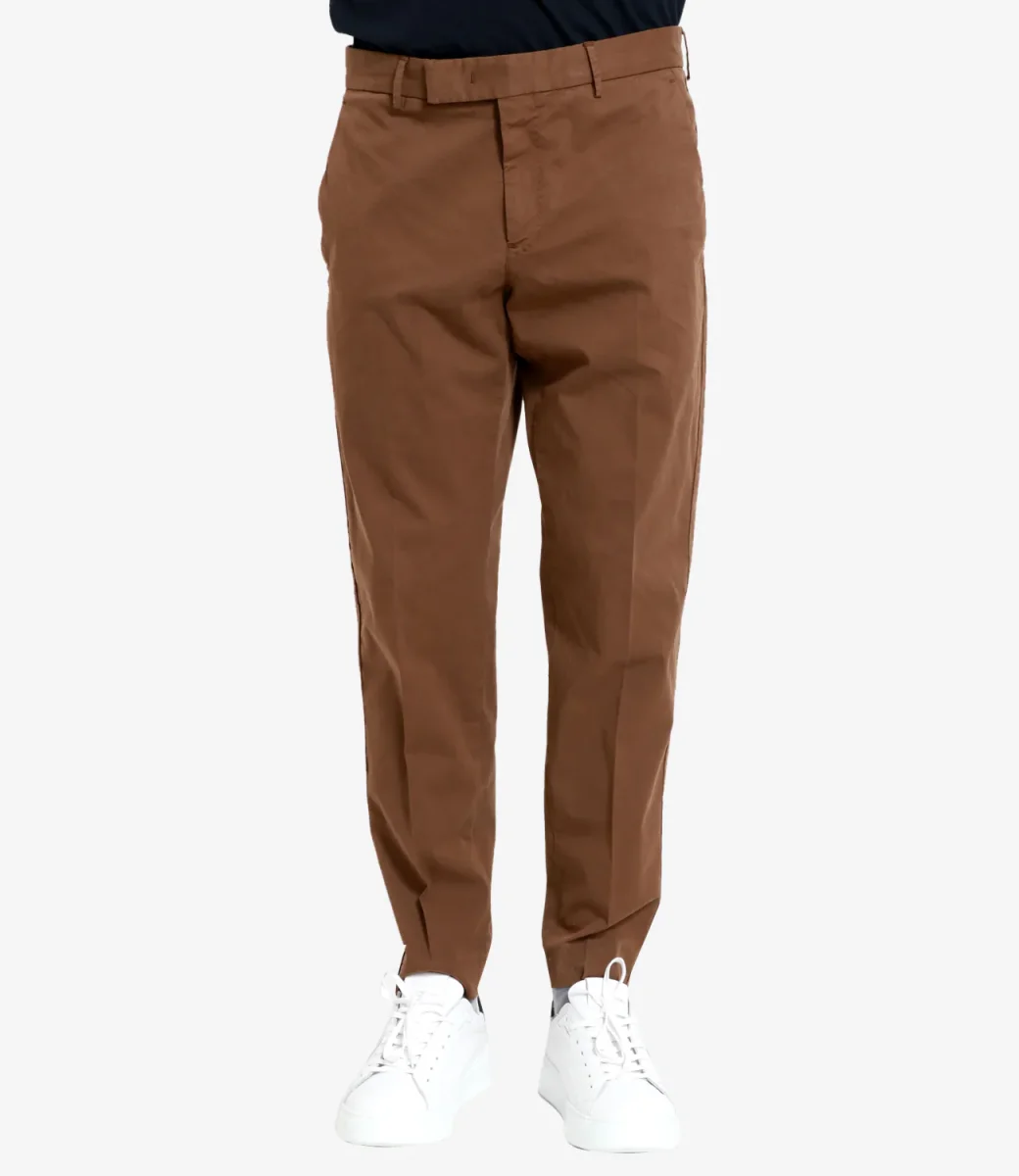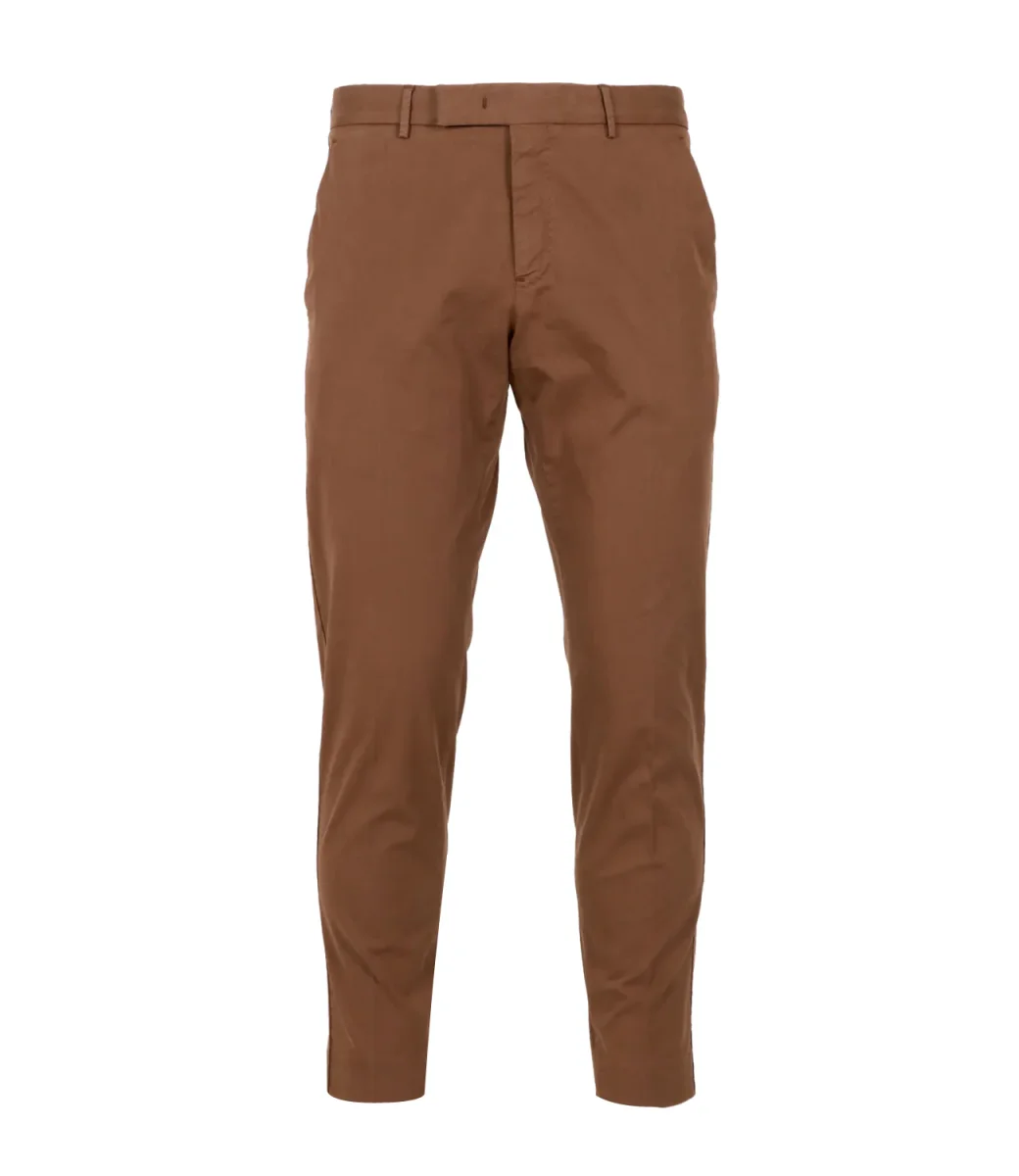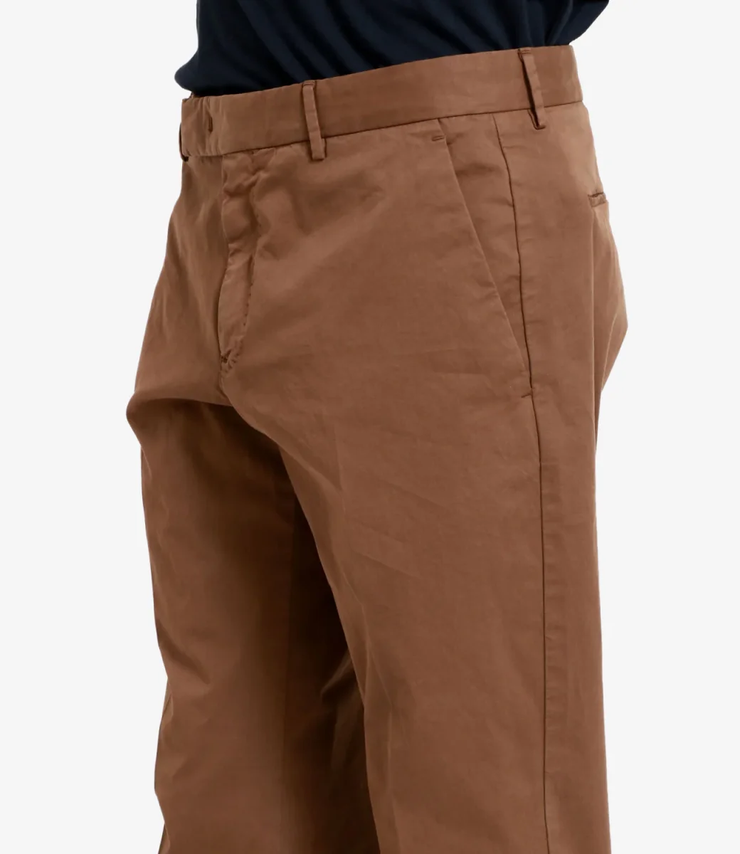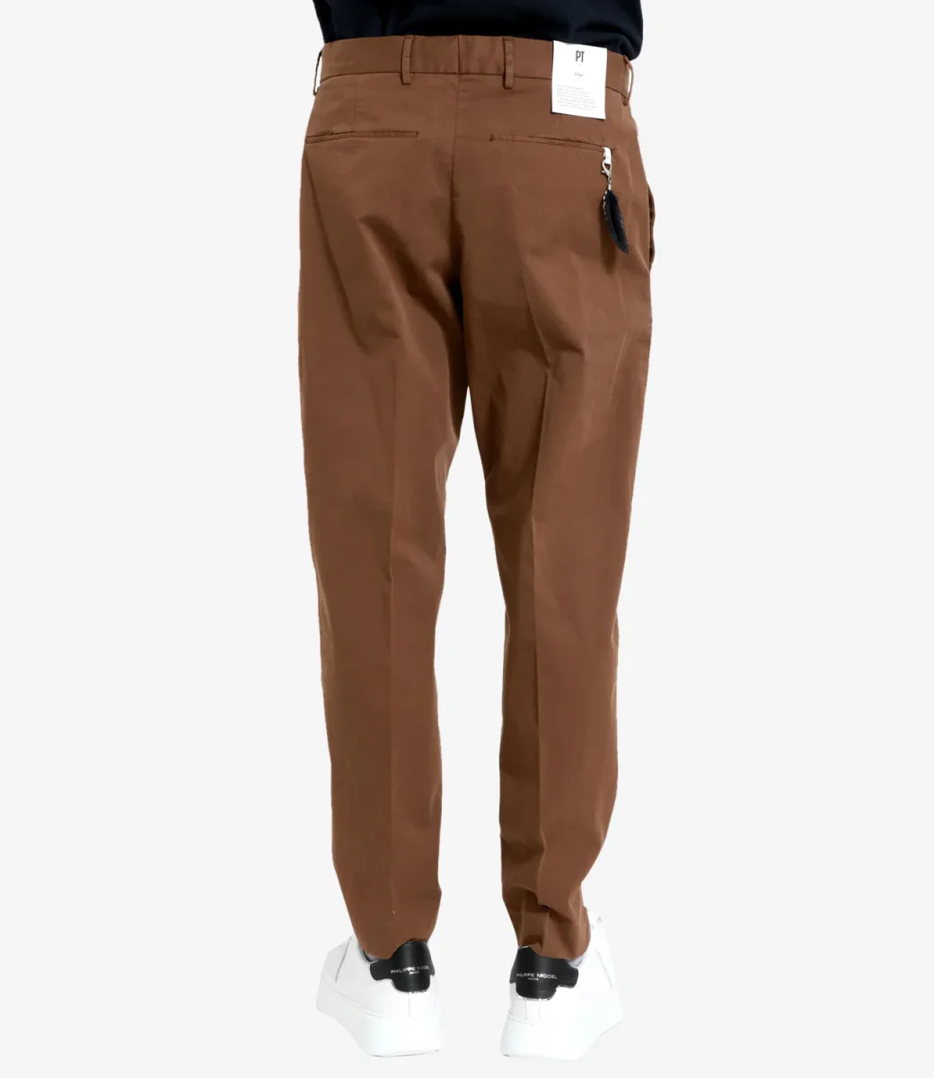 Pantalone PT Torino in cotone con chiusura con zip e bottone, tasche frontali e taschini posteriori e vita regolare. Il modello è alto 1.75 ed indossa una 44.
