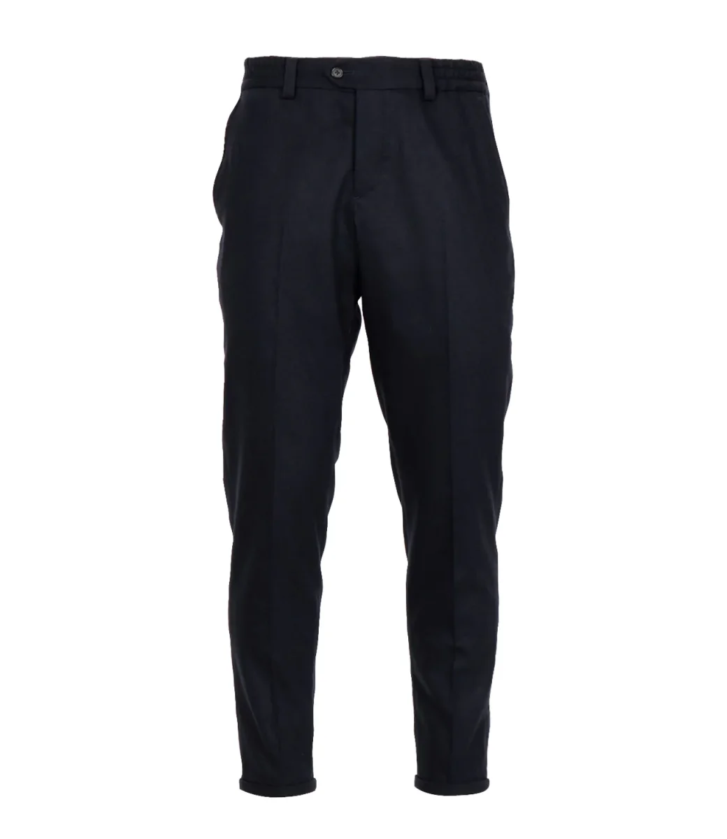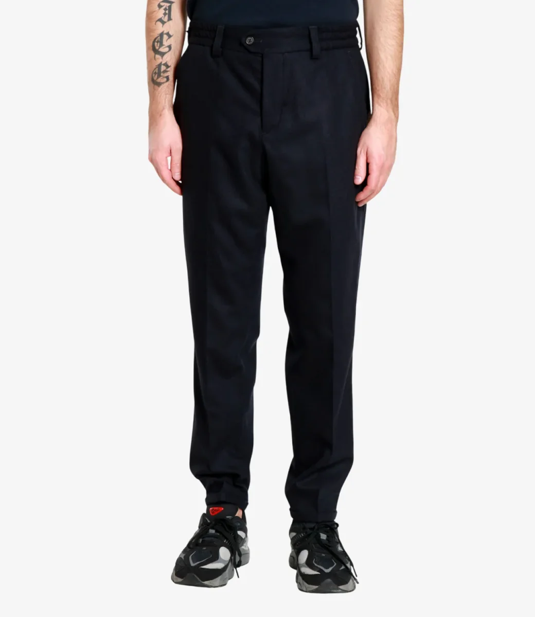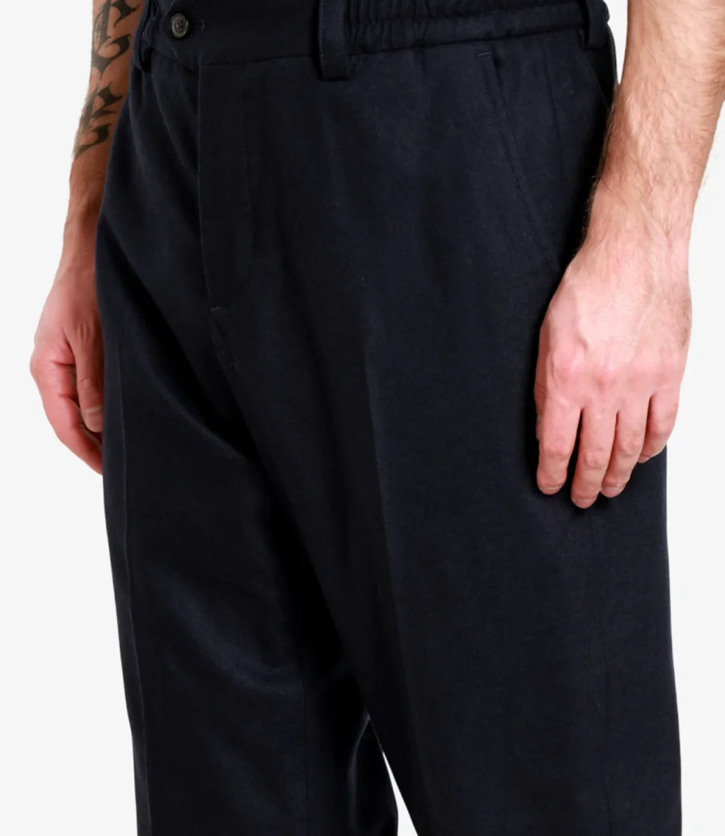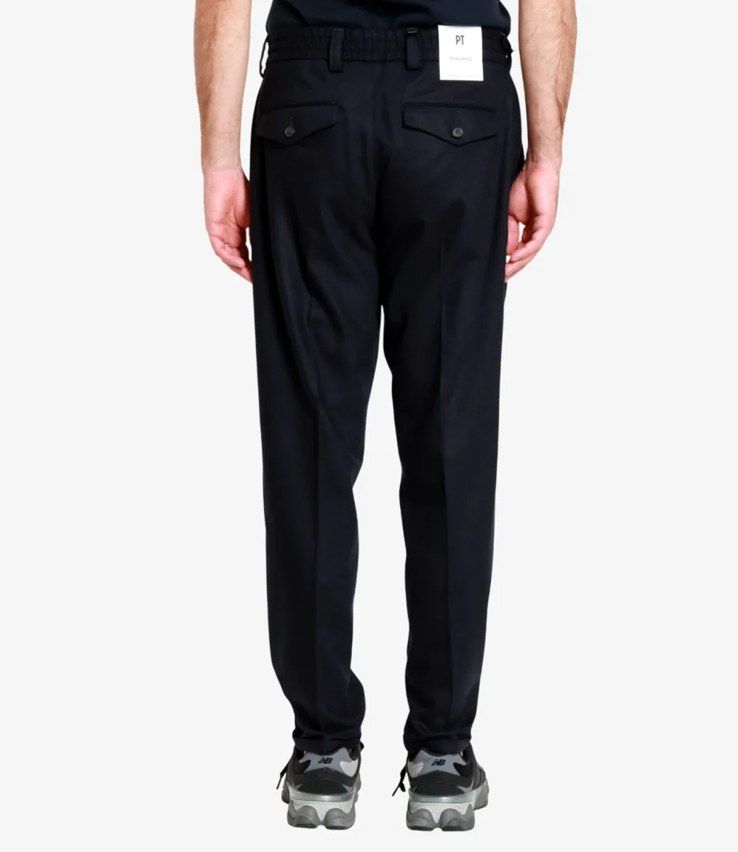 Pantalone PT Torino realizzato flanella di lana e cashmere. Vita regolare elasticizzata con passanti, chiusura con bottone spostato e zip con patta, piega stirata dal design sartoriale. tasche alla francese sul davanti, sul retro tasche con patta e bottone.