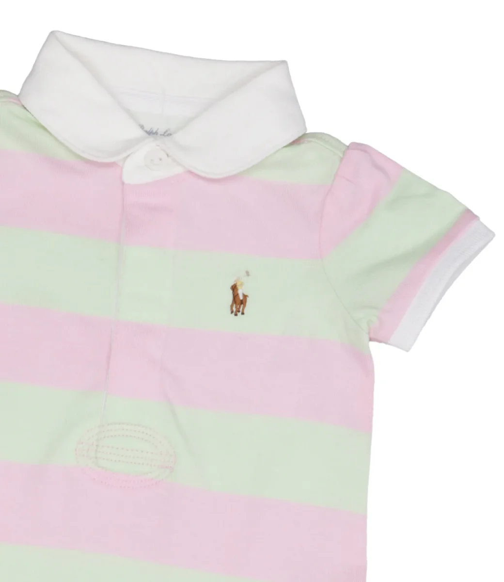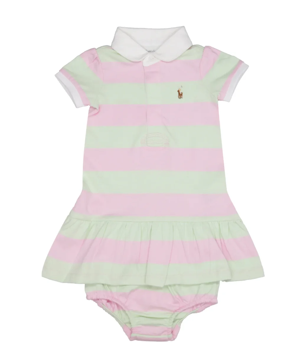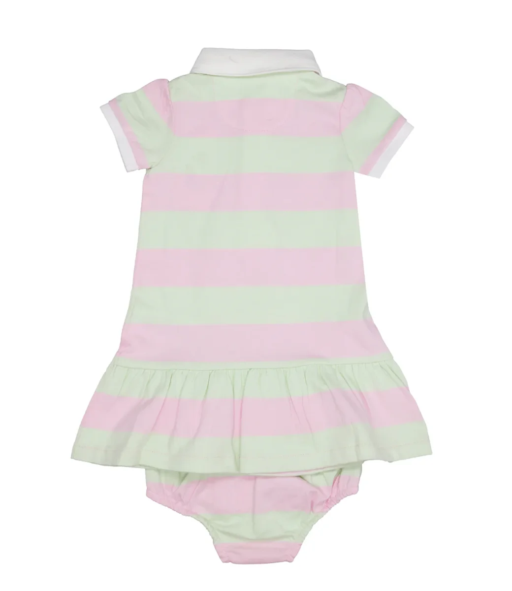 Abito Ralph Lauren Childrenswear in cotone con fantasia a righe orizzontali. Collo a polo, manica corta a sbuffo, chiusura frontale con bottoni, iconico logo ricamato, silhouette a trapezio con balza al fondo. La culotte coordinata completa l’outfit.