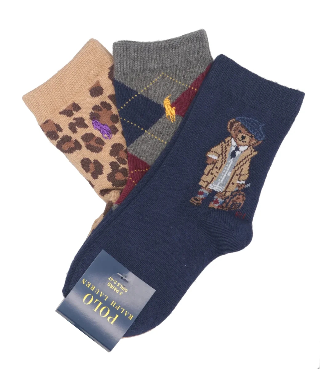Calzini Ralph Lauren Childrenswear in misto cotone con bordi a coste, fantasie con Polo Bear, scozzese con esclusivo pony ricamato e motivo leopardato, tallone preformato. Confezione 3paia